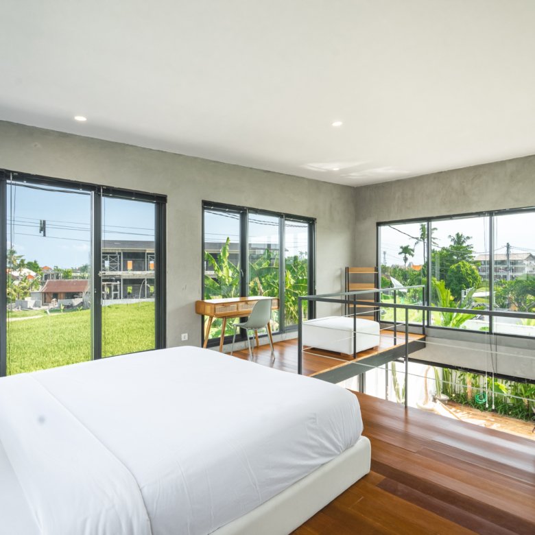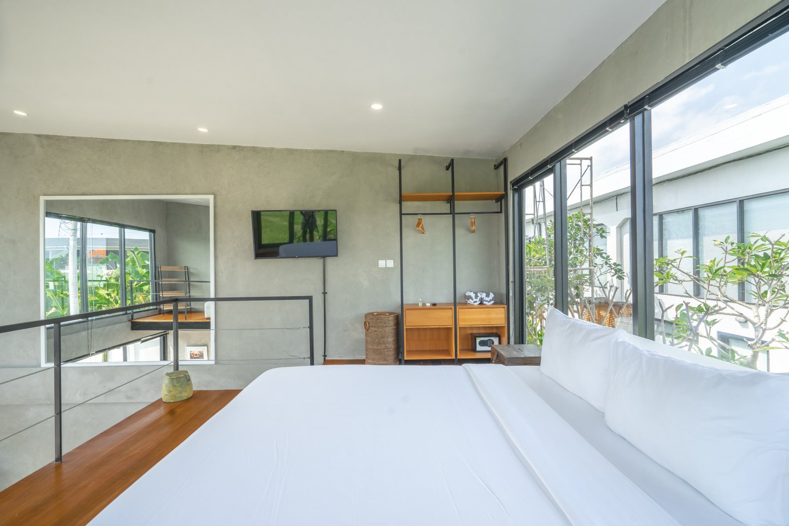This panoramic-type villa in Canggu Babakan is available for monthly and yearly rent—just ask for current availability. Designed in a stylish loft mezzanine concept, the villa offers serene views of the pool and surrounding rice fields. Located in a peaceful yet strategic area, it’s close to Fine by SatuSatuCoffee and only a 10-minute bike ride to Batu Bolong Beach, making it a perfect blend of comfort, style, and convenience for your Bali stay.
