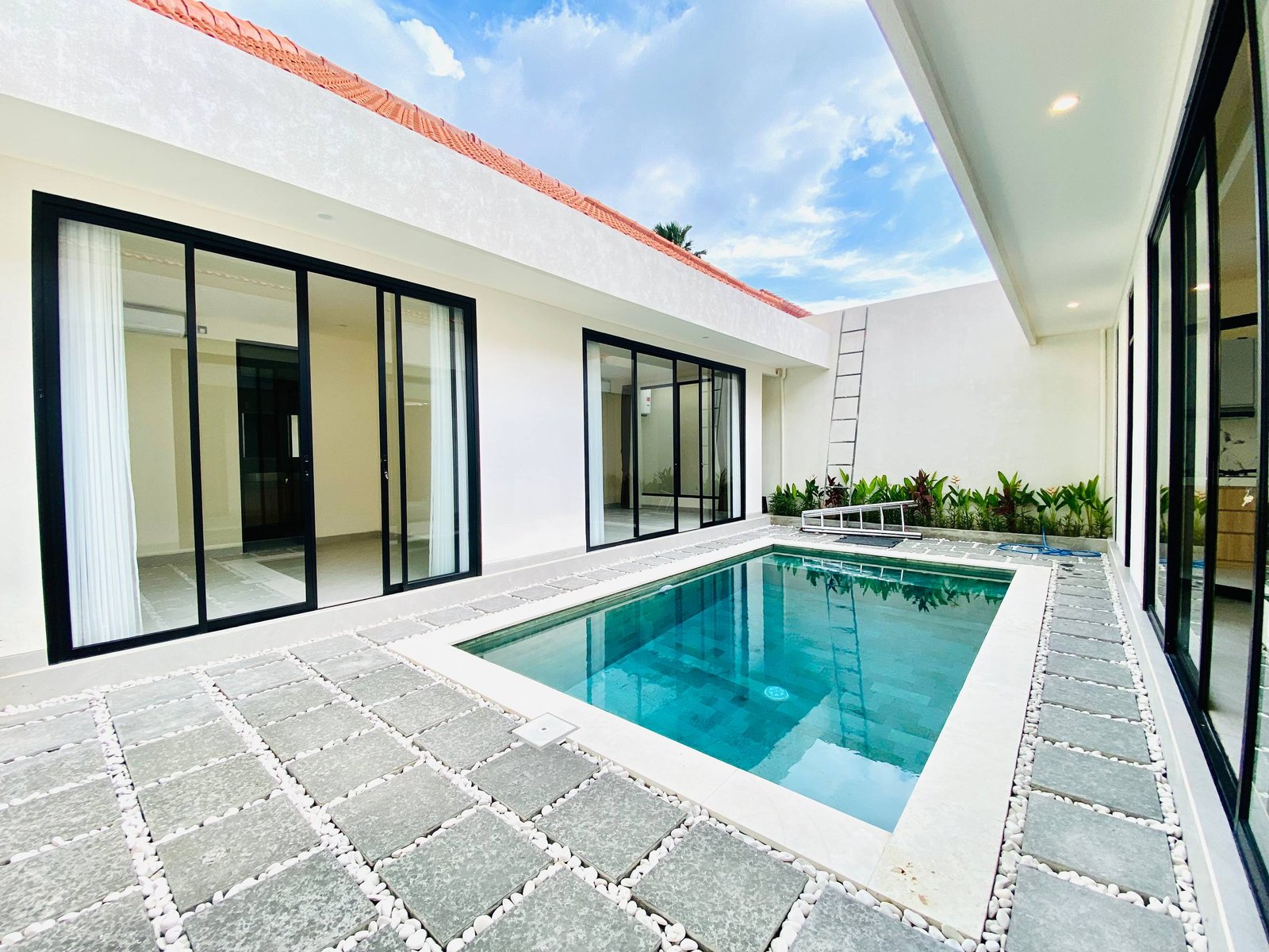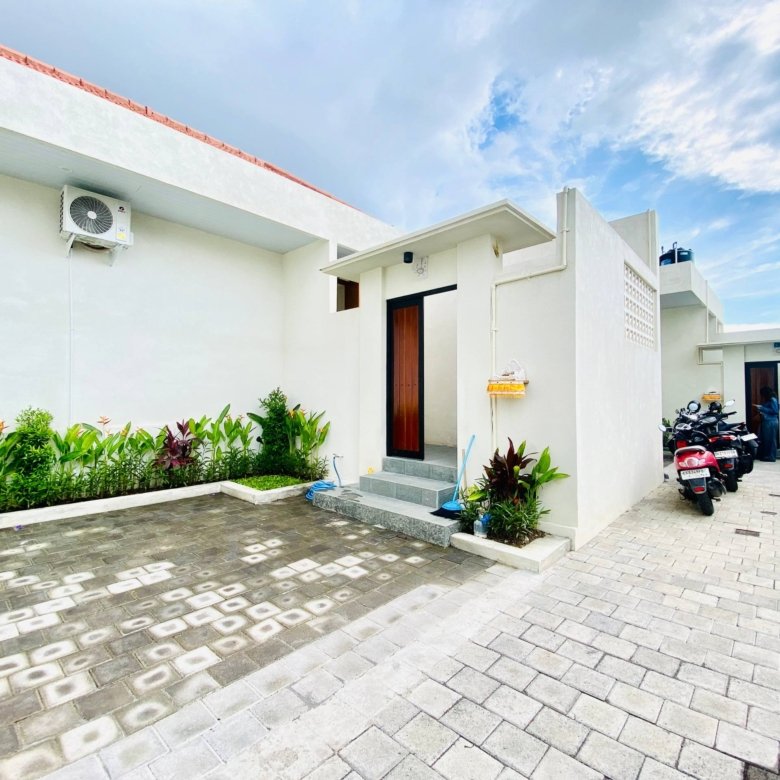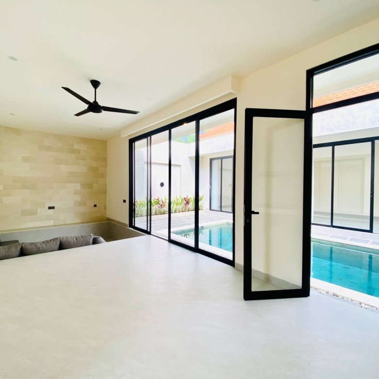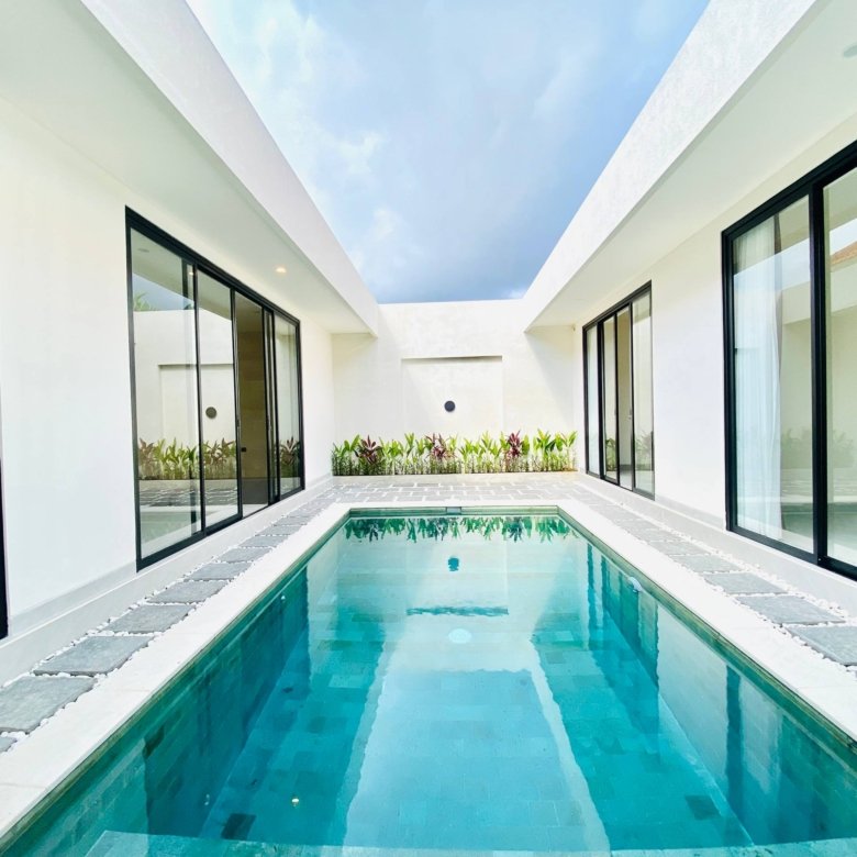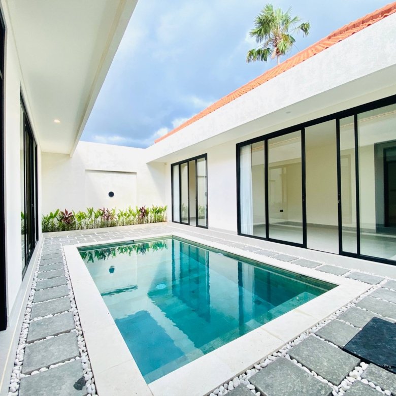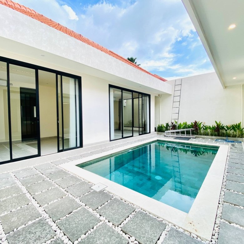 This is Villa B, a modern villa in Umalas Bumbak available for yearly rent, offering a pool view. It is situated in a strategic location in one of the most popular areas for tourists and expats, near various cafes and bars such as Plumber Arms Bar, Bali Buda, and Seketei Sushi. It is conveniently only 4 minutes to Berawa, 7 minutes to Canggu, 7 minutes to Petitenget, and 30 minutes to the Airport. Subleasing is possible.