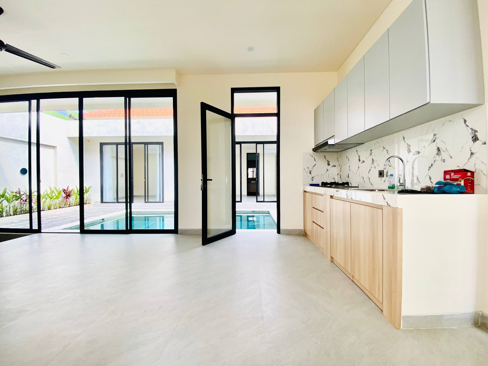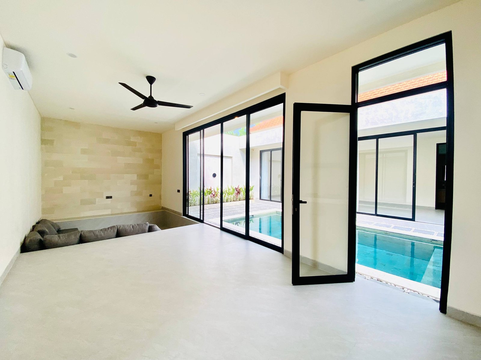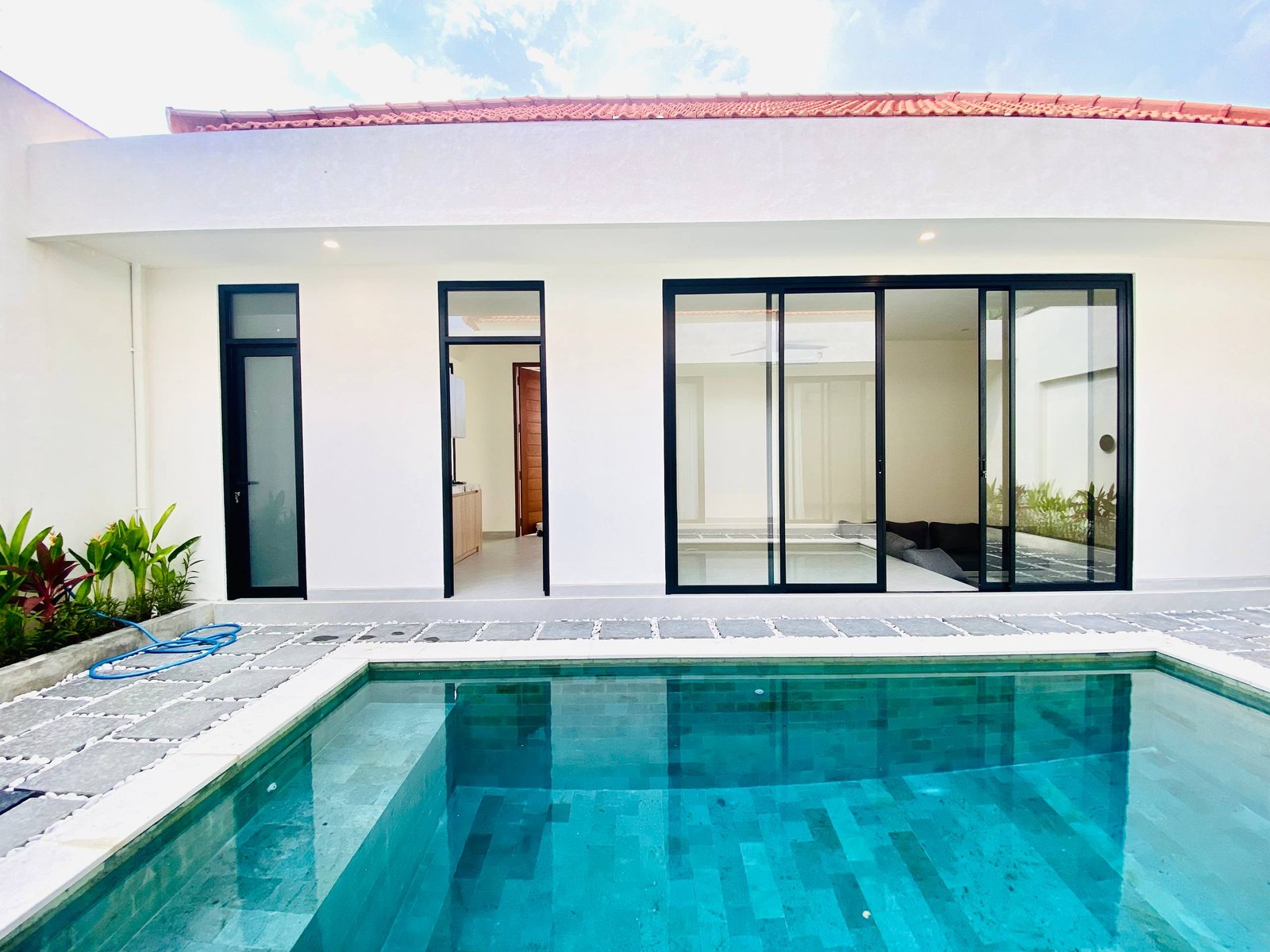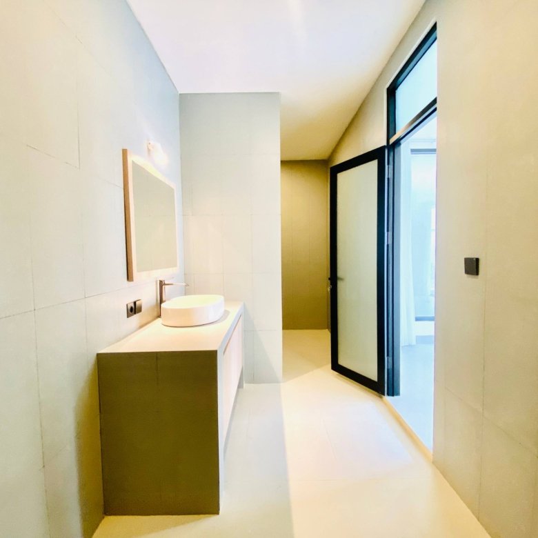 This is Villa B, a modern villa in Umalas Bumbak available for yearly rent, offering a pool view. It is situated in a strategic location in one of the most popular areas for tourists and expats, near various cafes and bars such as Plumber Arms Bar, Bali Buda, and Seketei Sushi. It is conveniently only 4 minutes to Berawa, 7 minutes to Canggu, 7 minutes to Petitenget, and 30 minutes to the Airport. Subleasing is possible.