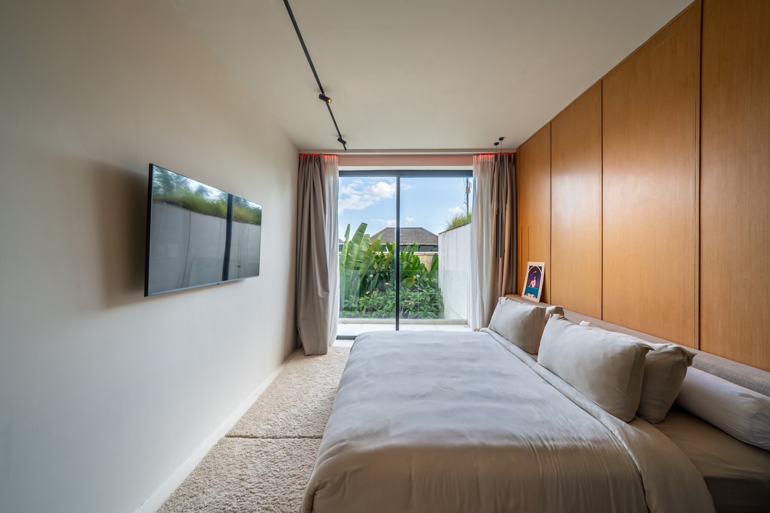This modern luxury villa in the Canggu, Padonan area is available for monthly and yearly rent and is ready for immediate occupancy, featuring a pool view. It is conveniently situated near Element Kopi & Red Bean Tibubeneng, and is just a 10-minute bike ride to both Echo Beach and La Brisa.