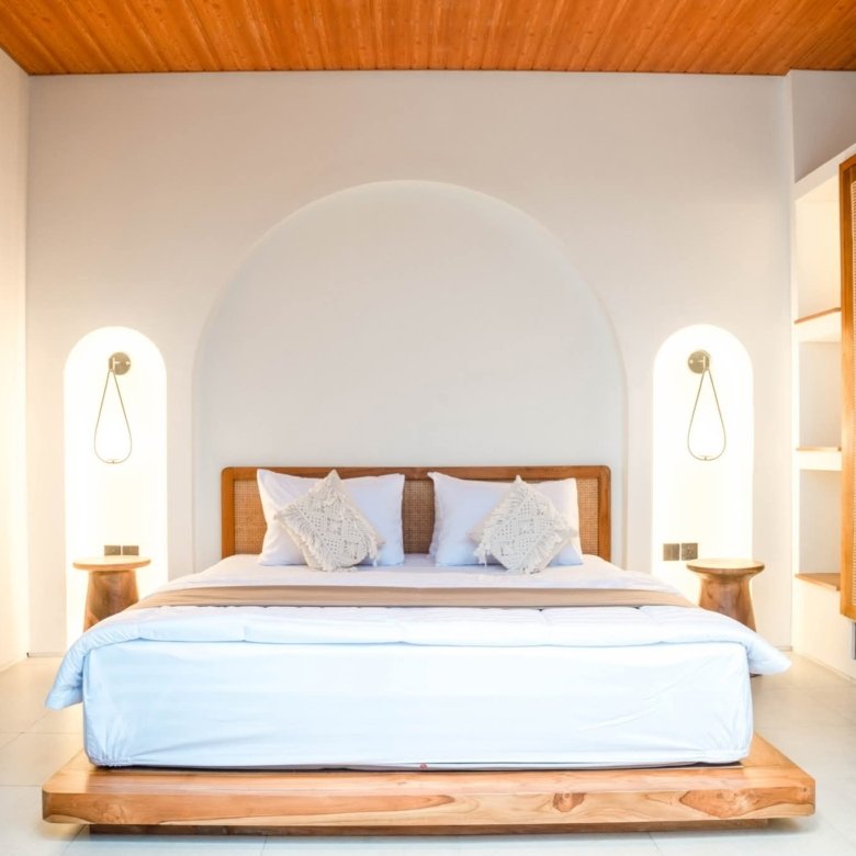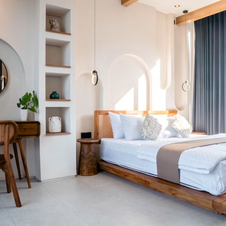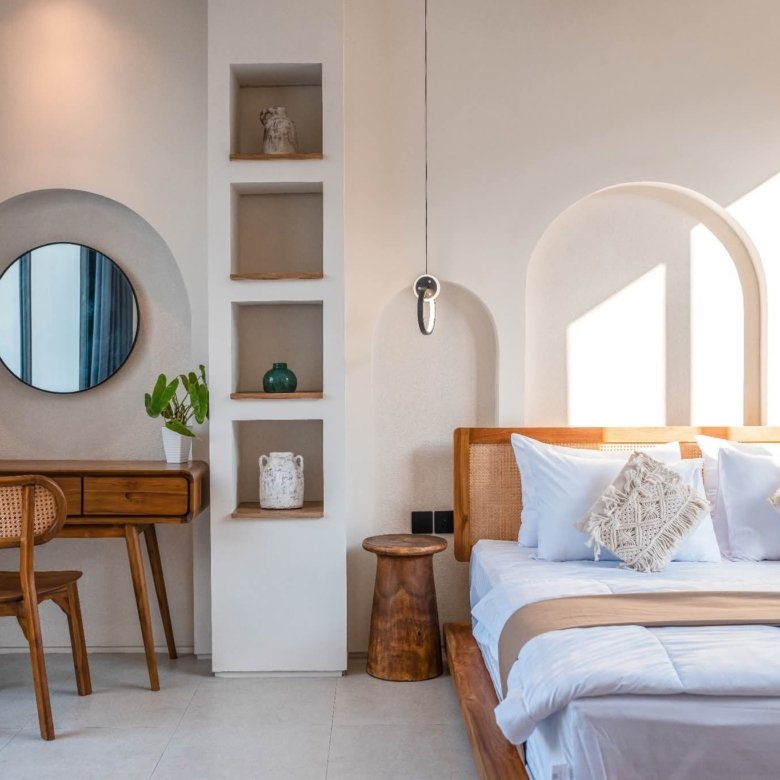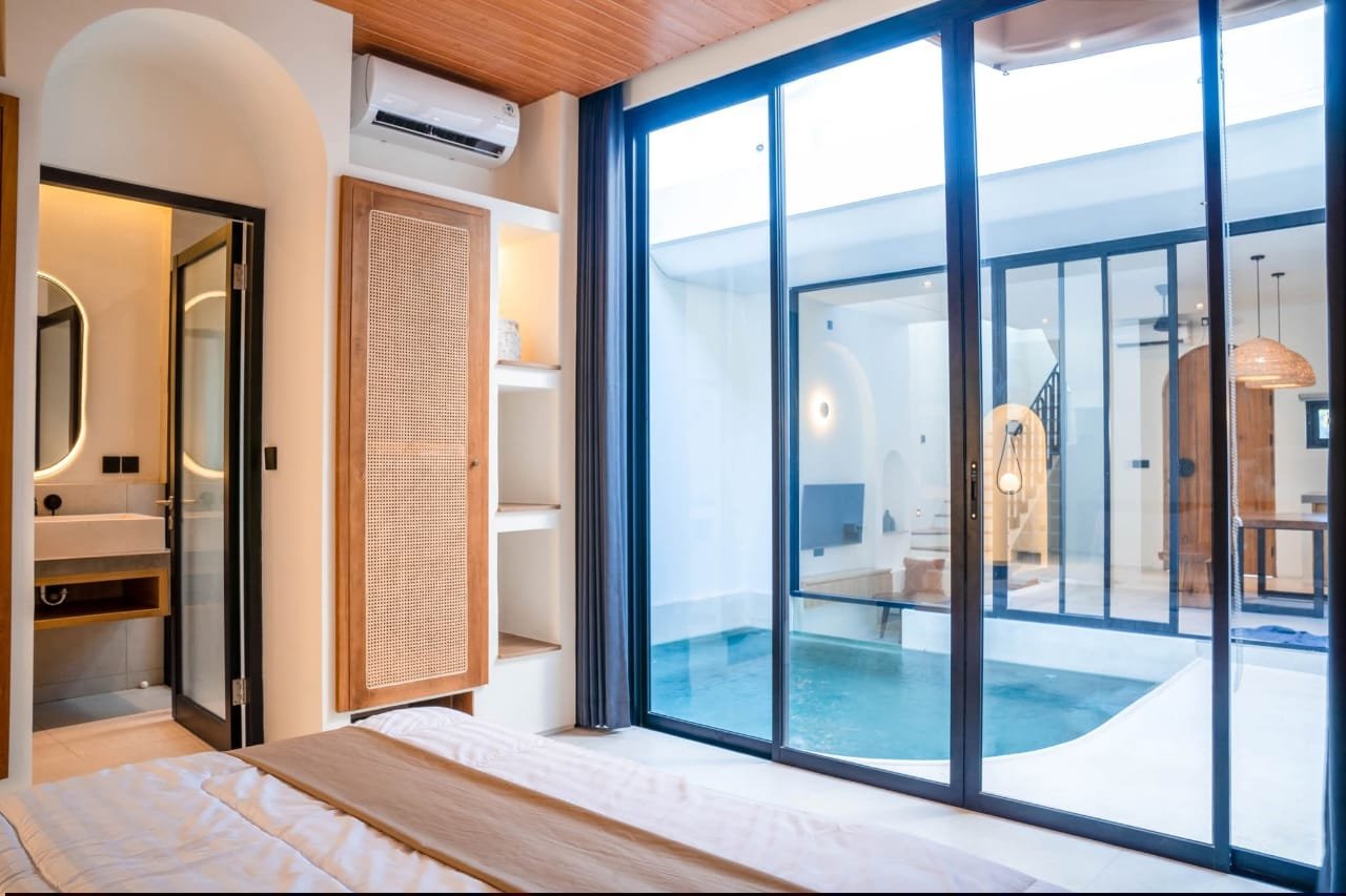 This Greece Mediterranean and minimalistic villa, known as Villa E, is part of a complex featuring six units with identical layouts and is now ready for monthly or yearly rent in Pererenan. The property is located in a prime area surrounded by popular spots like Elite Fit Gym, Obsidian, and various cafes and restaurants, while Pererenan Beach is just 6 minutes away.