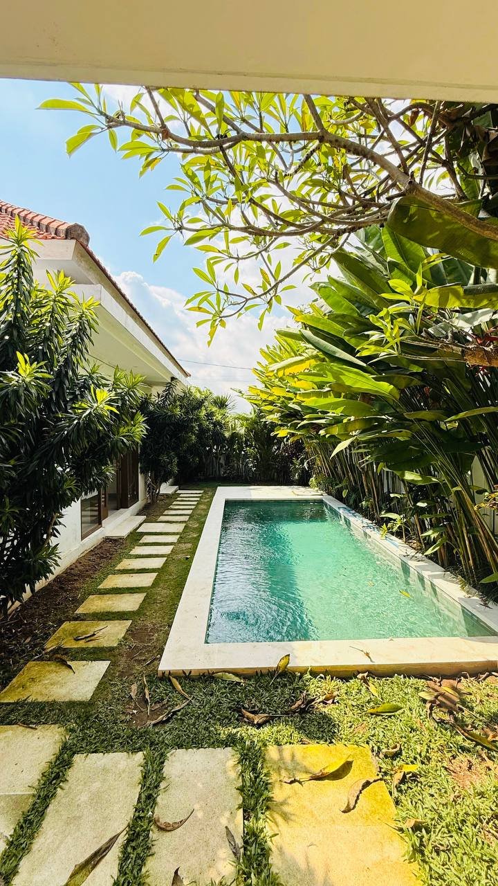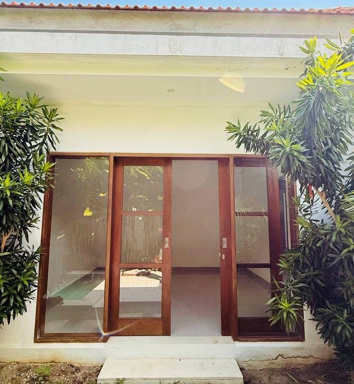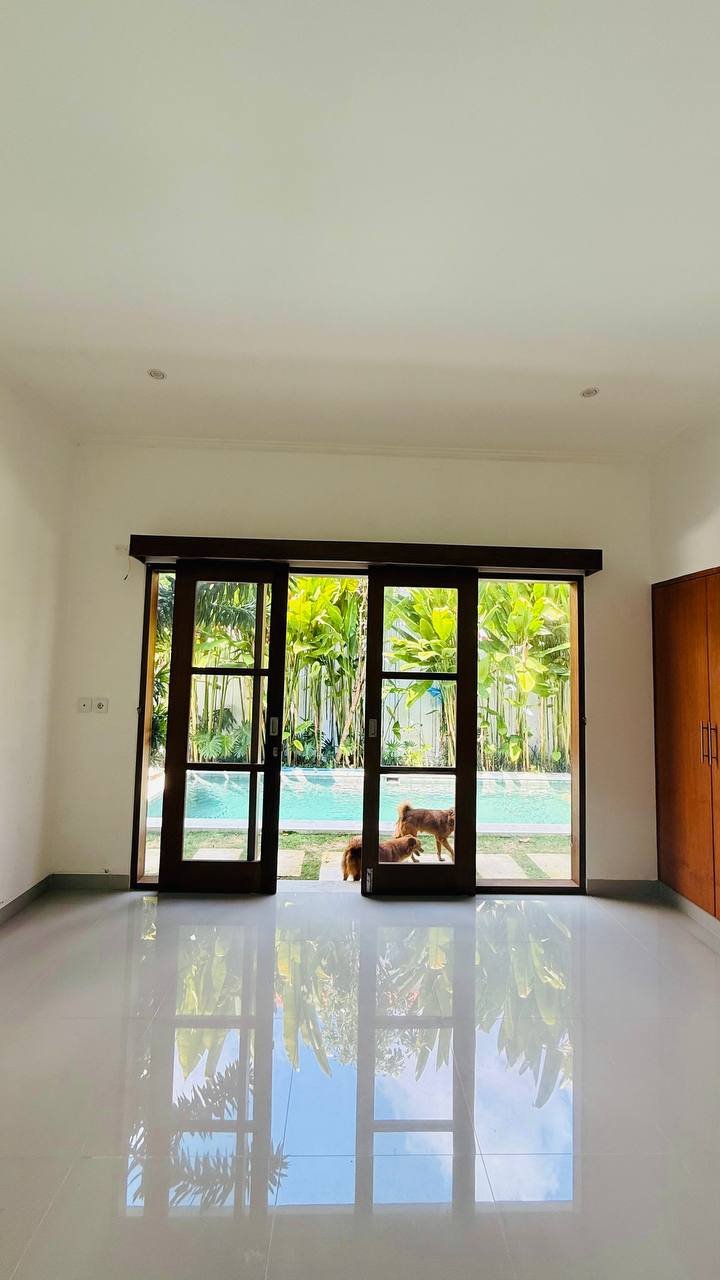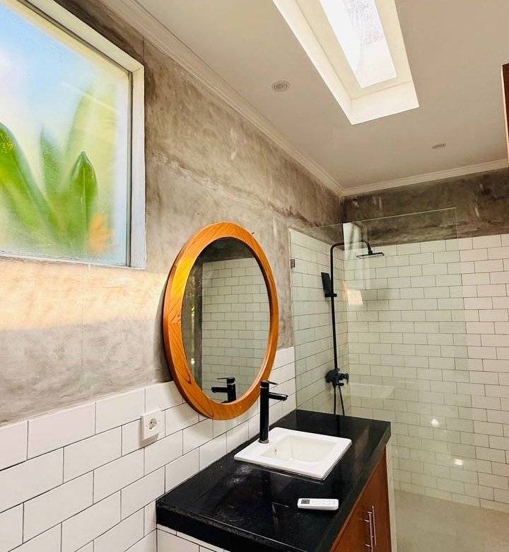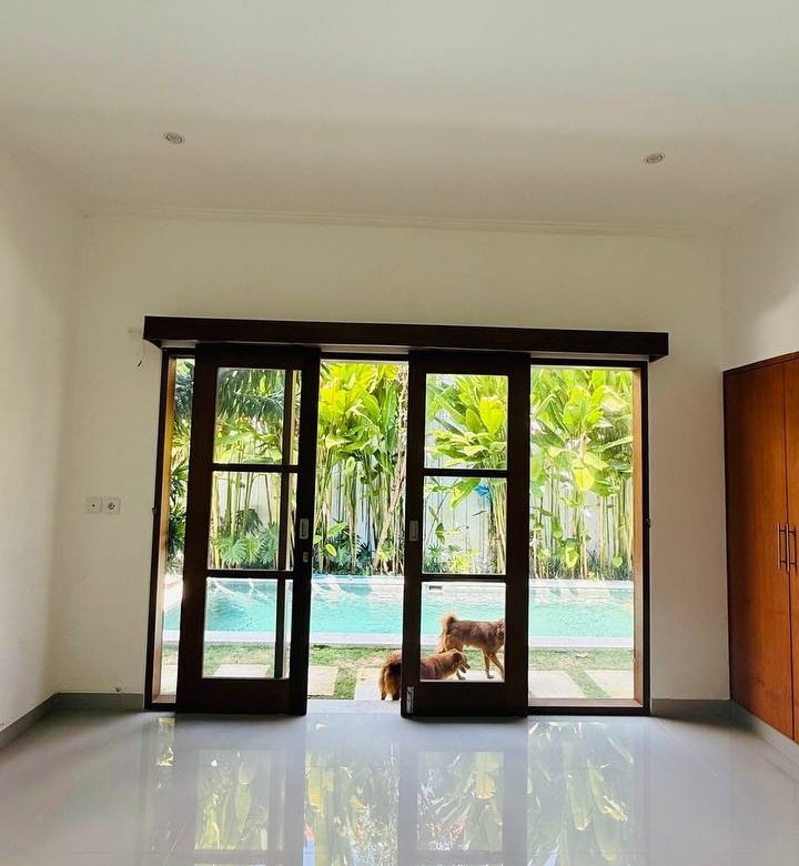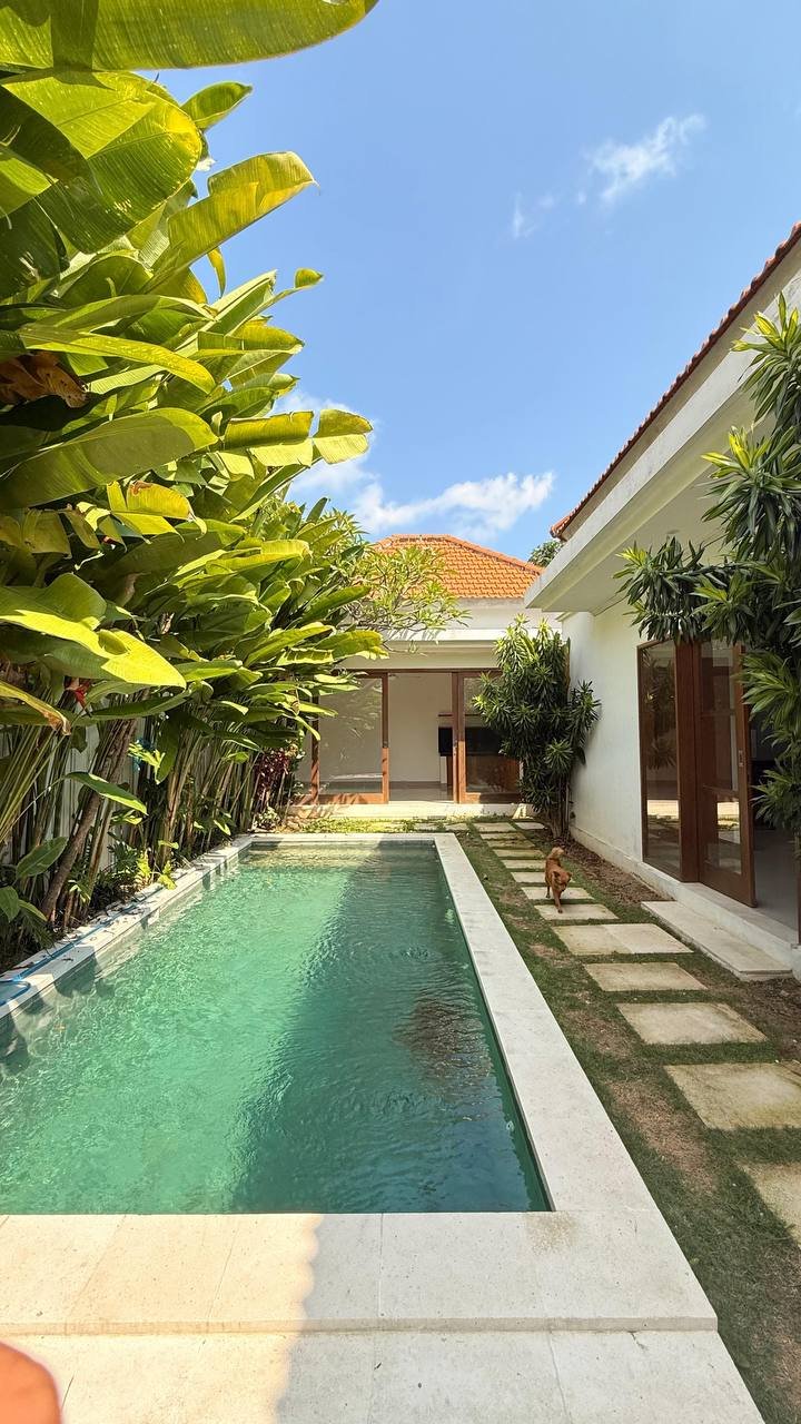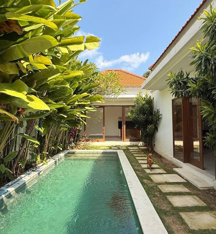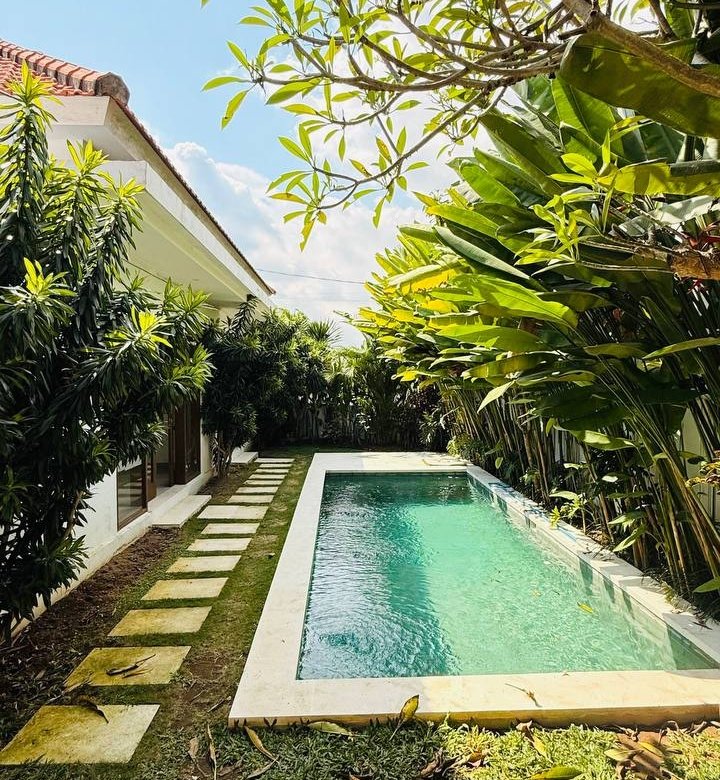 This modern villa in the Pererenan Tiying Tutul area is available for yearly rent and is ready for immediate occupancy. It features a pleasant pool view and is conveniently located near Nude Caffe, just a 9-minute drive to Pererenan Beach.