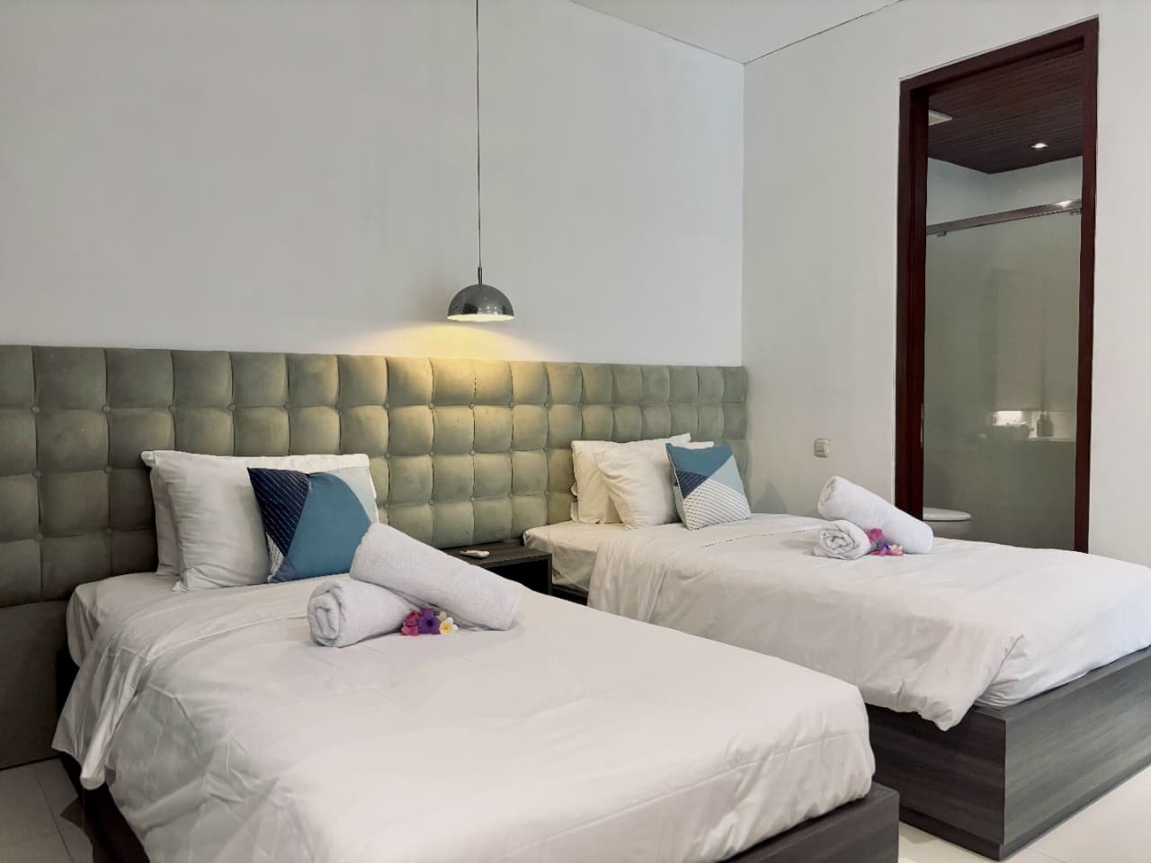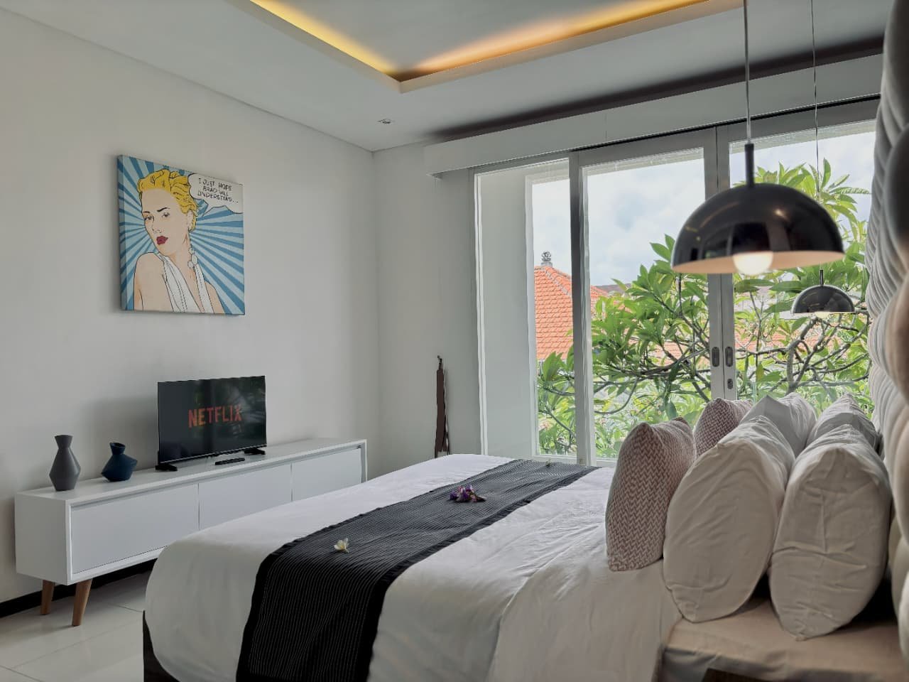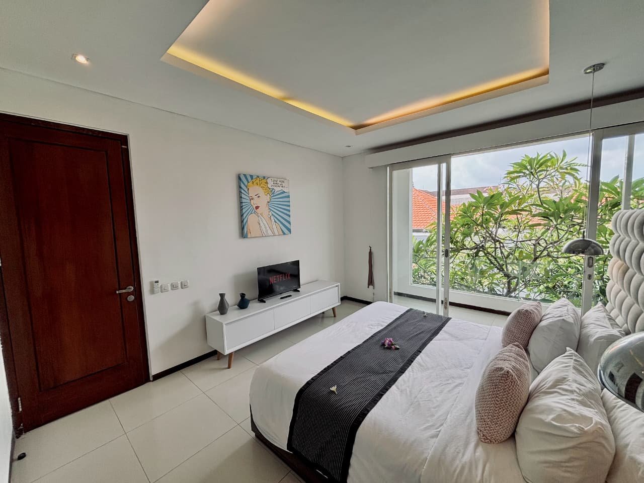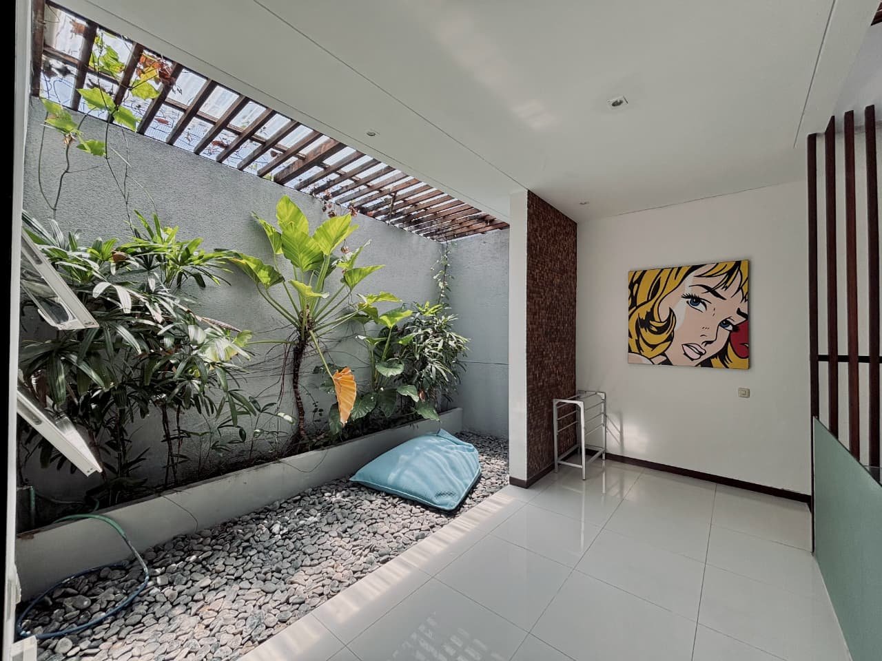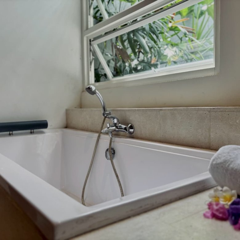 Enjoy the beauty of your vacation on the stunning island of Bali by relaxing in our cozy and elegant villa, located in the heart of Canggu – Berawa. The villa features a modern minimalist design with a spacious, enclosed living room. You can also enjoy cooking your favorite meals in the fully equipped kitchen. This villa offers two bedrooms, Upstairs room with its own TV and ensuite bathroom. It’s perfect for a getaway with your family or your beloved partner.