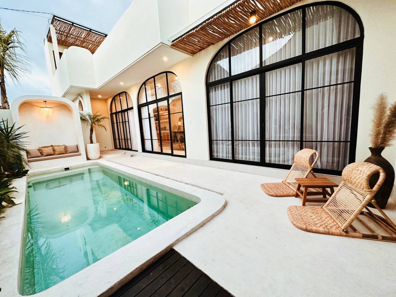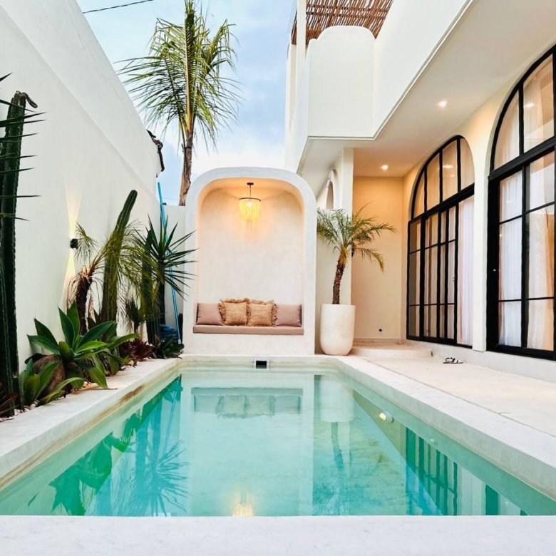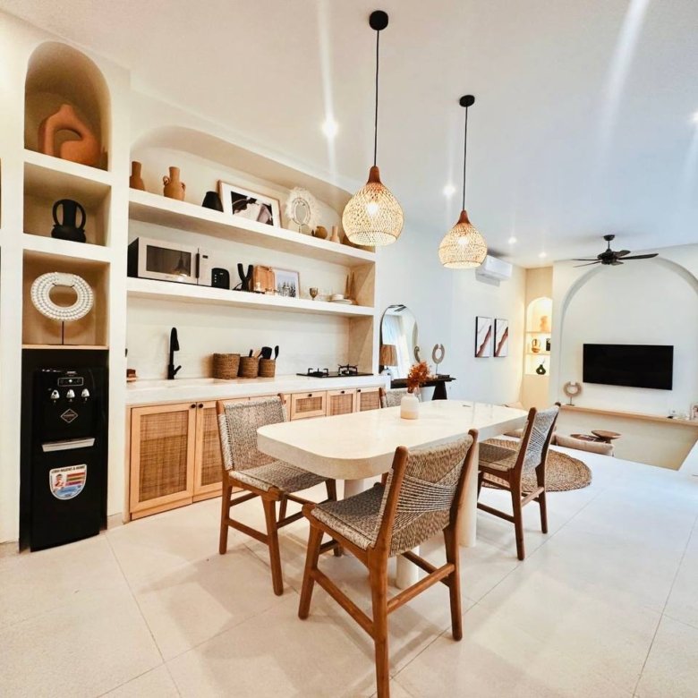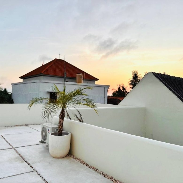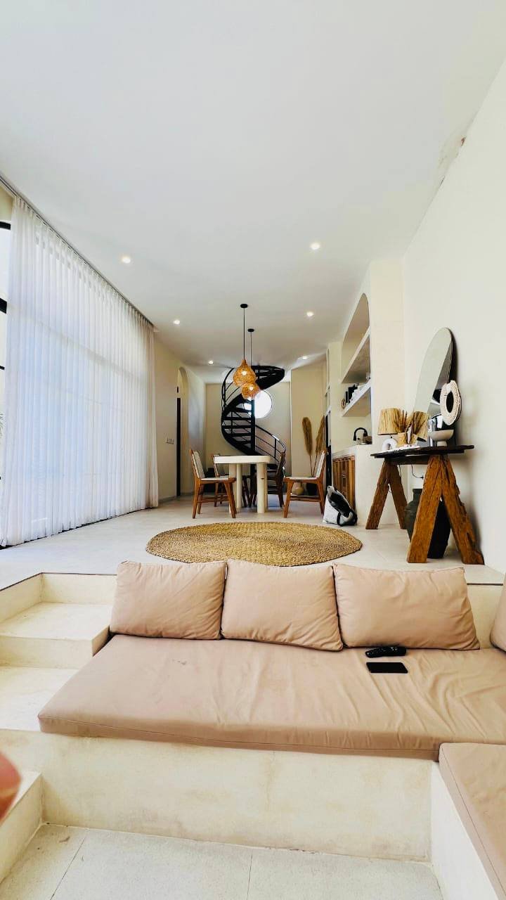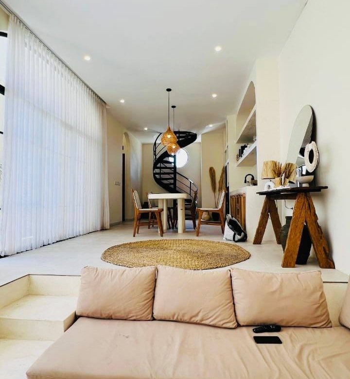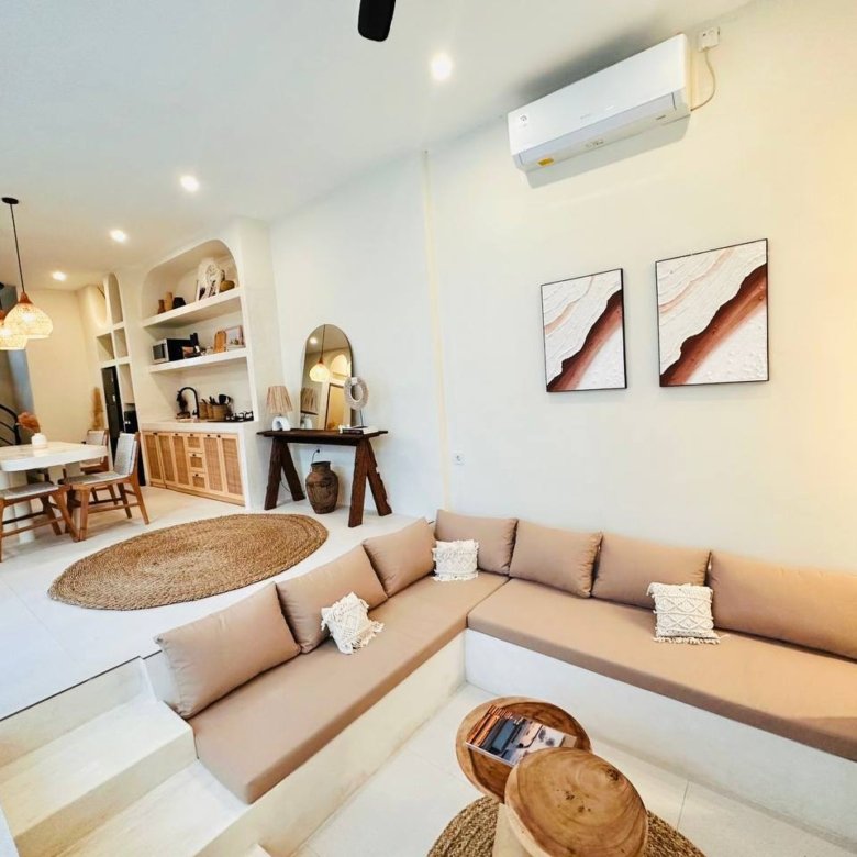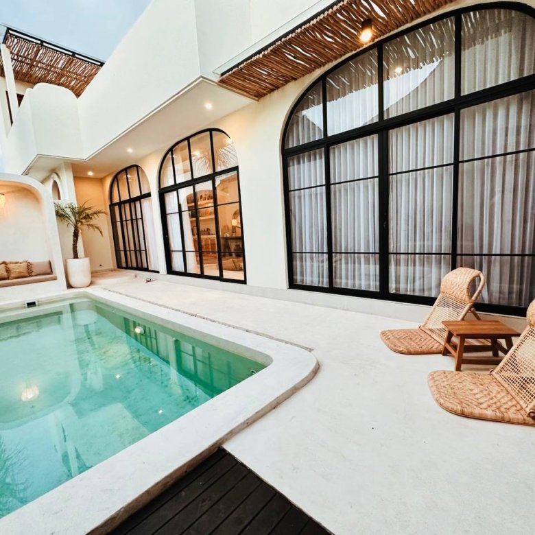 This modern Mediterranean-style villa is available April 2026 for yearly rent in Cemagi. It features a pool and residential views, with the surrounding area offering easy access to Mangening Beach and Cemagi Beach. A sublease is possible with a minimum three-year commitment.