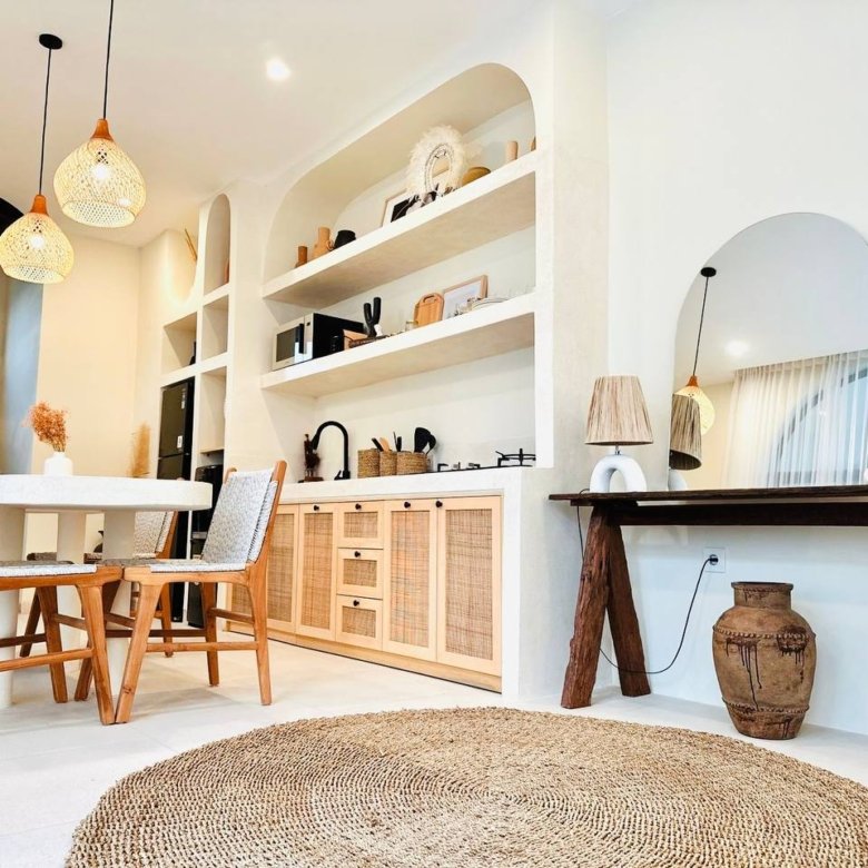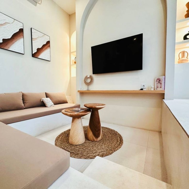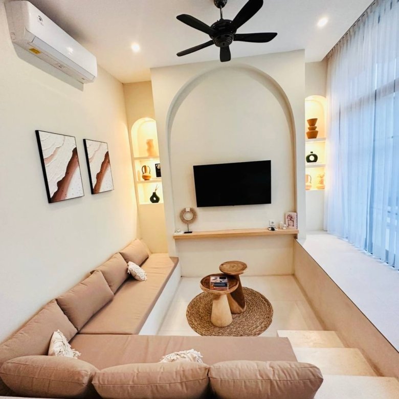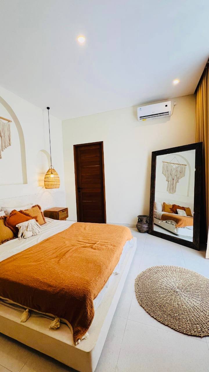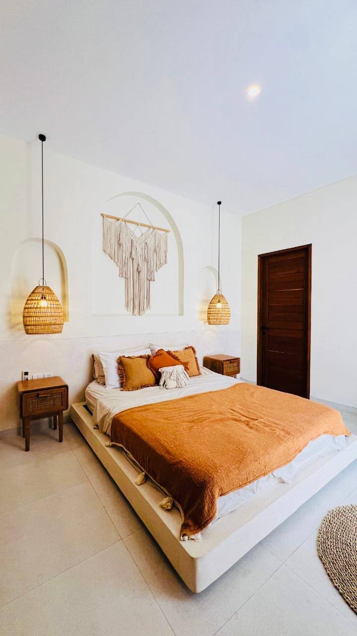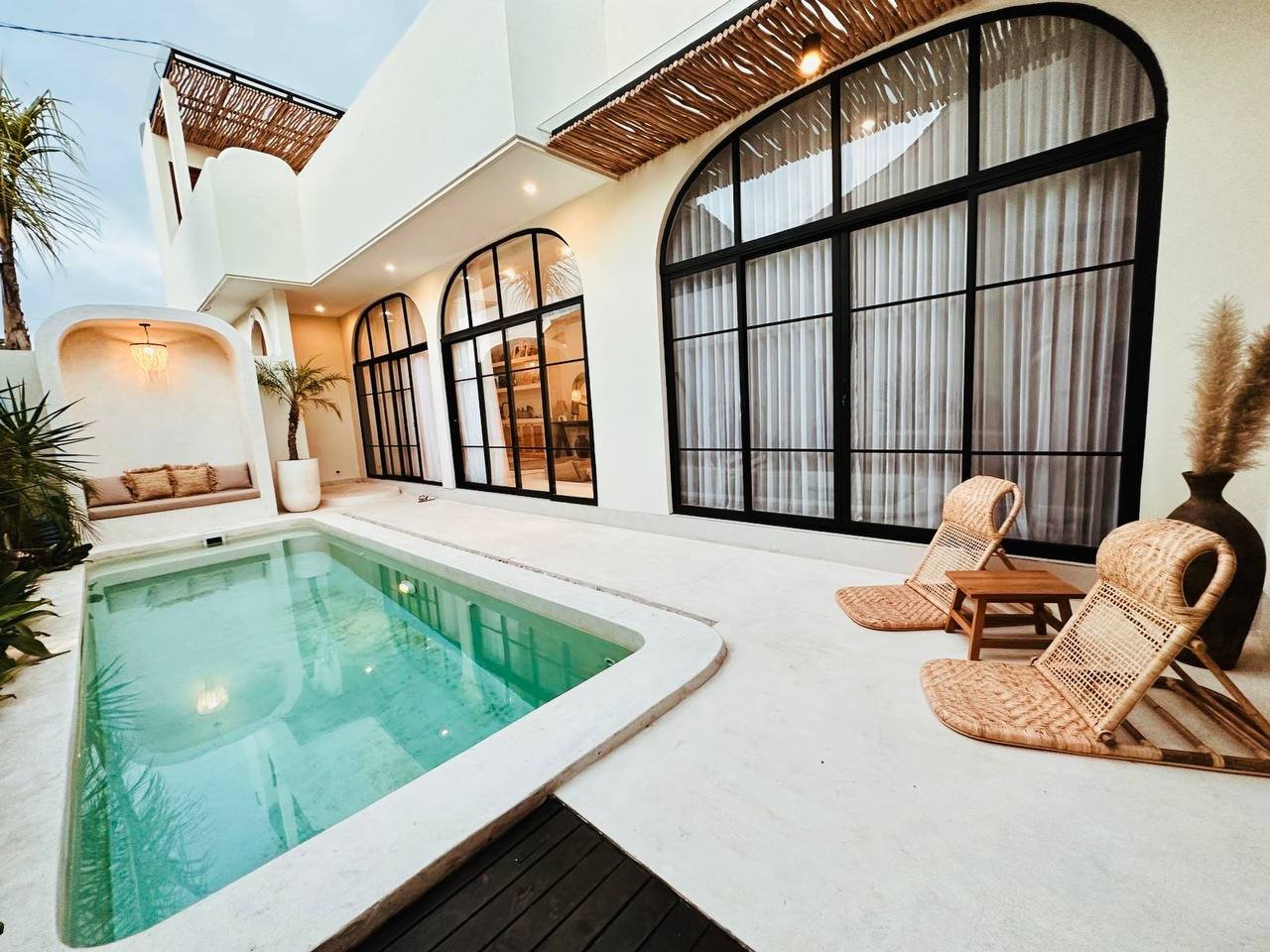 This modern Mediterranean-style villa is available April 2026 for yearly rent in Cemagi. It features a pool and residential views, with the surrounding area offering easy access to Mangening Beach and Cemagi Beach. A sublease is possible with a minimum three-year commitment.