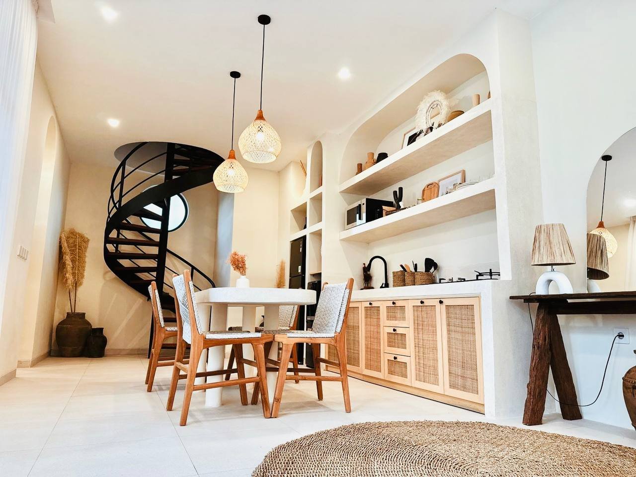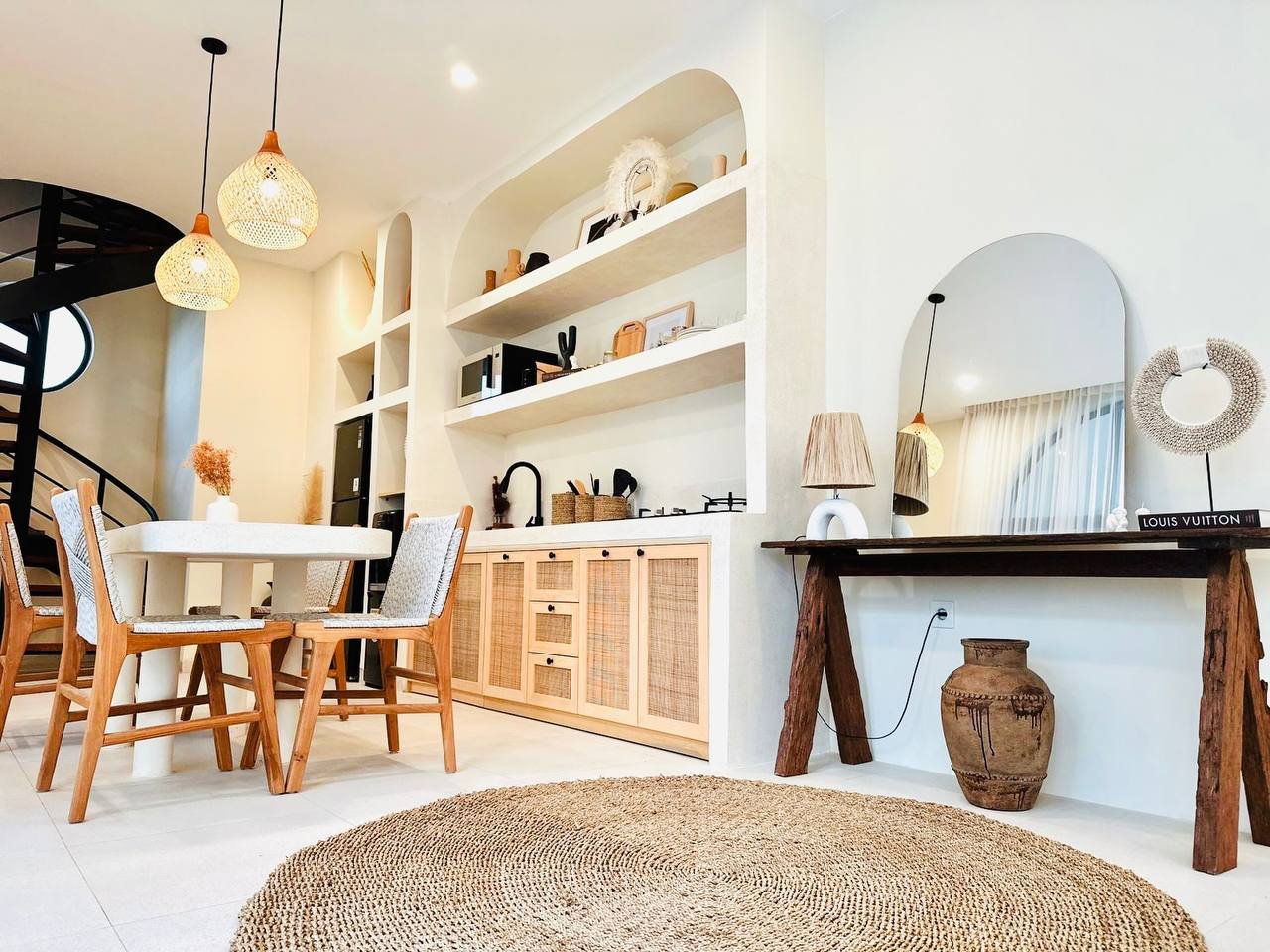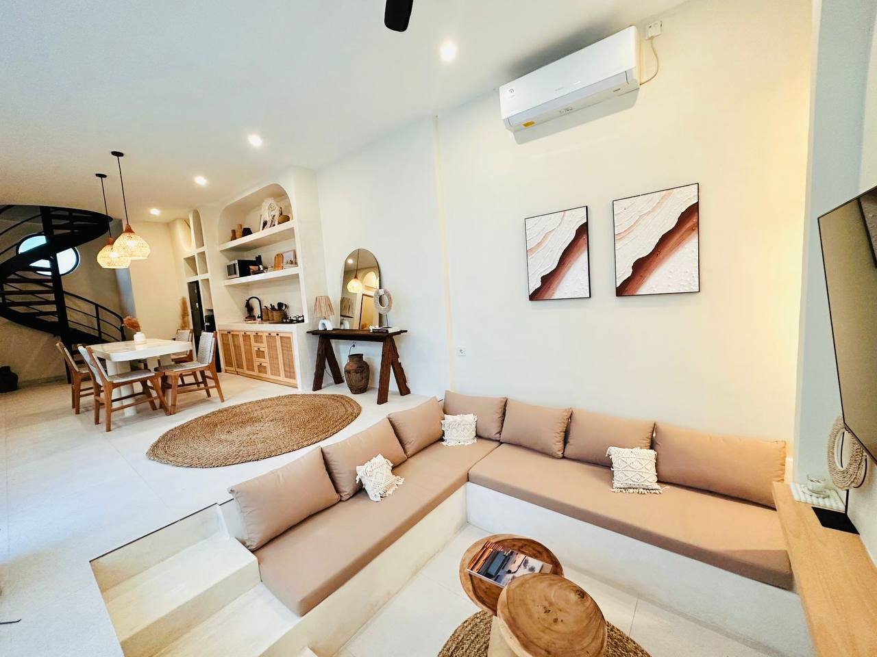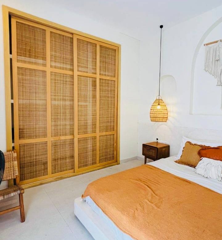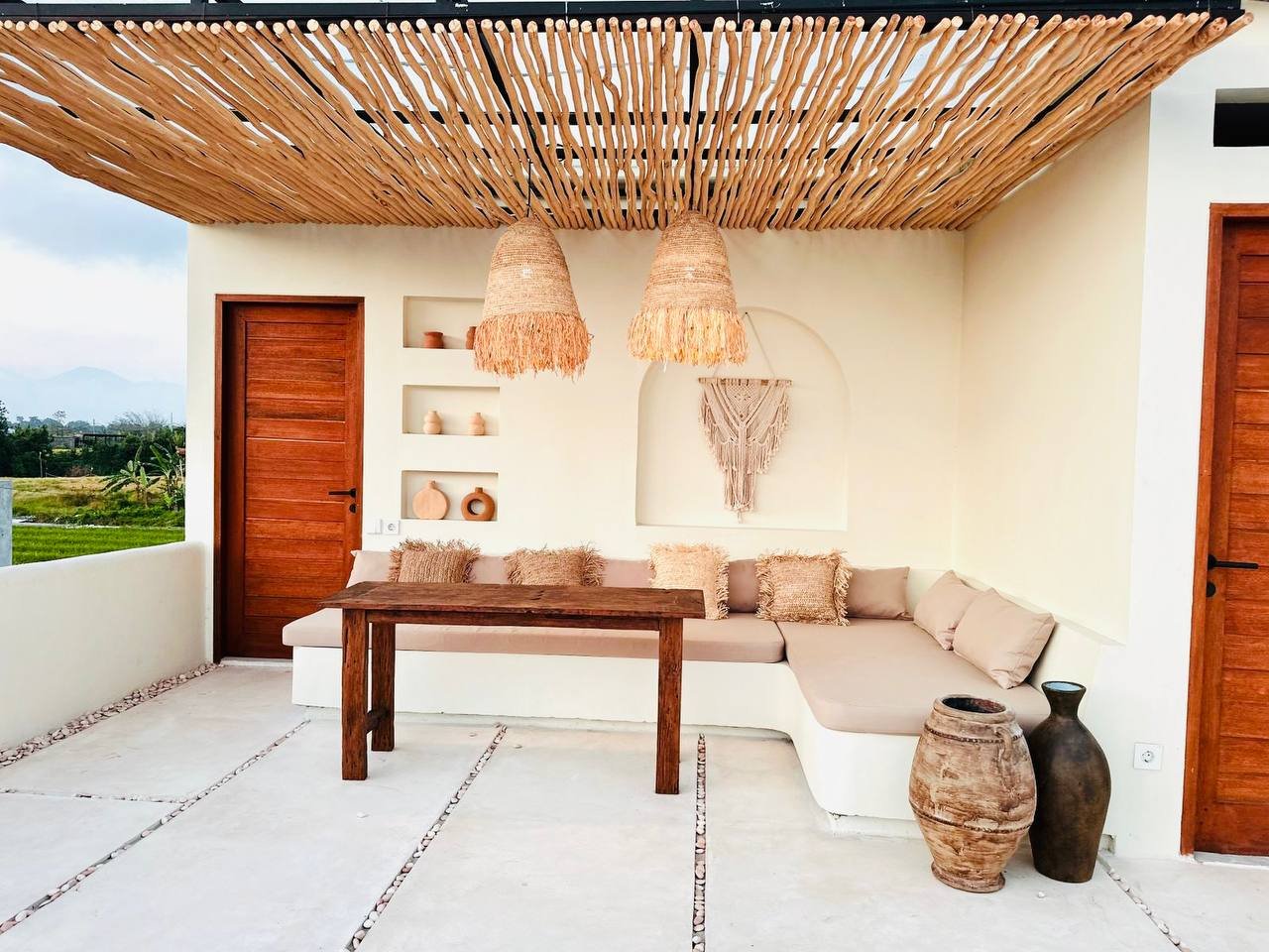 This modern Mediterranean-style villa is available April 2026 for yearly rent in Cemagi. It features a pool and residential views, with the surrounding area offering easy access to Mangening Beach and Cemagi Beach. A sublease is possible with a minimum three-year commitment.