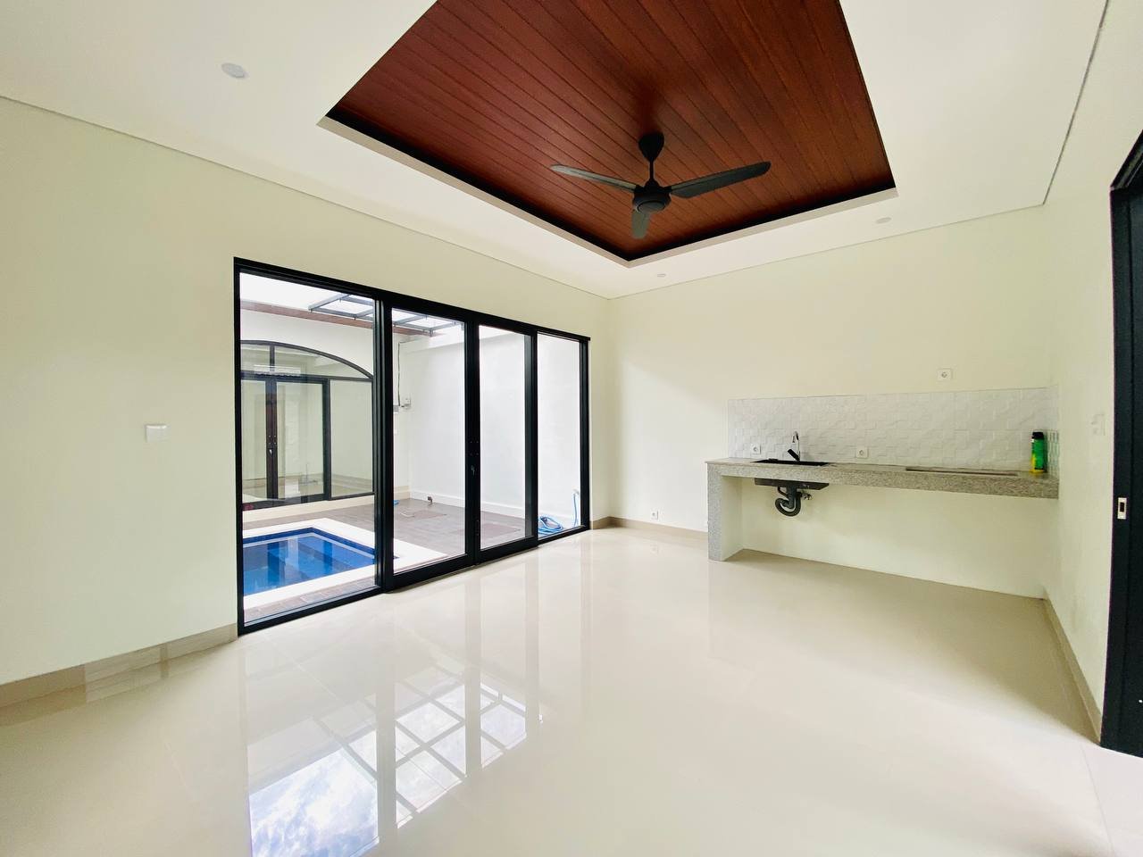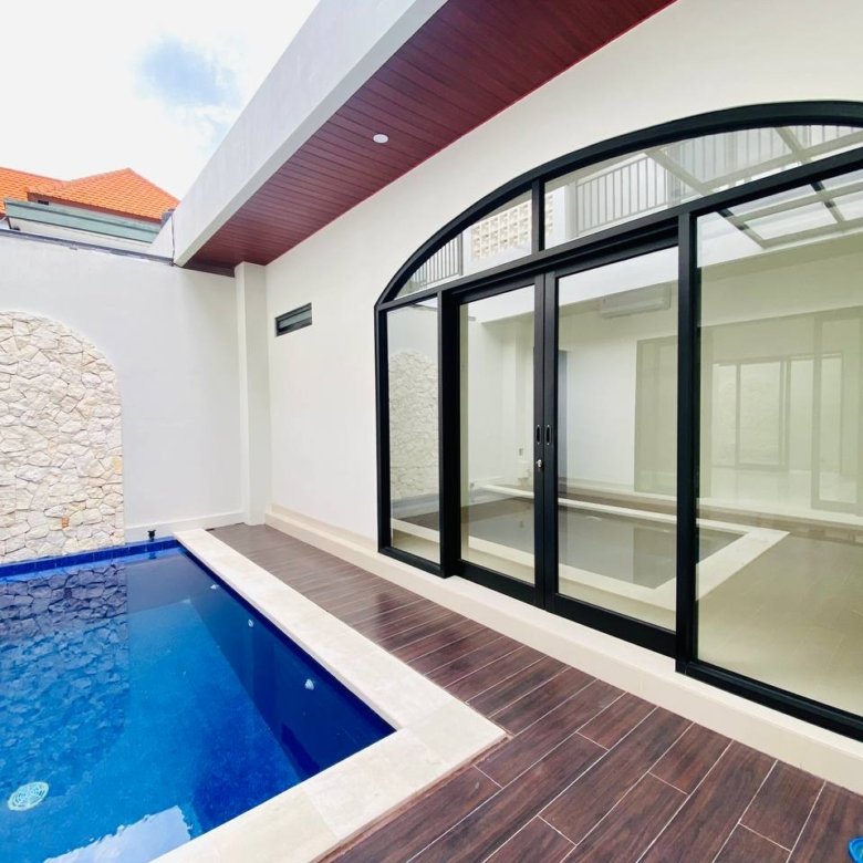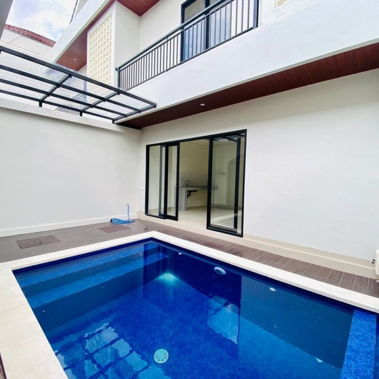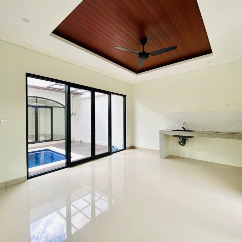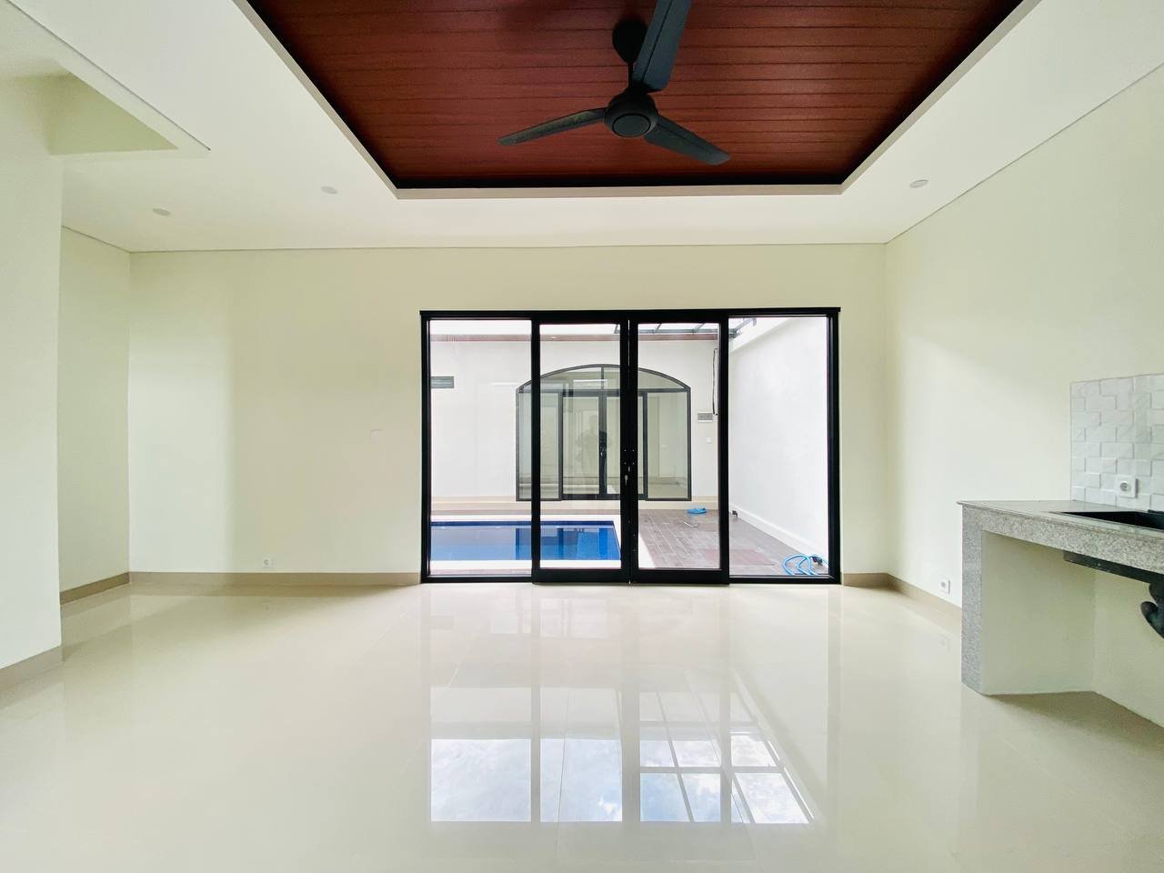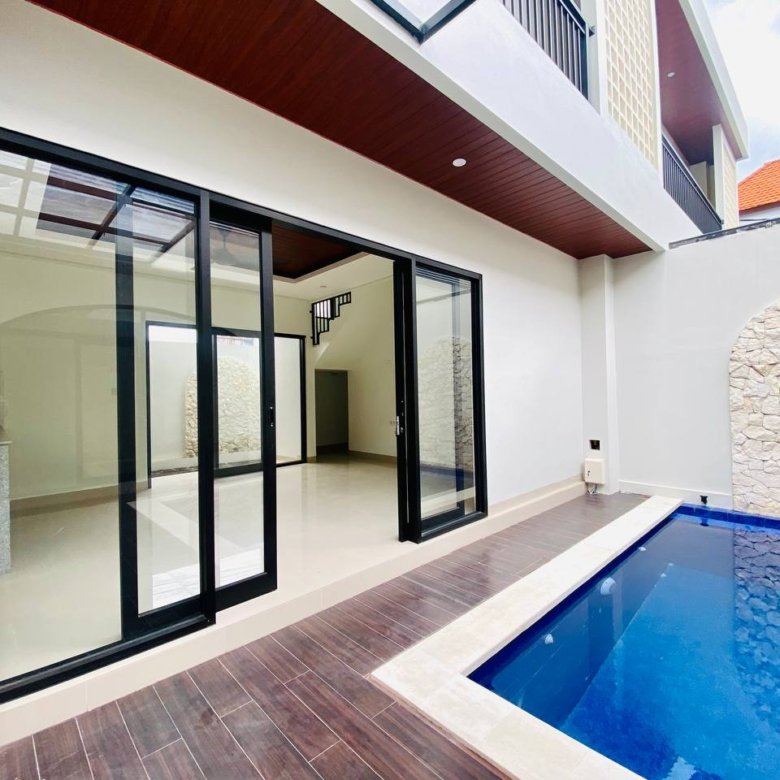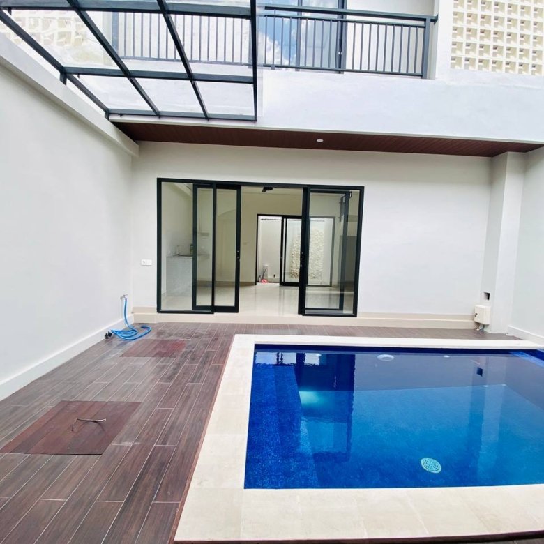 These three villas all share the same layout. This is Villa A. It is available for yearly rent, with a minimum rental period of 1 year. Located in an orange zone, a long-term lease of up to 15 years is possible. The villa offers a pool view and is surrounded by The Normandy French Creperie, with Berawa Beach and Atlas Beach Club just a 6-minute bike ride away.