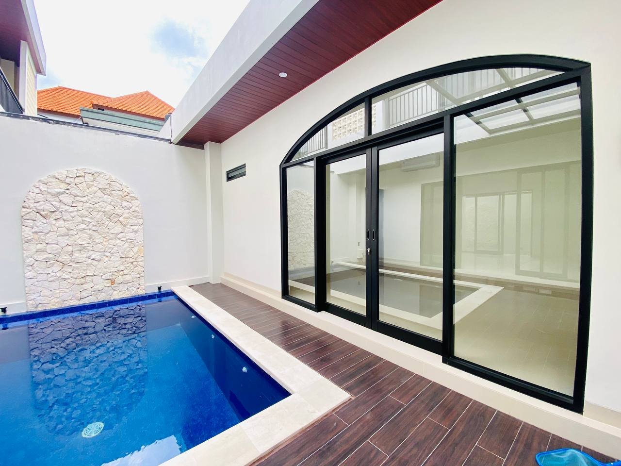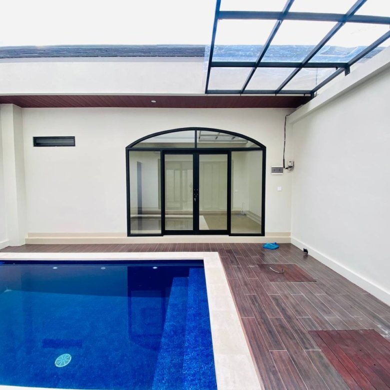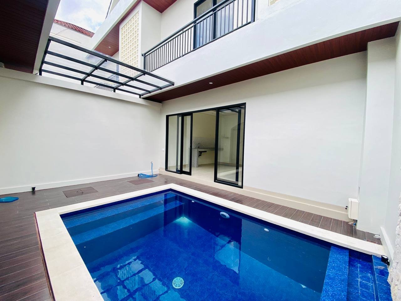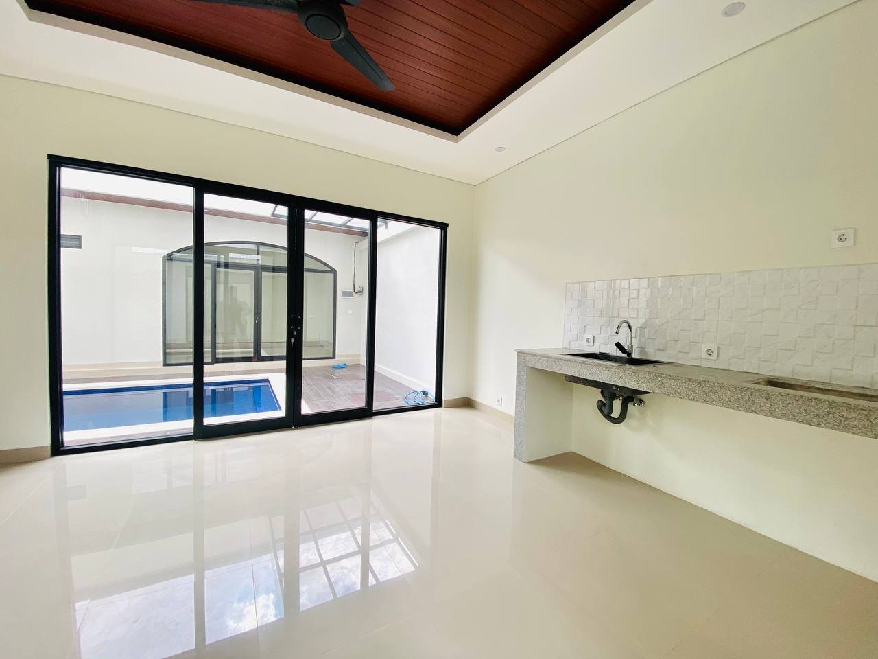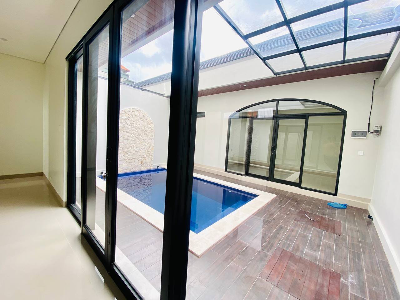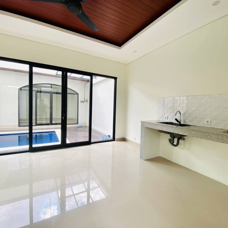 These three villas all share the same layout. This is Villa A. It is available for yearly rent, with a minimum rental period of 1 year. Located in an orange zone, a long-term lease of up to 15 years is possible. The villa offers a pool view and is surrounded by The Normandy French Creperie, with Berawa Beach and Atlas Beach Club just a 6-minute bike ride away.