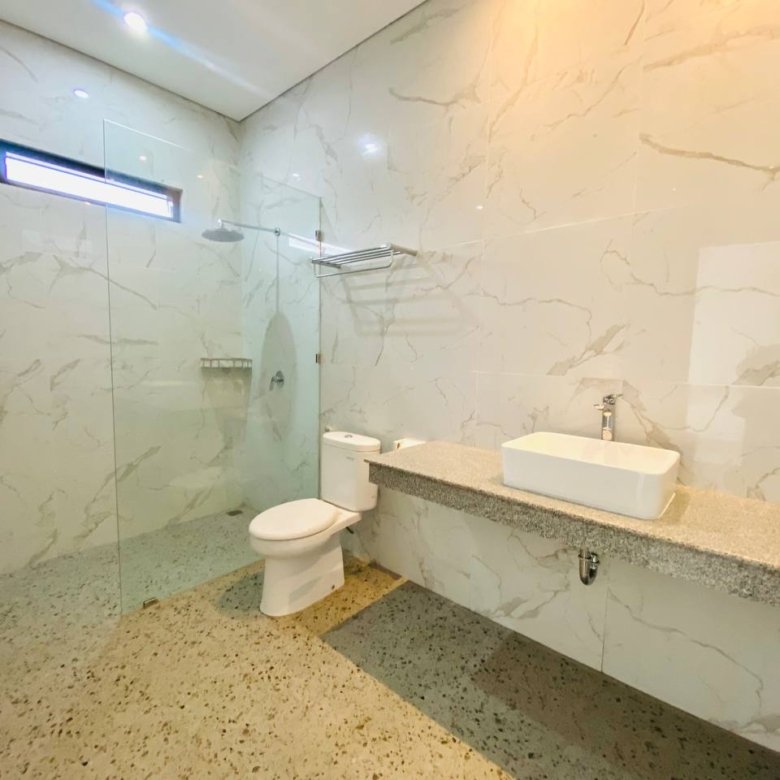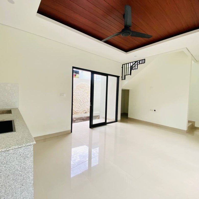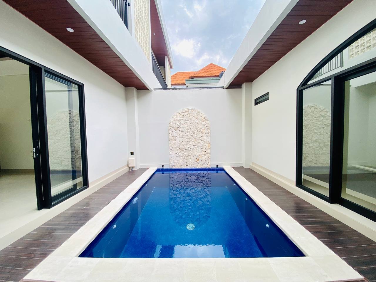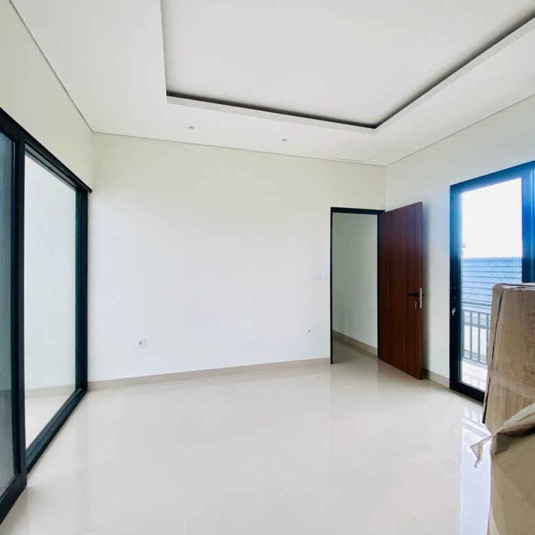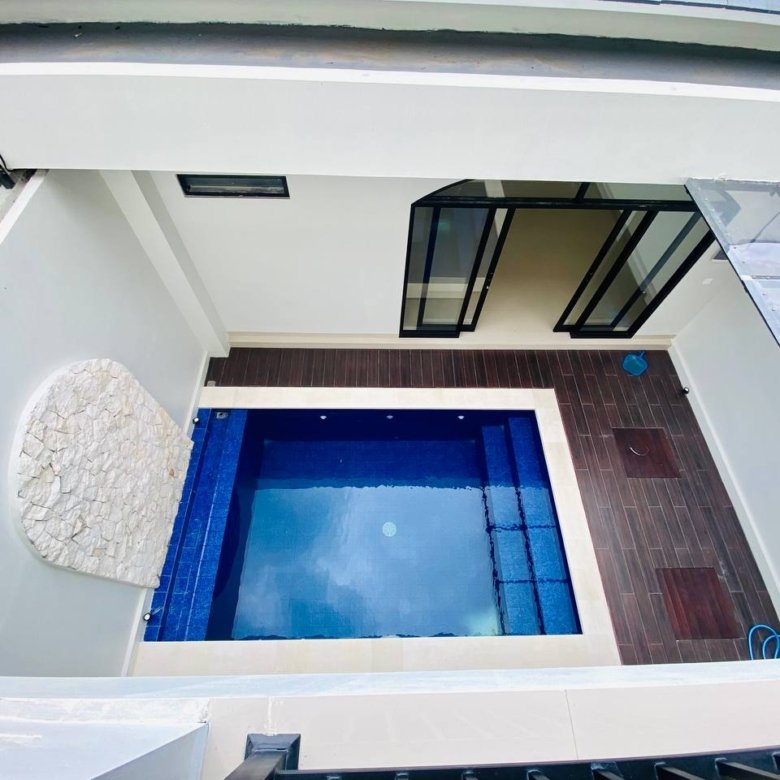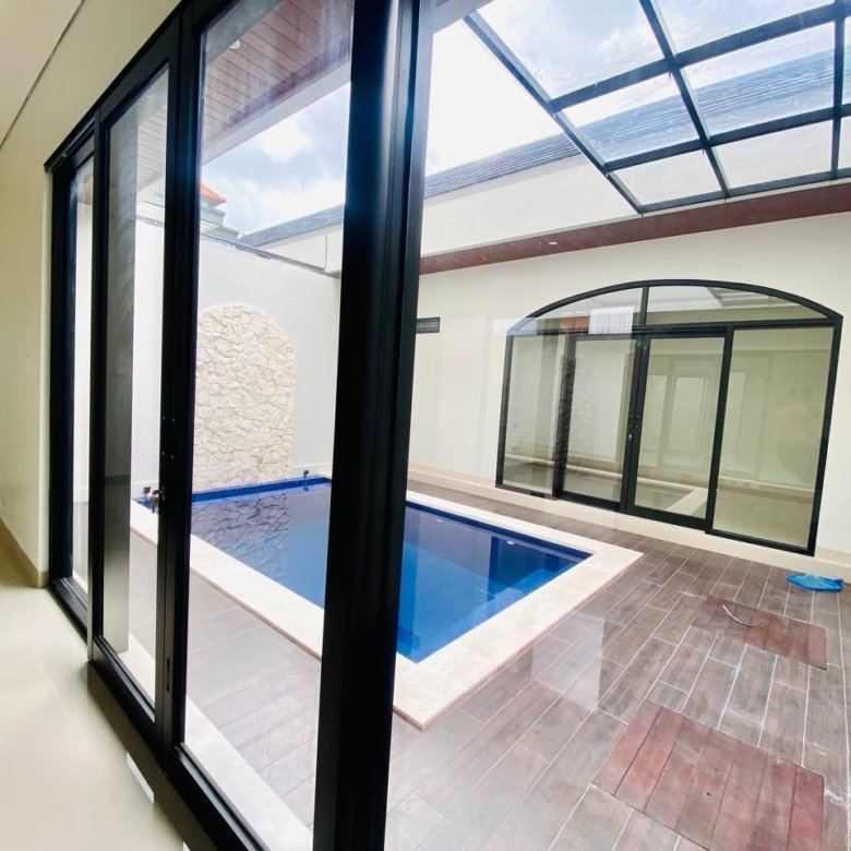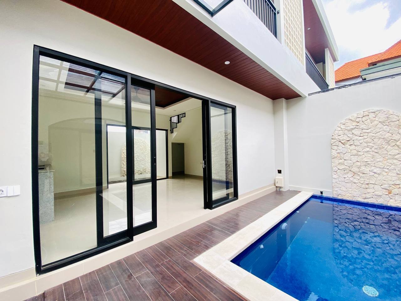 These three villas all share the same layout. This is Villa A. It is available for yearly rent, with a minimum rental period of 1 year. Located in an orange zone, a long-term lease of up to 15 years is possible. The villa offers a pool view and is surrounded by The Normandy French Creperie, with Berawa Beach and Atlas Beach Club just a 6-minute bike ride away.
