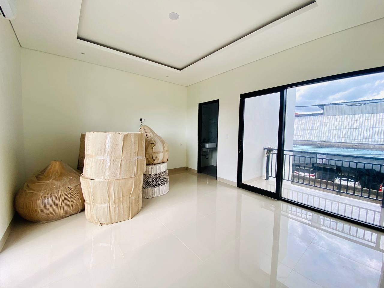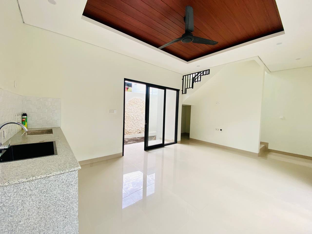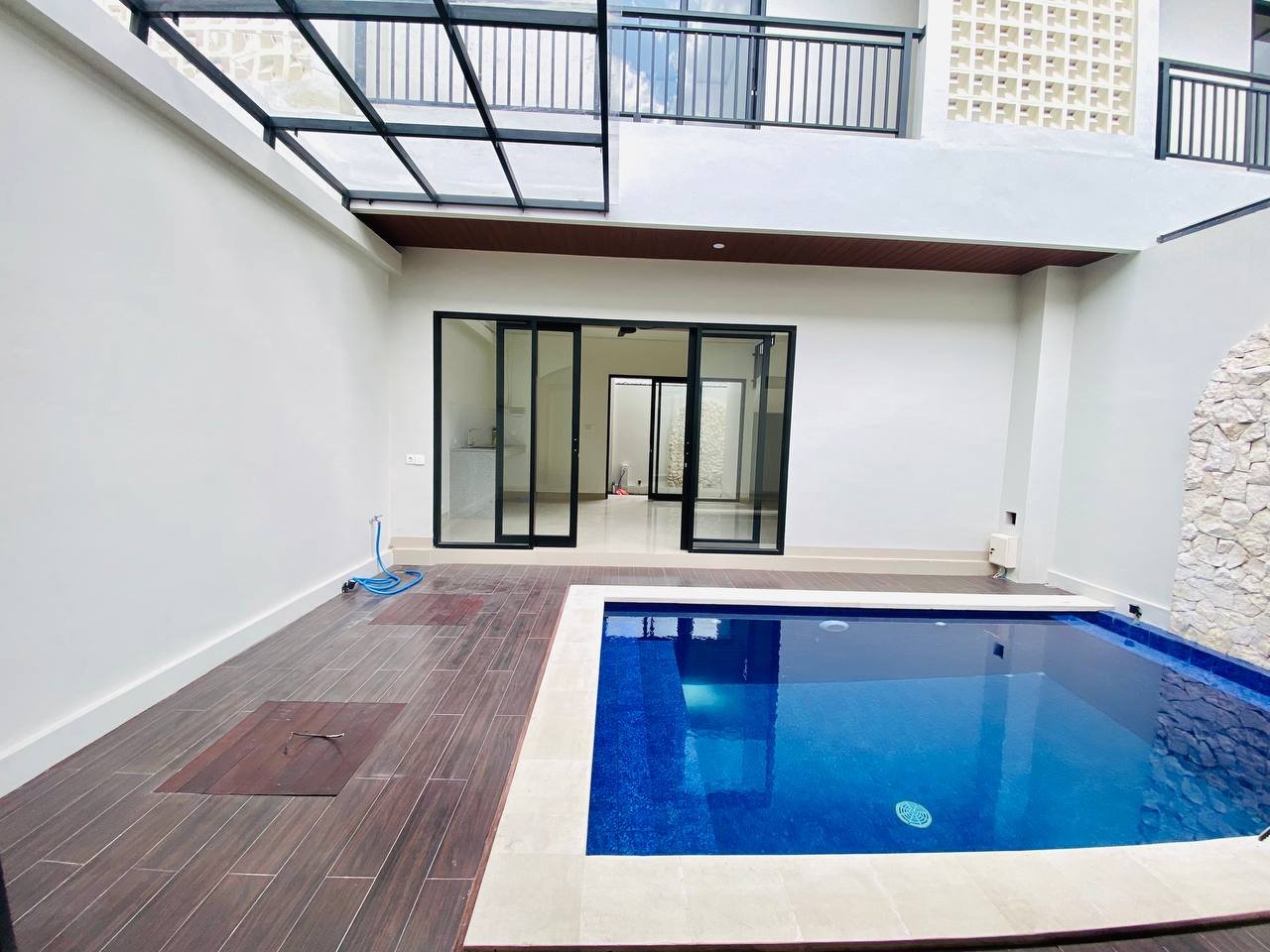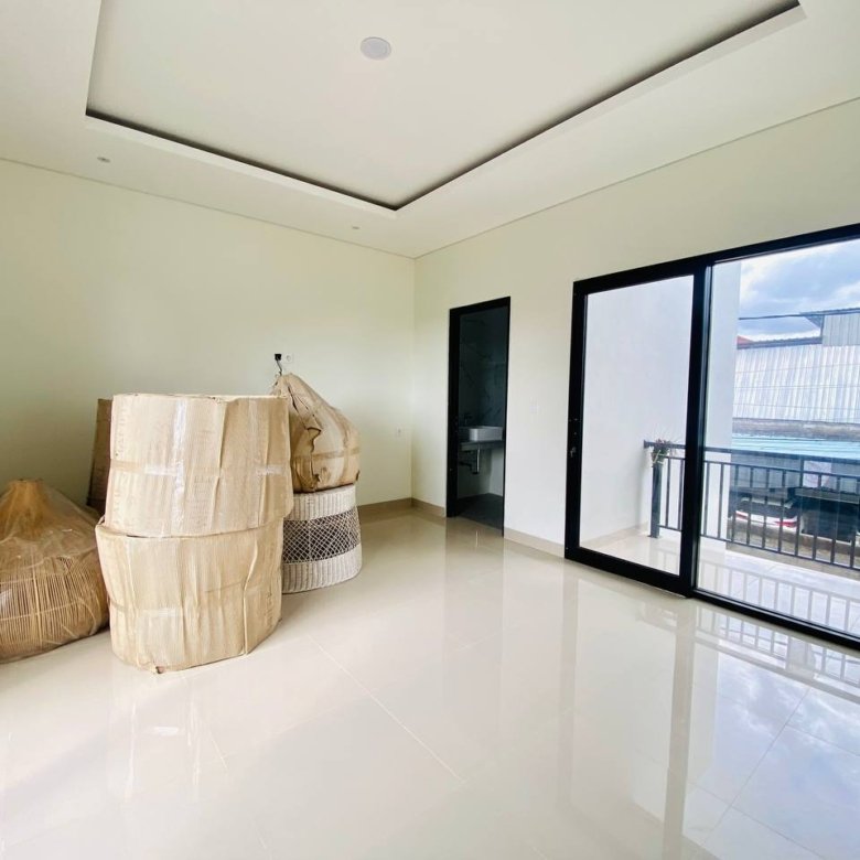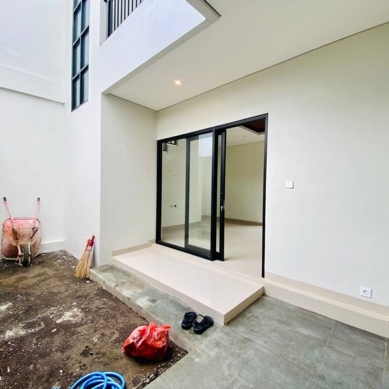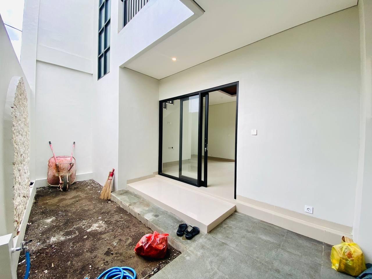 These three villas all share the same layout. This is Villa A. It is available for yearly rent, with a minimum rental period of 1 year. Located in an orange zone, a long-term lease of up to 15 years is possible. The villa offers a pool view and is surrounded by The Normandy French Creperie, with Berawa Beach and Atlas Beach Club just a 6-minute bike ride away.