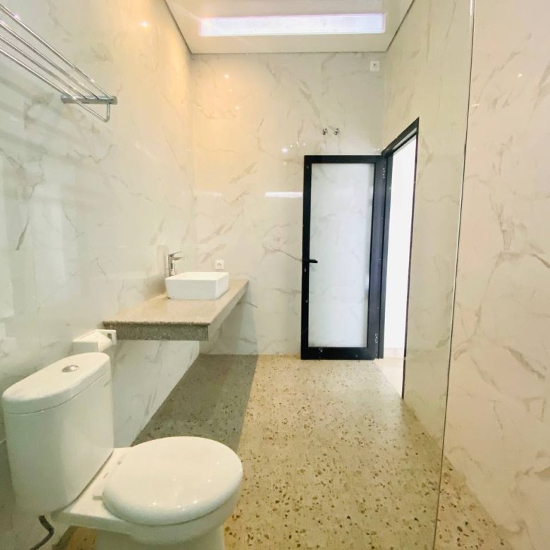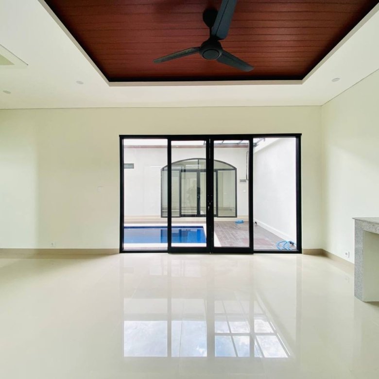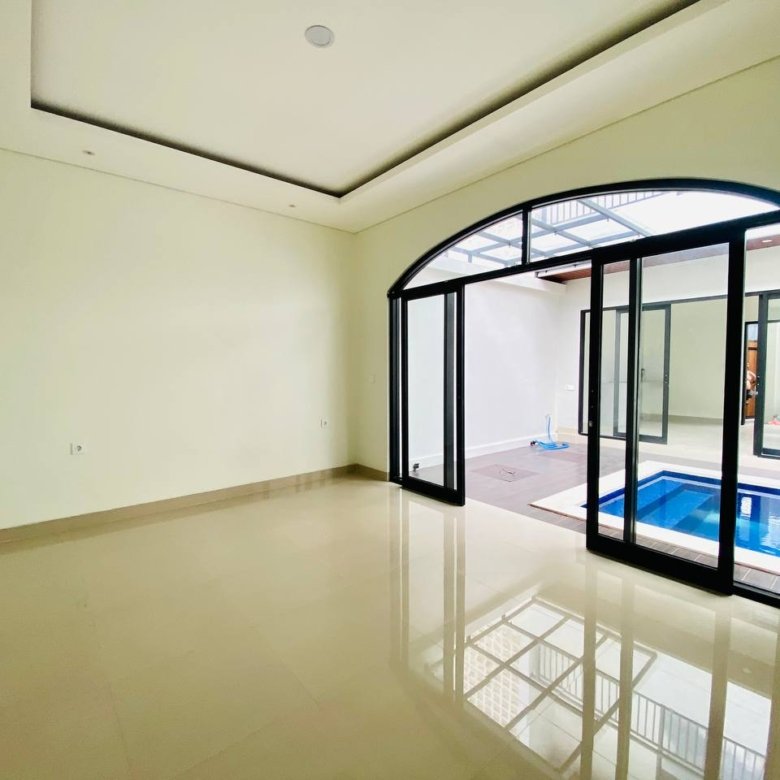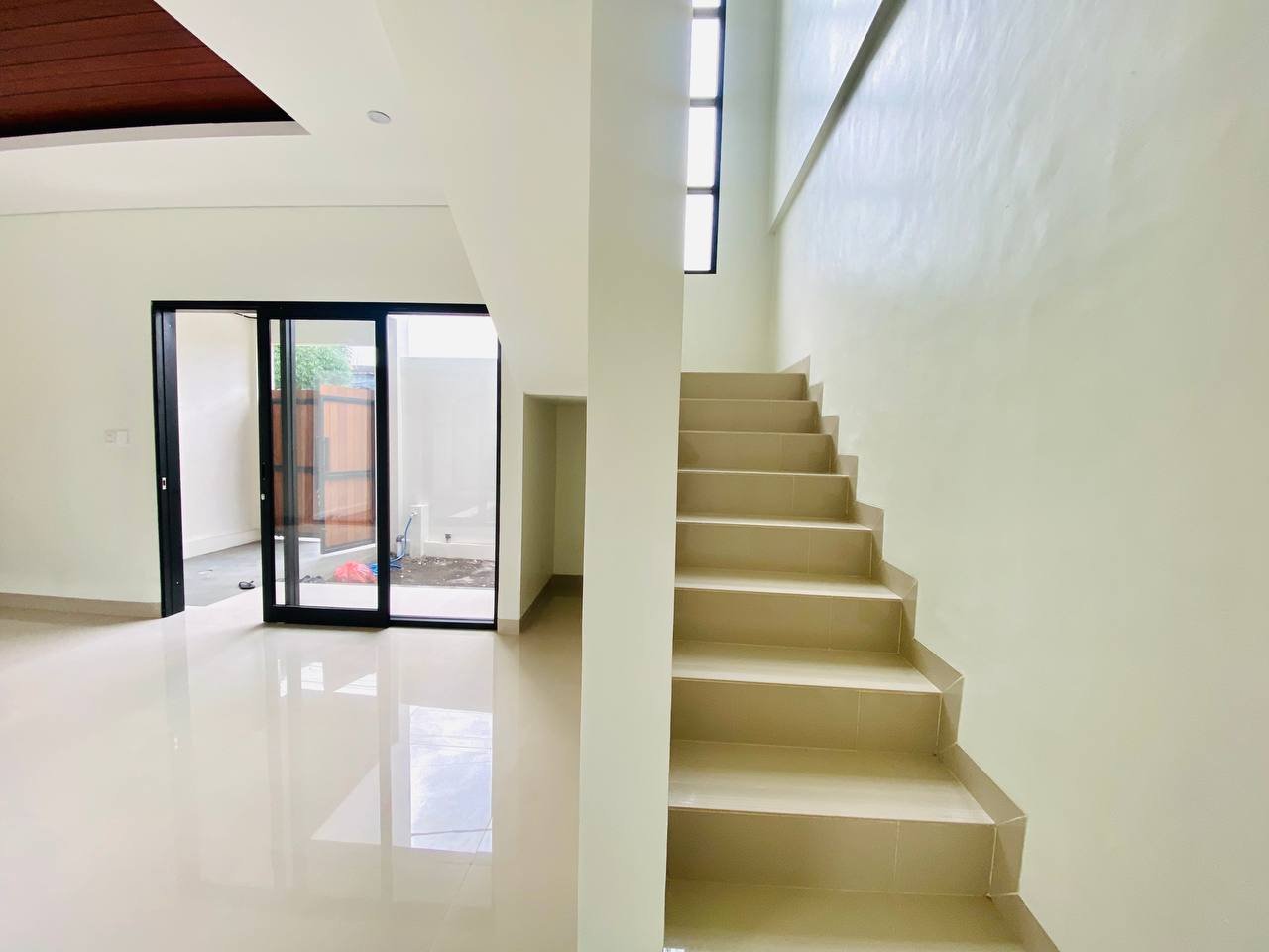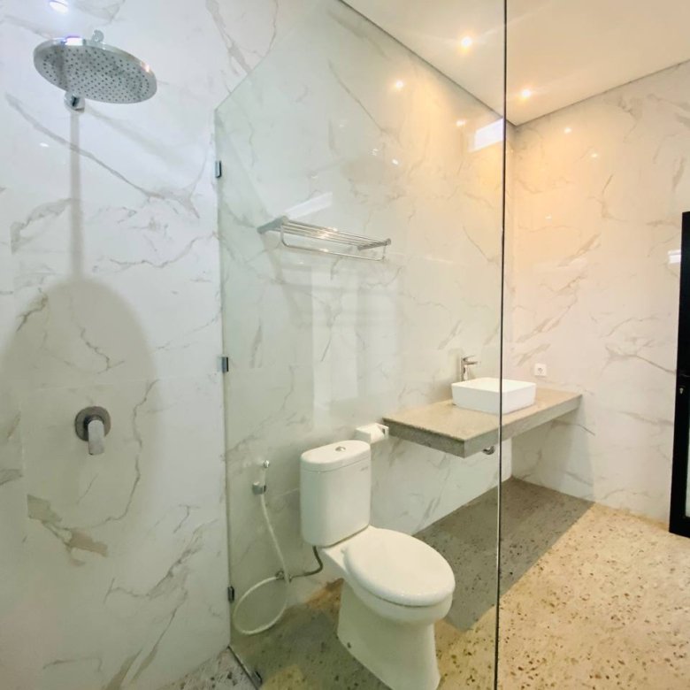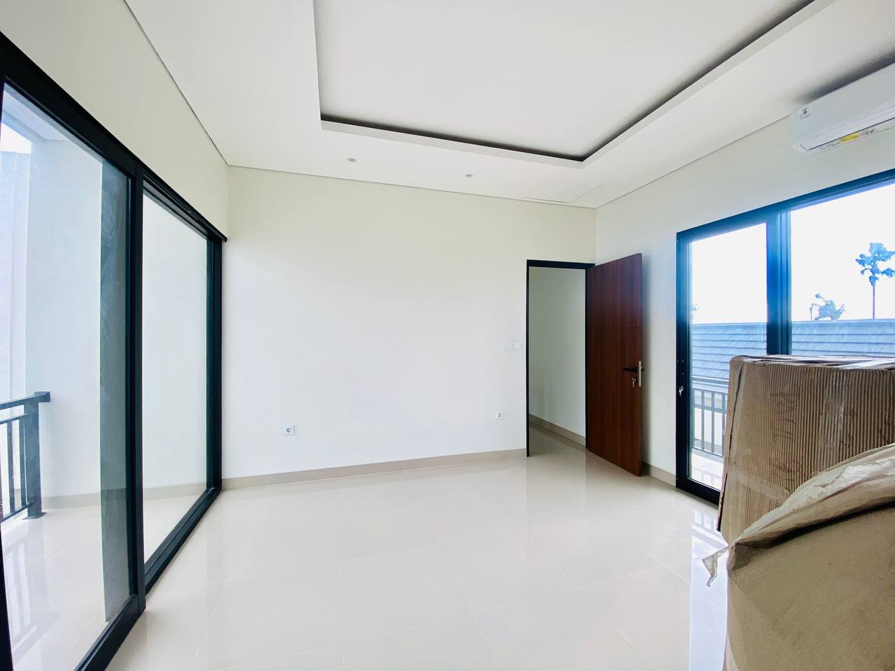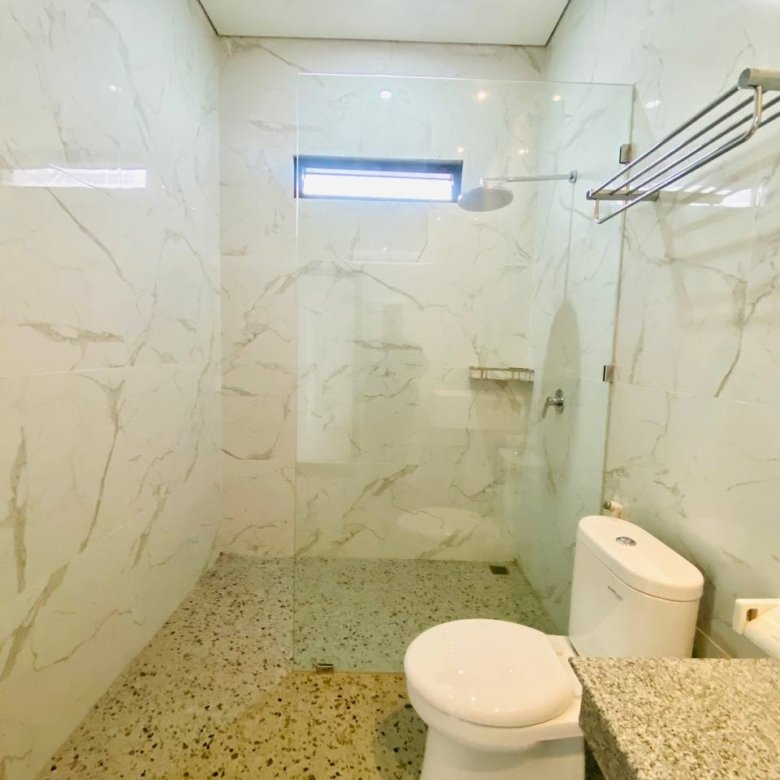 These three villas all share the same layout. This is Villa A. It is available for yearly rent, with a minimum rental period of 1 year. Located in an orange zone, a long-term lease of up to 15 years is possible. The villa offers a pool view and is surrounded by The Normandy French Creperie, with Berawa Beach and Atlas Beach Club just a 6-minute bike ride away.