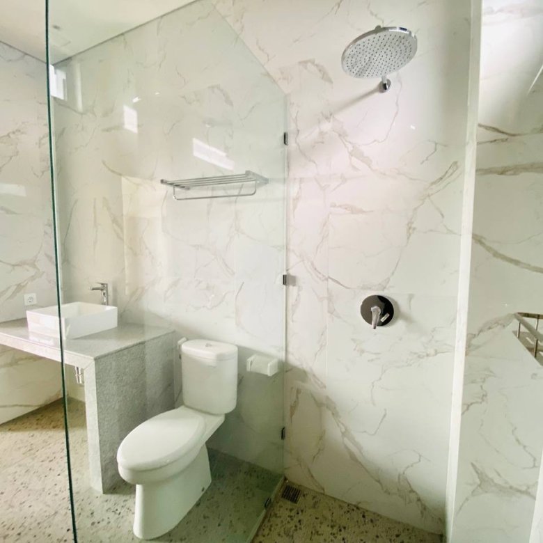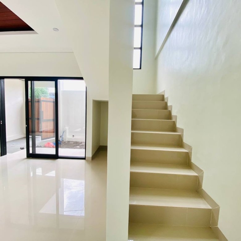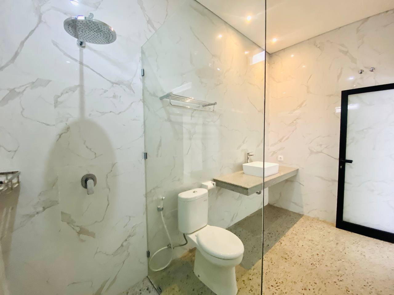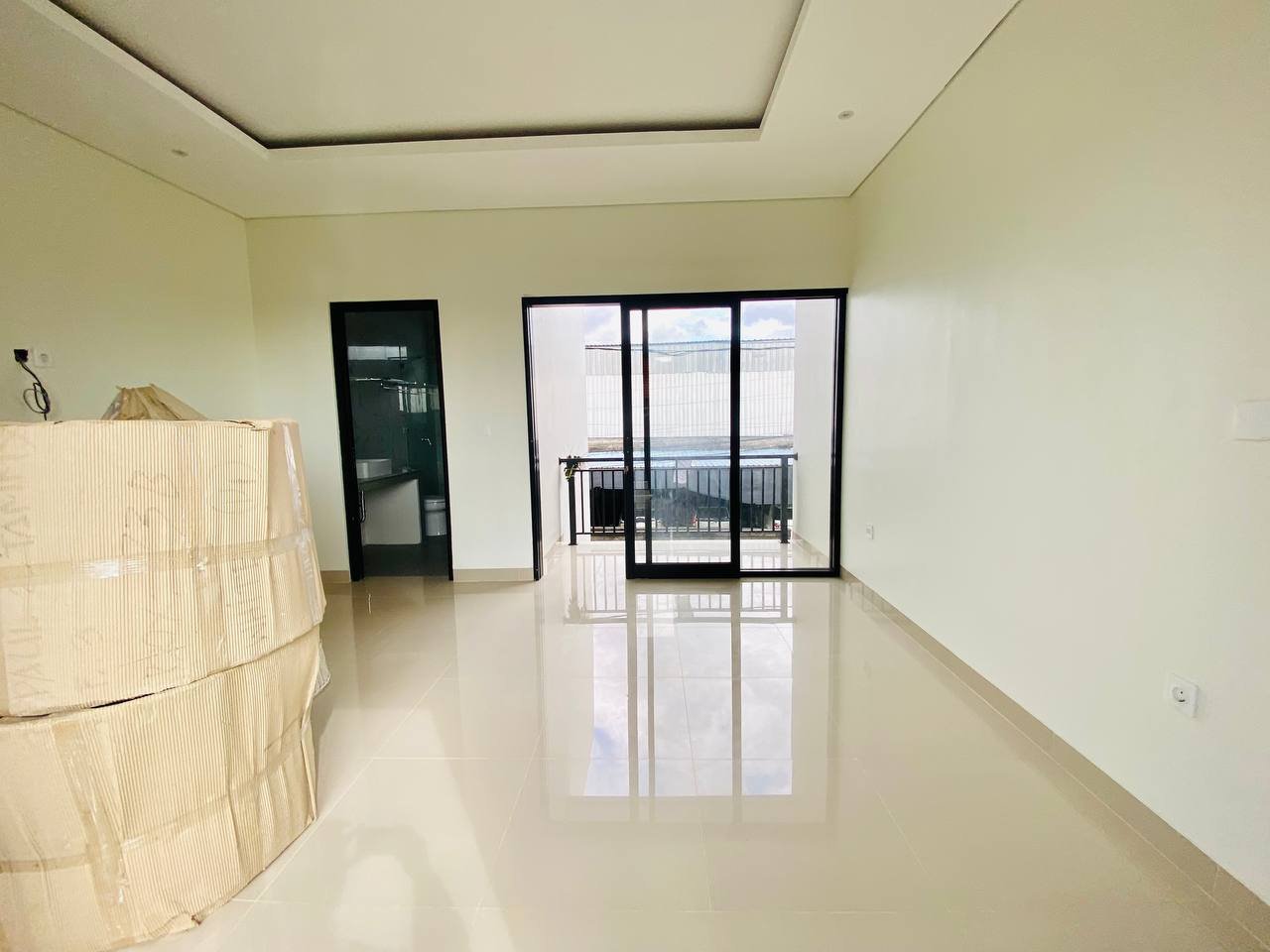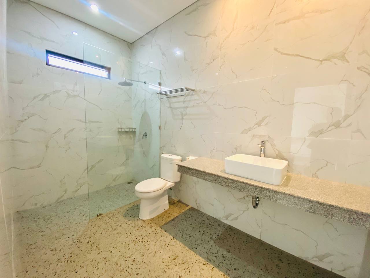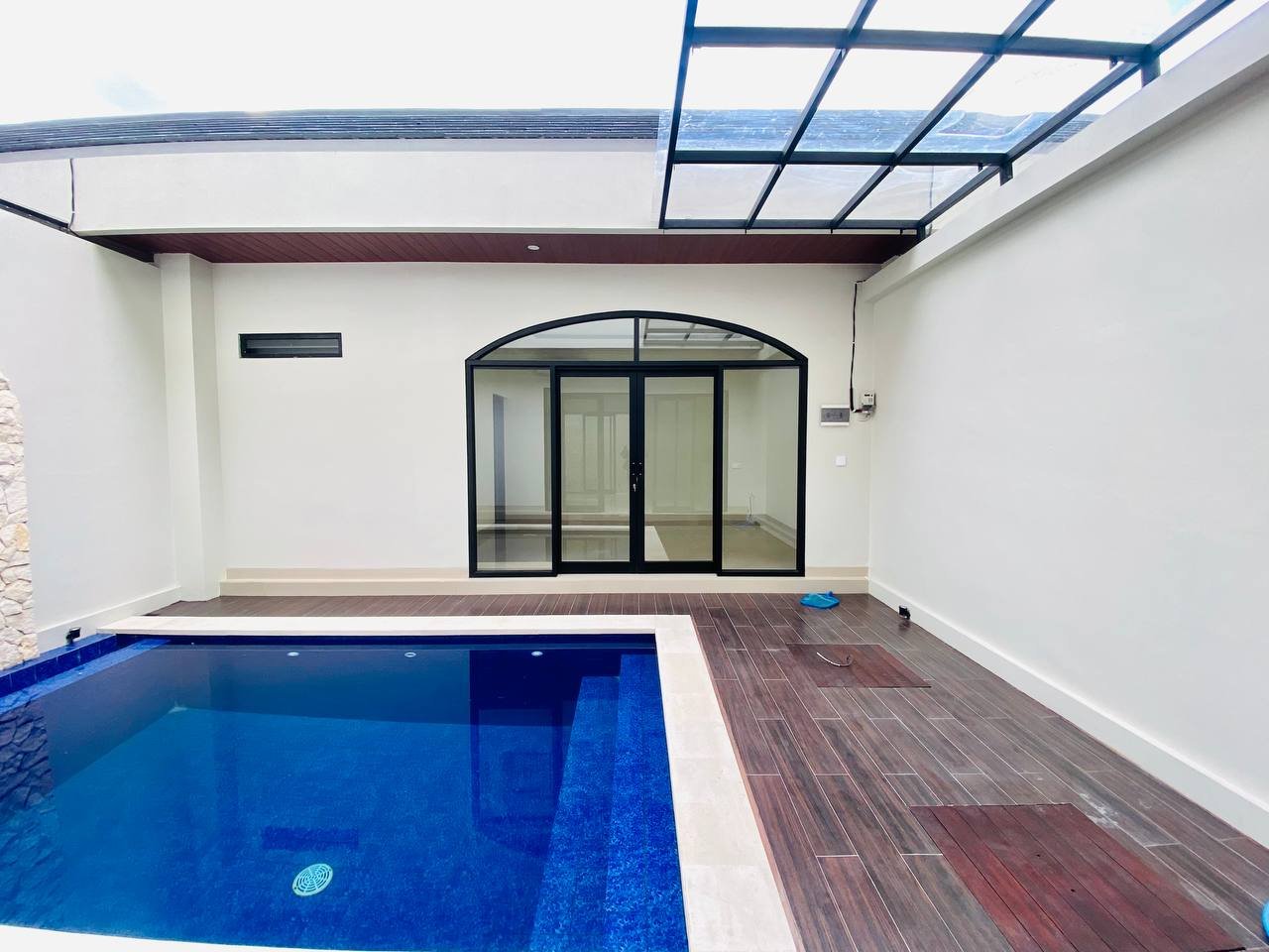 These three villas all share the same layout. This is Villa A. It is available for yearly rent, with a minimum rental period of 1 year. Located in an orange zone, a long-term lease of up to 15 years is possible. The villa offers a pool view and is surrounded by The Normandy French Creperie, with Berawa Beach and Atlas Beach Club just a 6-minute bike ride away.