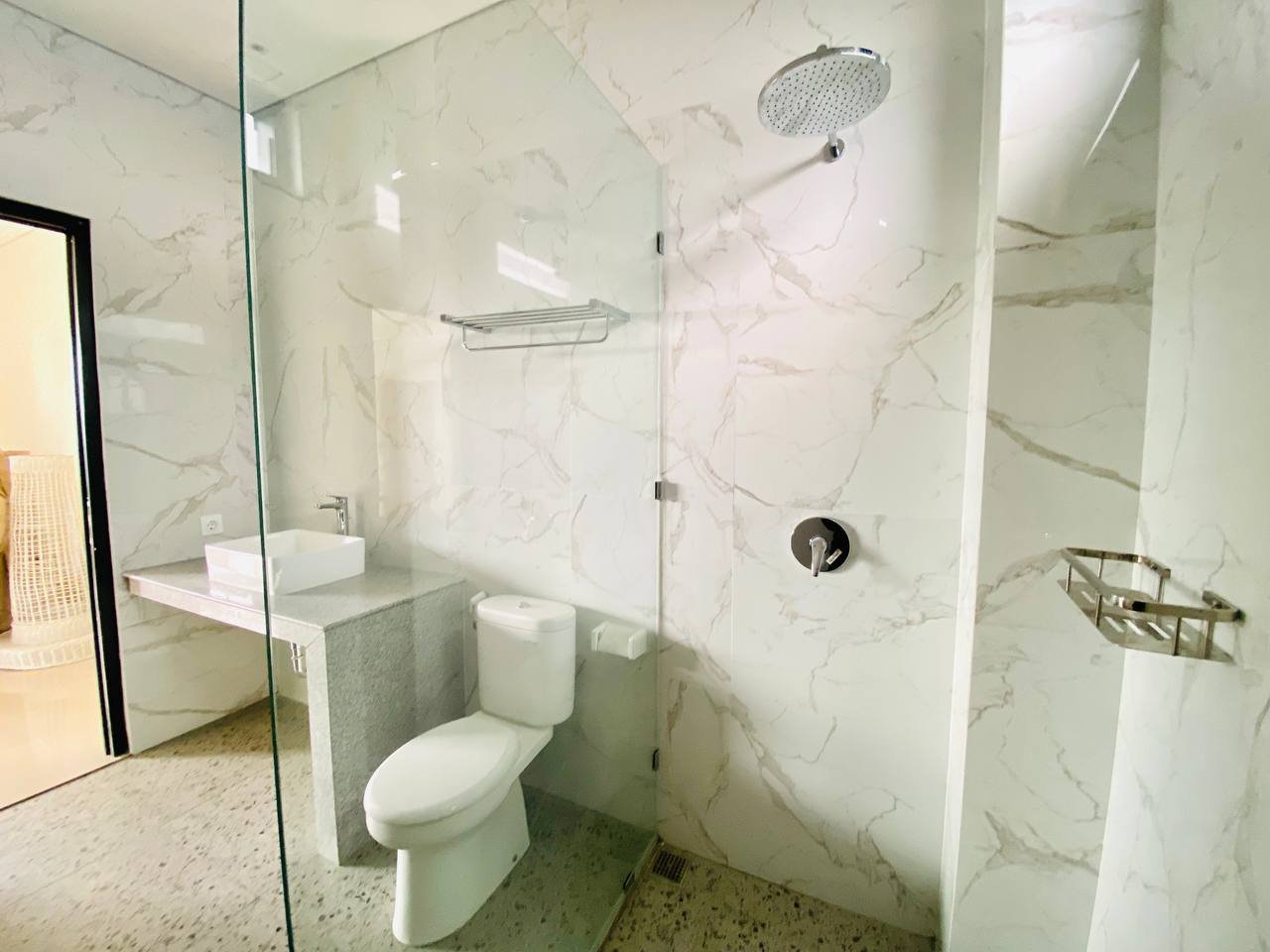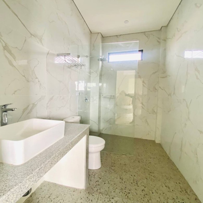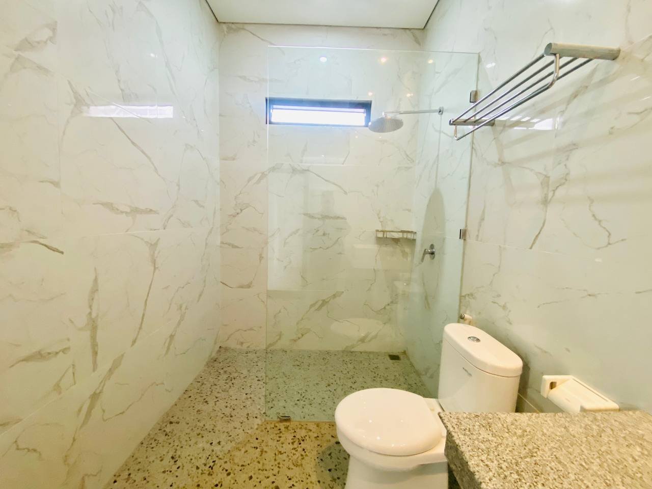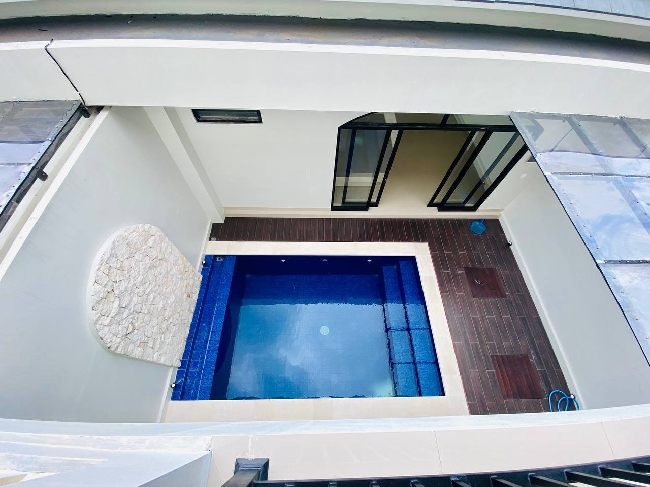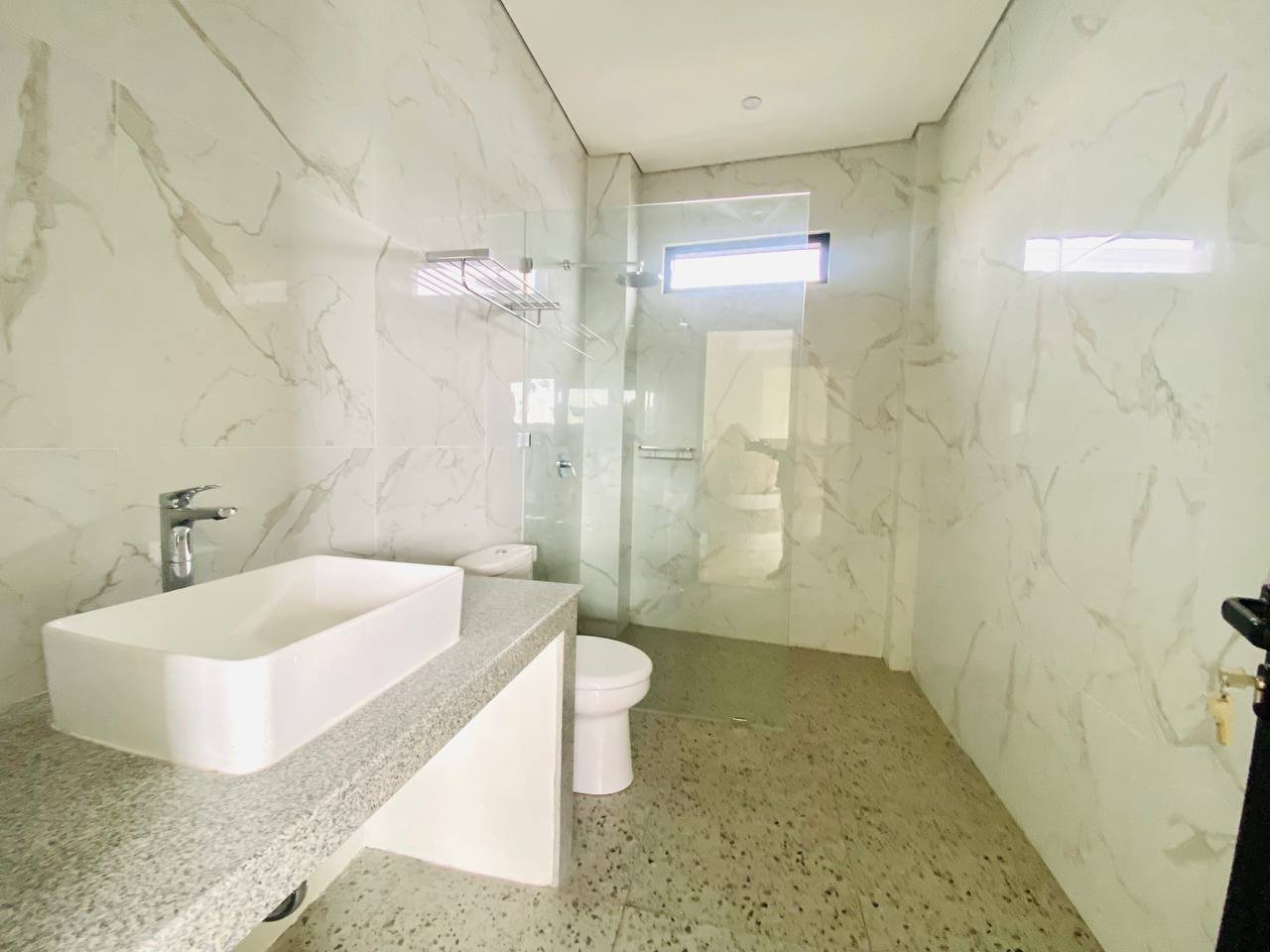 These three villas all share the same layout. This is Villa A. It is available for yearly rent, with a minimum rental period of 1 year. Located in an orange zone, a long-term lease of up to 15 years is possible. The villa offers a pool view and is surrounded by The Normandy French Creperie, with Berawa Beach and Atlas Beach Club just a 6-minute bike ride away.