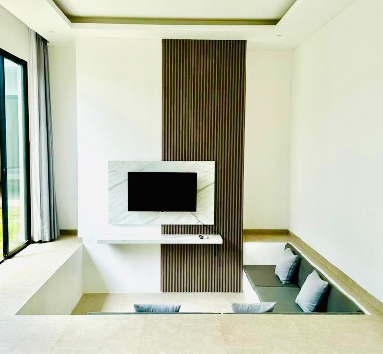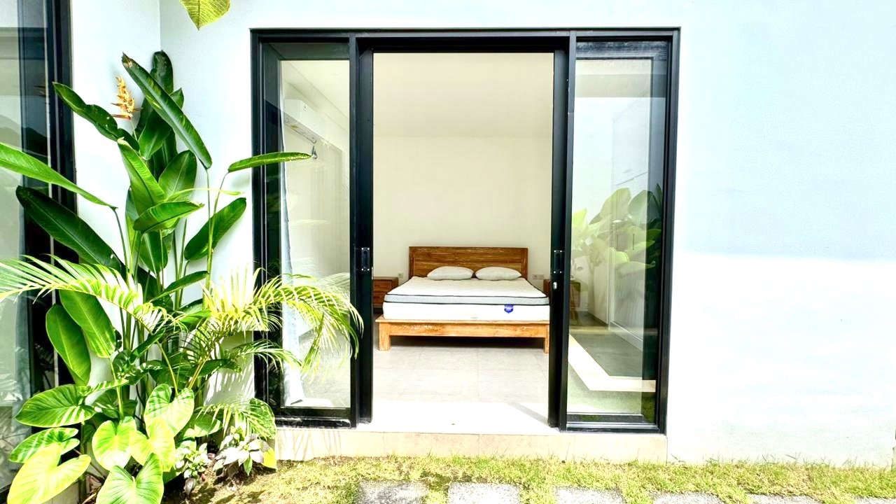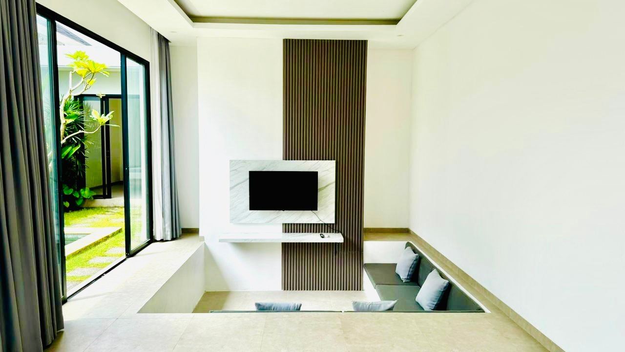 The villa features a tropical-modern architectural style with abundant natural light flowing throughout the living spaces. Its thoughtfully designed interior creates a calm, relaxing, and aesthetically pleasing home atmosphere perfect for expats, digital nomads, or couples seeking comfort and tranquility in Bali.
