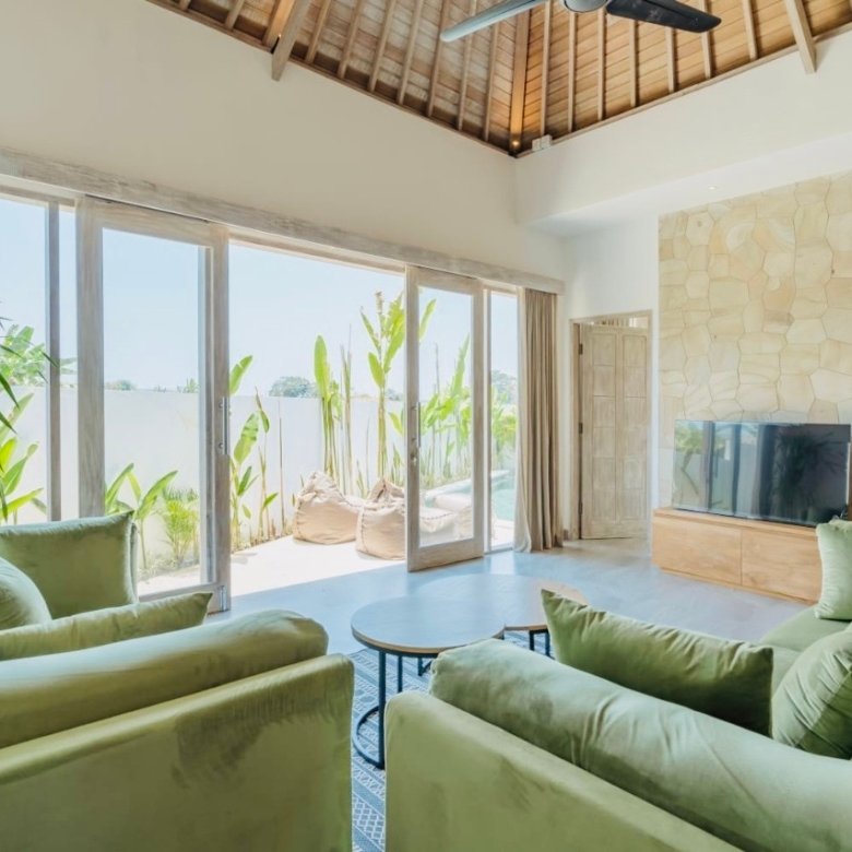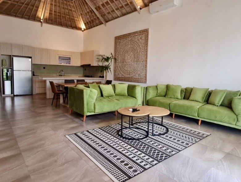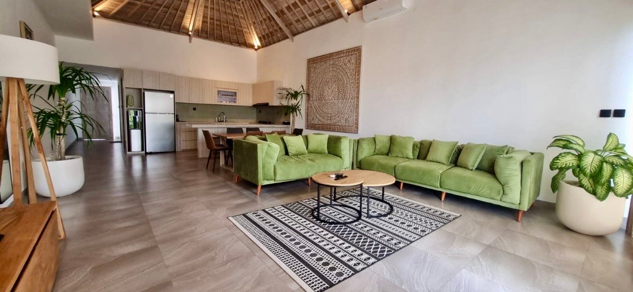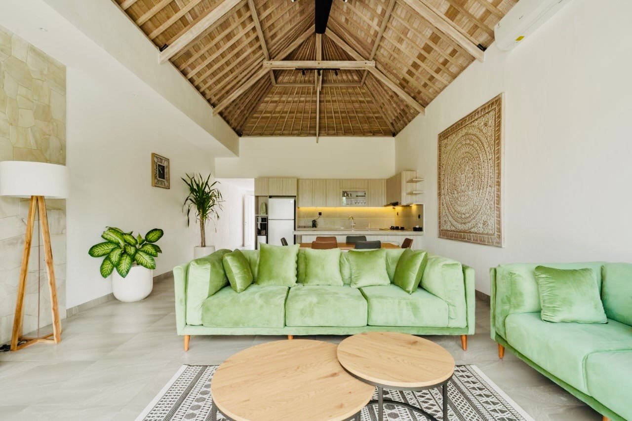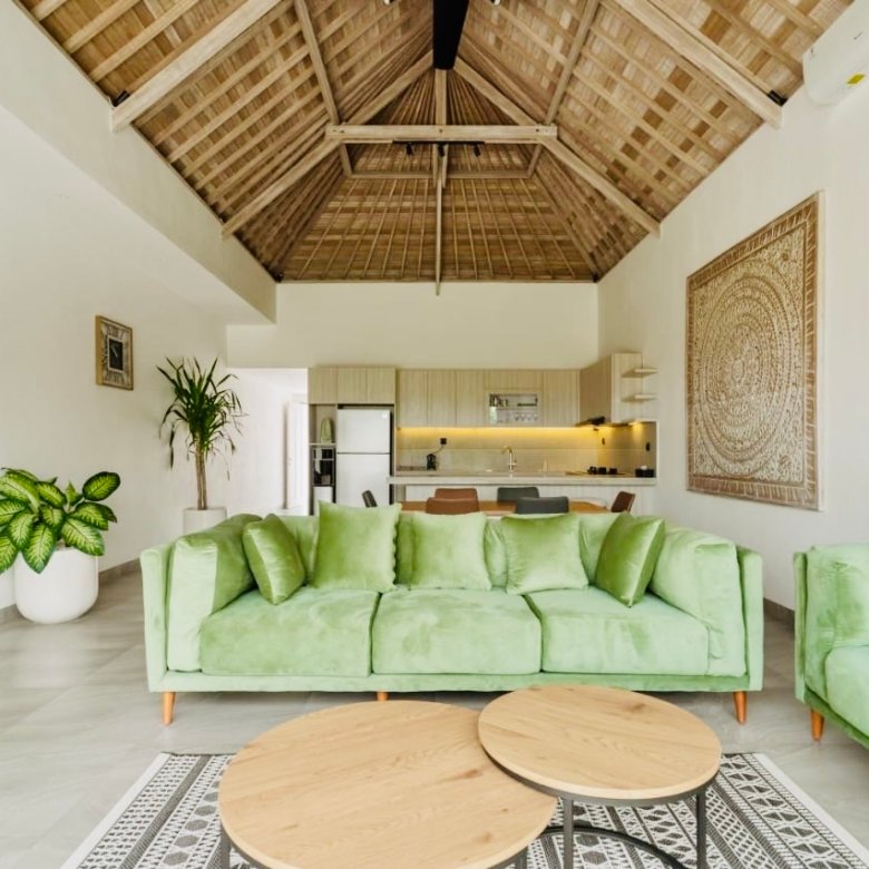 This villa features a tropical-modern minimalist design with high traditional Balinese wooden ceiling,bright natural light throughout the space.The interior creates a calm, relaxing, and aesthetic home atmosphere — perfect for expats, digital nomads, or couples looking for comfort.