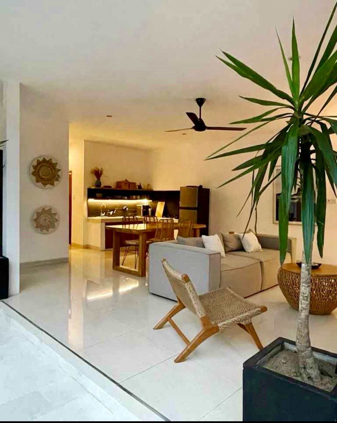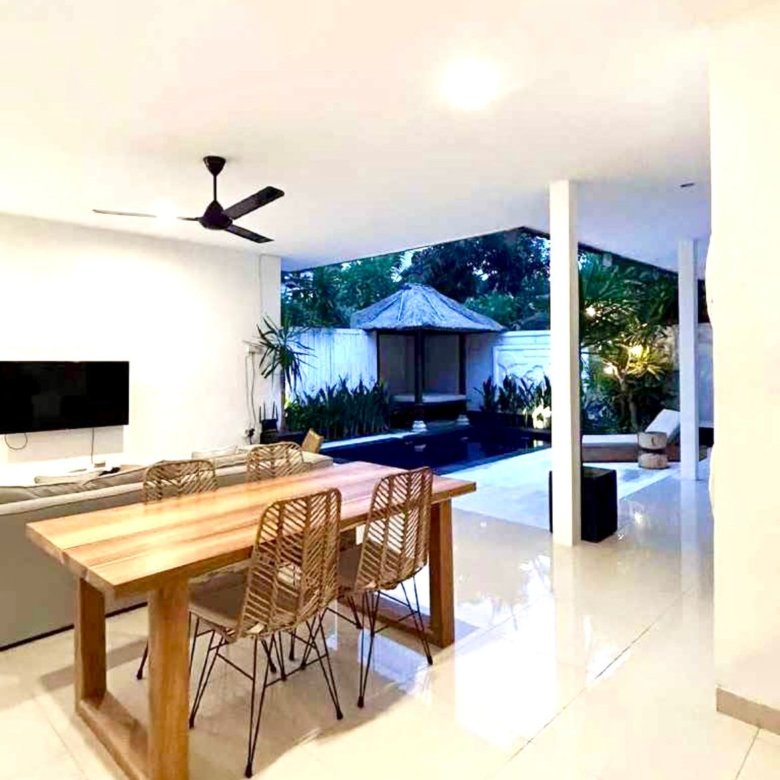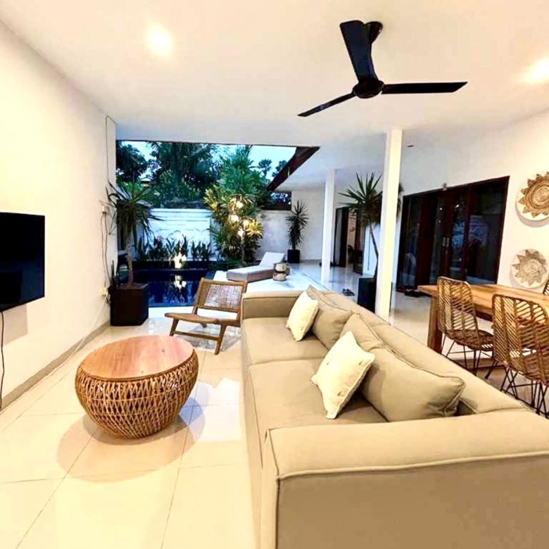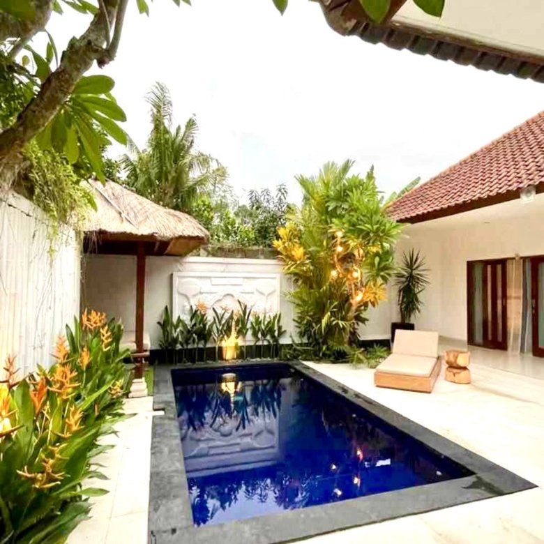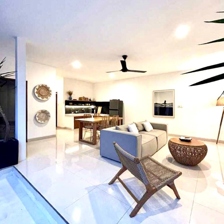 Designed with a blend of traditional Balinese architecture and modern minimalist touches, the villa features an open living concept that seamlessly connects the indoor space with a private swimming pool, creating a calm and relaxing tropical atmosphere.
