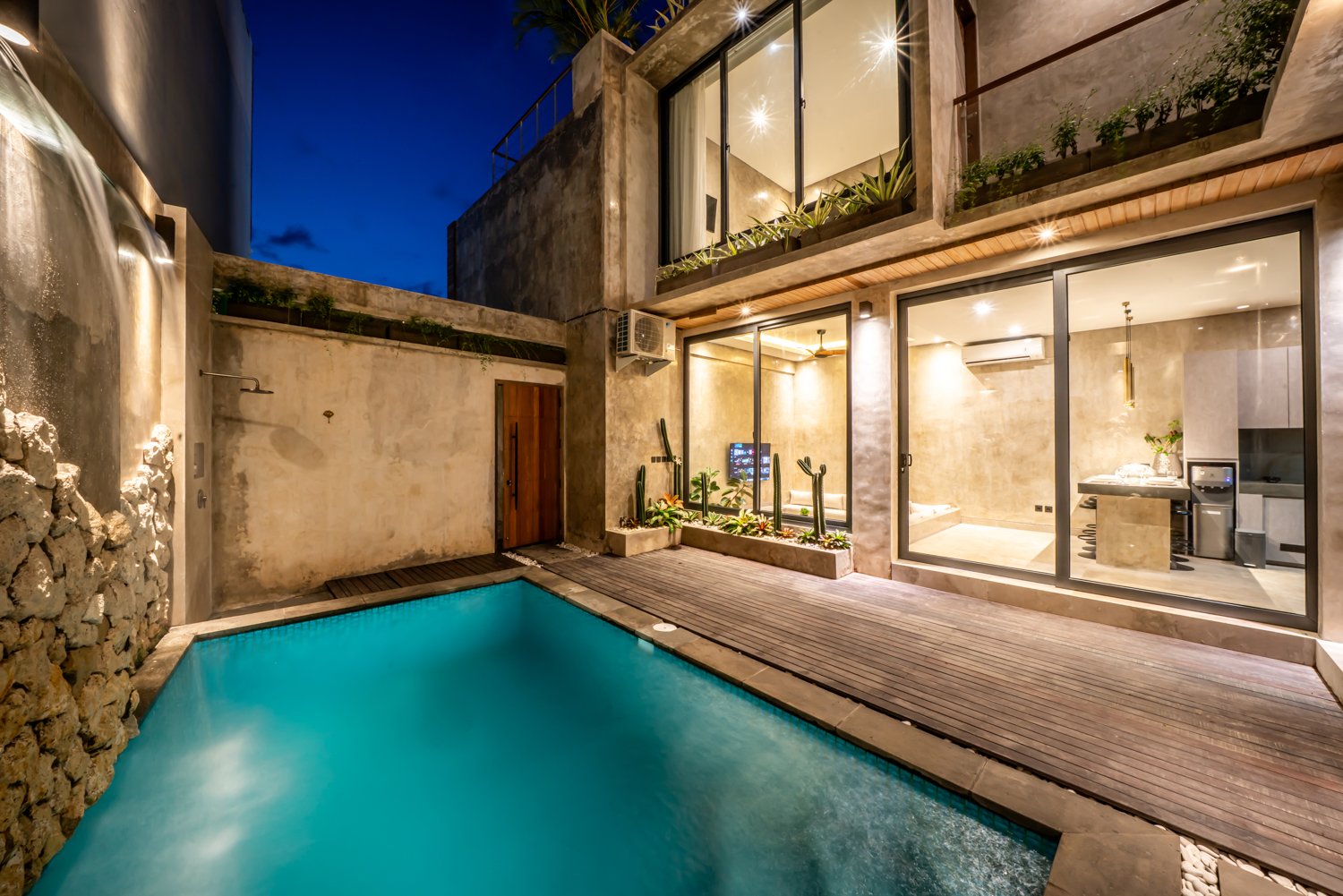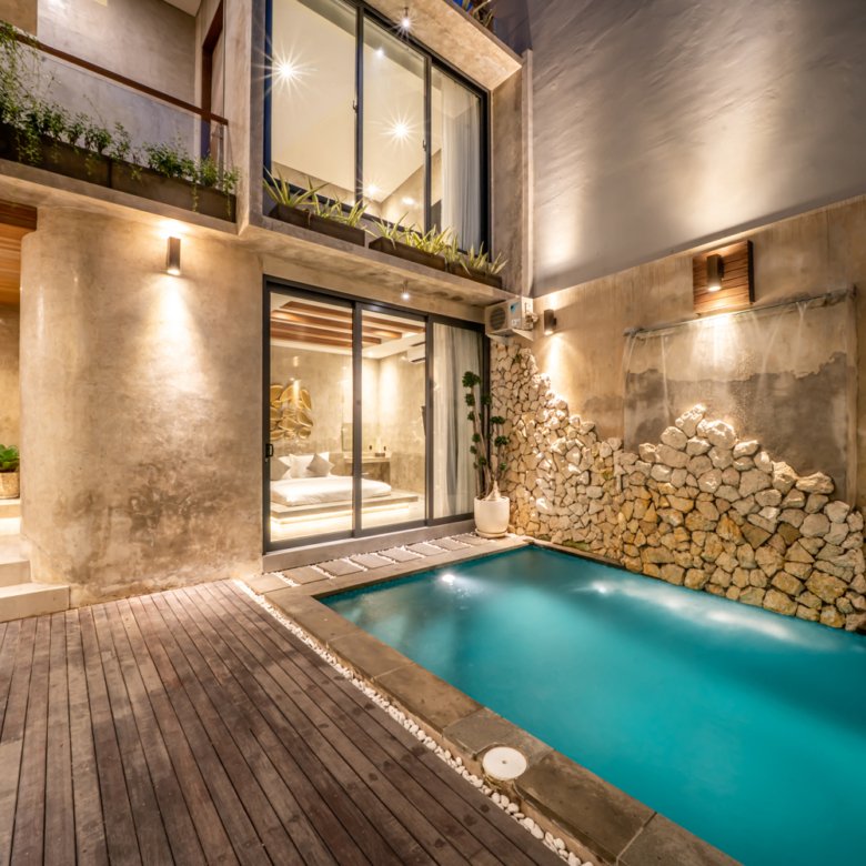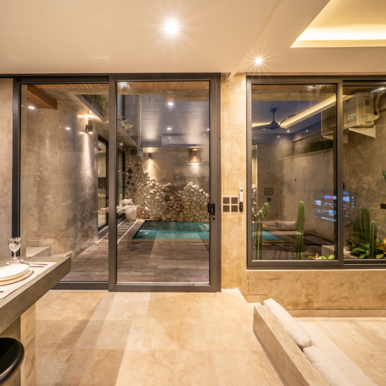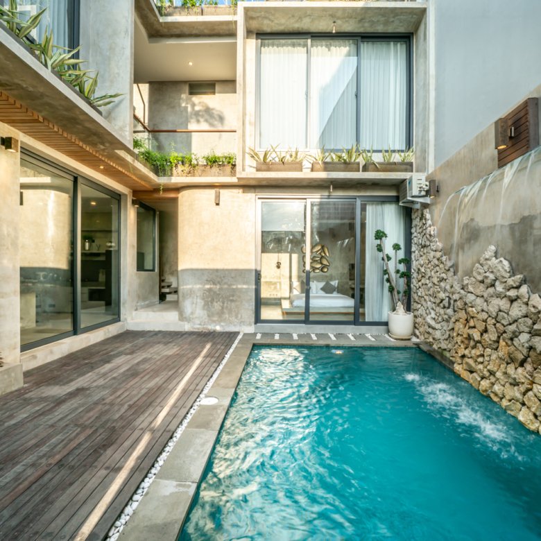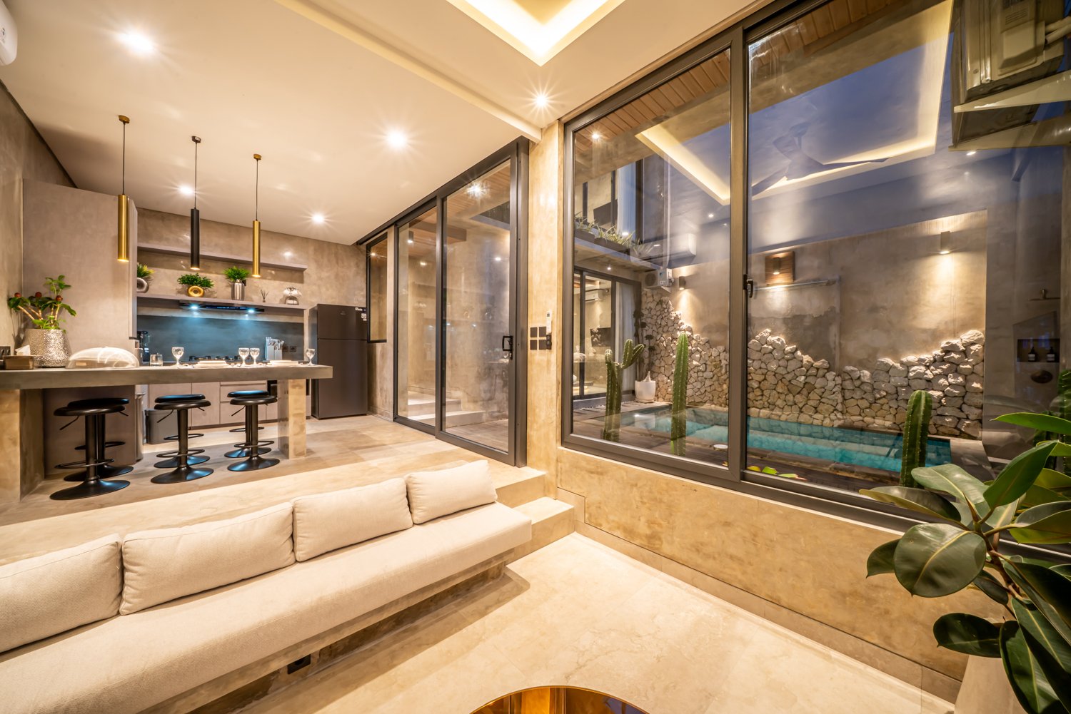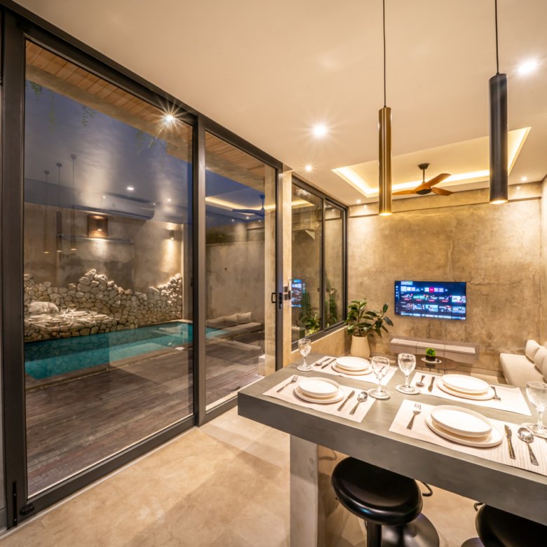 This modern industrial villa in Canggu Kayu Tulang is immediately available for yearly rent. The property features a two-story layout plus a rooftop area, offering views of the private pool and the surrounding residential neighborhood. Located in a prime spot, the villa is conveniently situated near popular places like Joomba Smoothies and Bali Social Club for Padel and Wellness, and is only a 5-minute bike ride to Echo Beach.