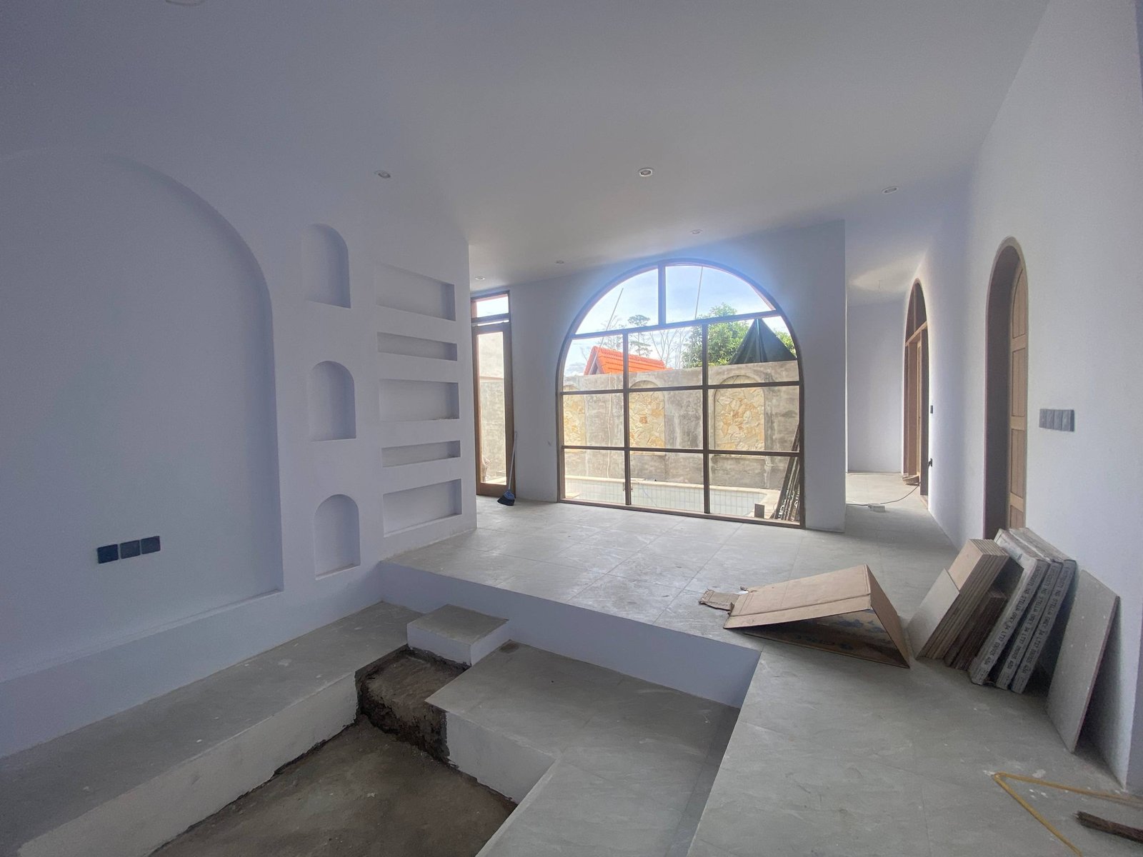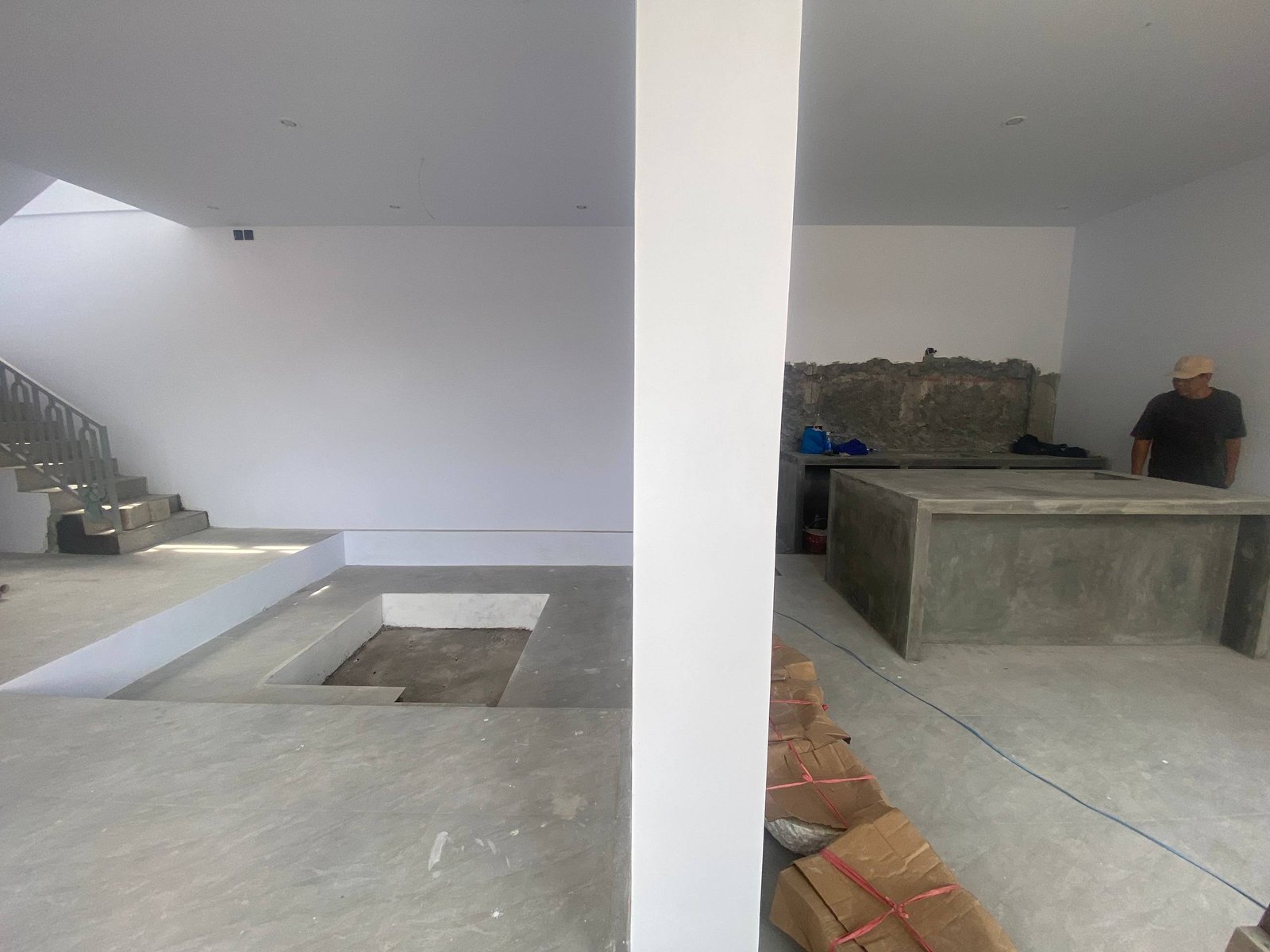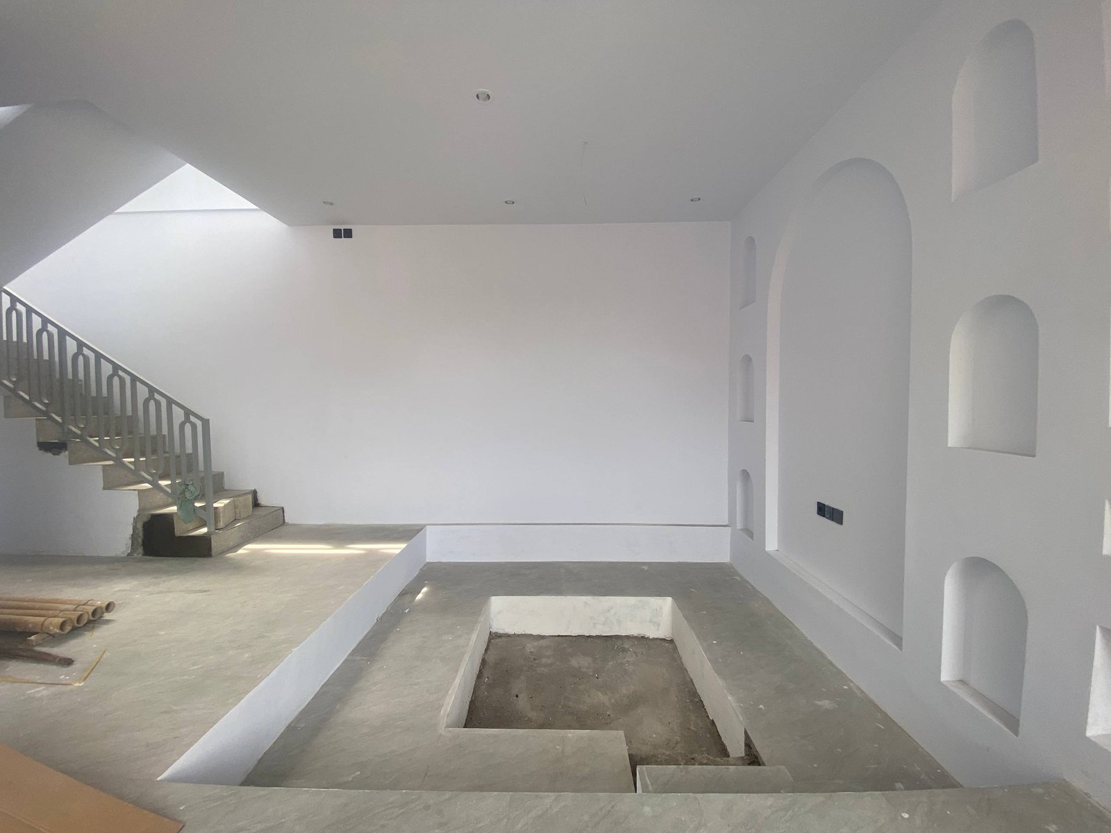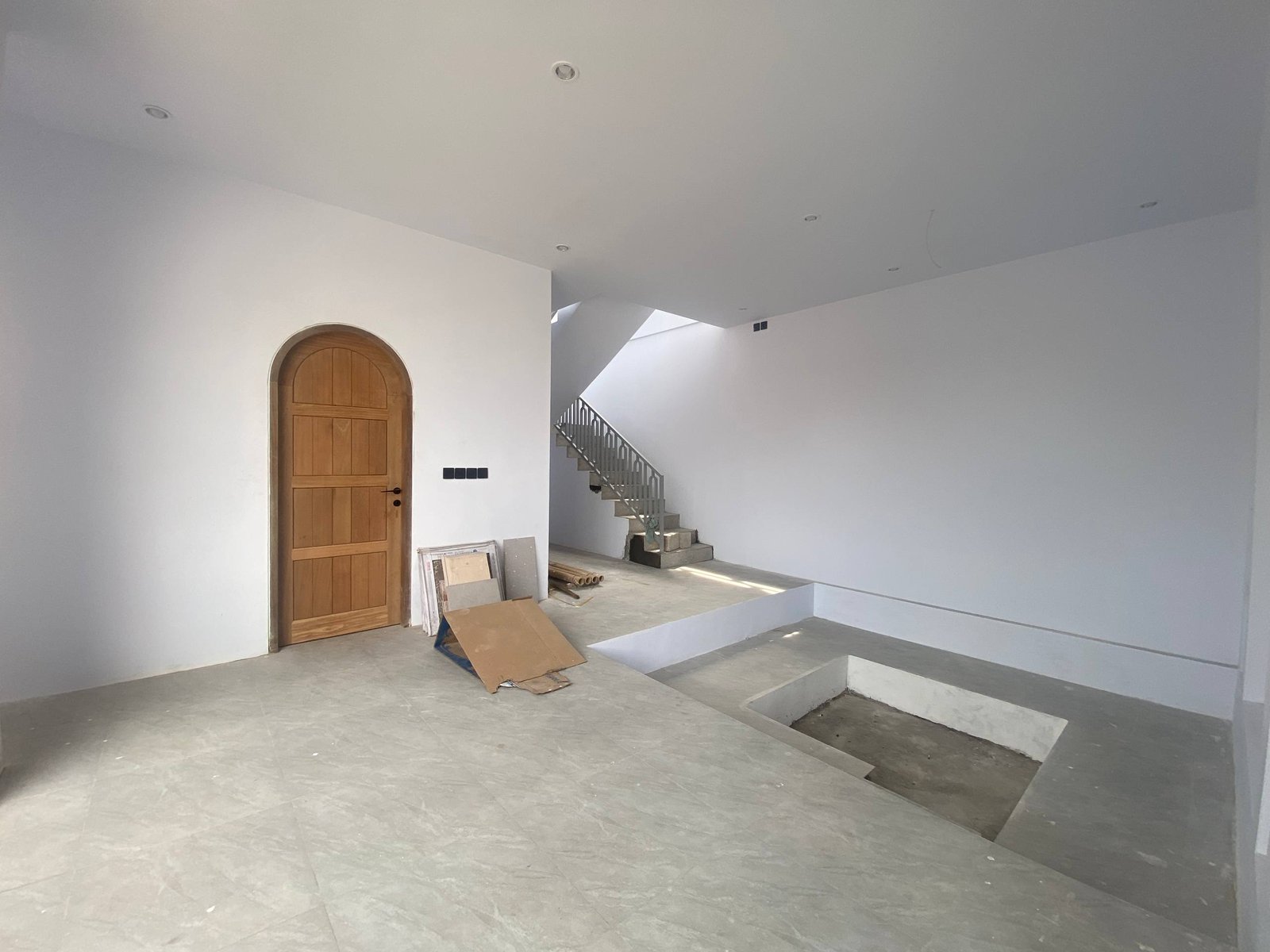 This modern rental villa, one of two units with the same layout (Villa B), is located in the Padang Linjong area and requires a minimum lease of two years. It is currently under construction at about 80% completion and is expected to be finished by the end of November 2025. The villa offers views of the pool, surrounding residential area, and a nearby river. Its excellent location is close to Mustache Coffee Bali and is just a 5-minute drive to both Echo Beach and La Brisa Beach Club.