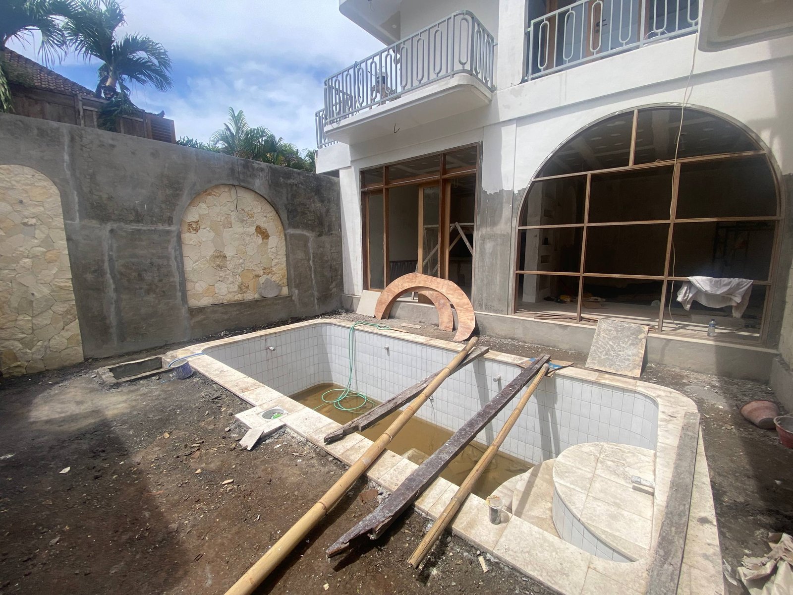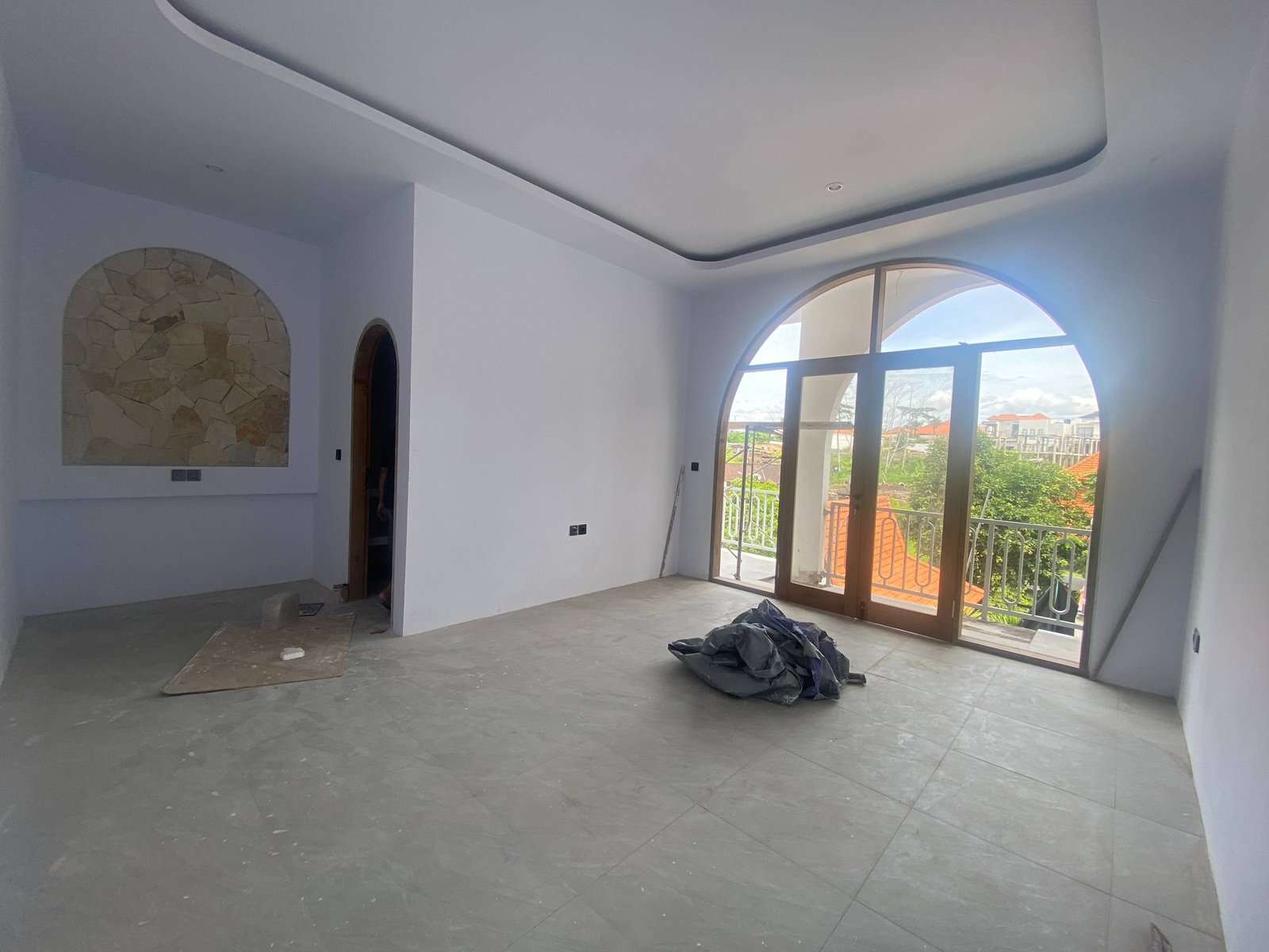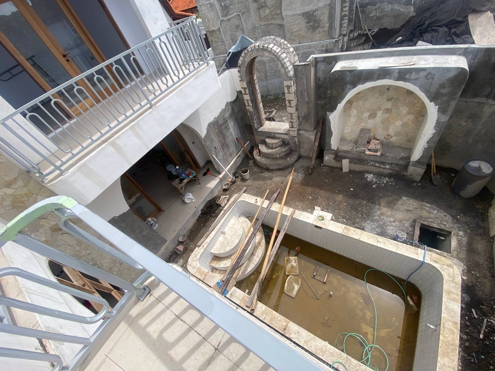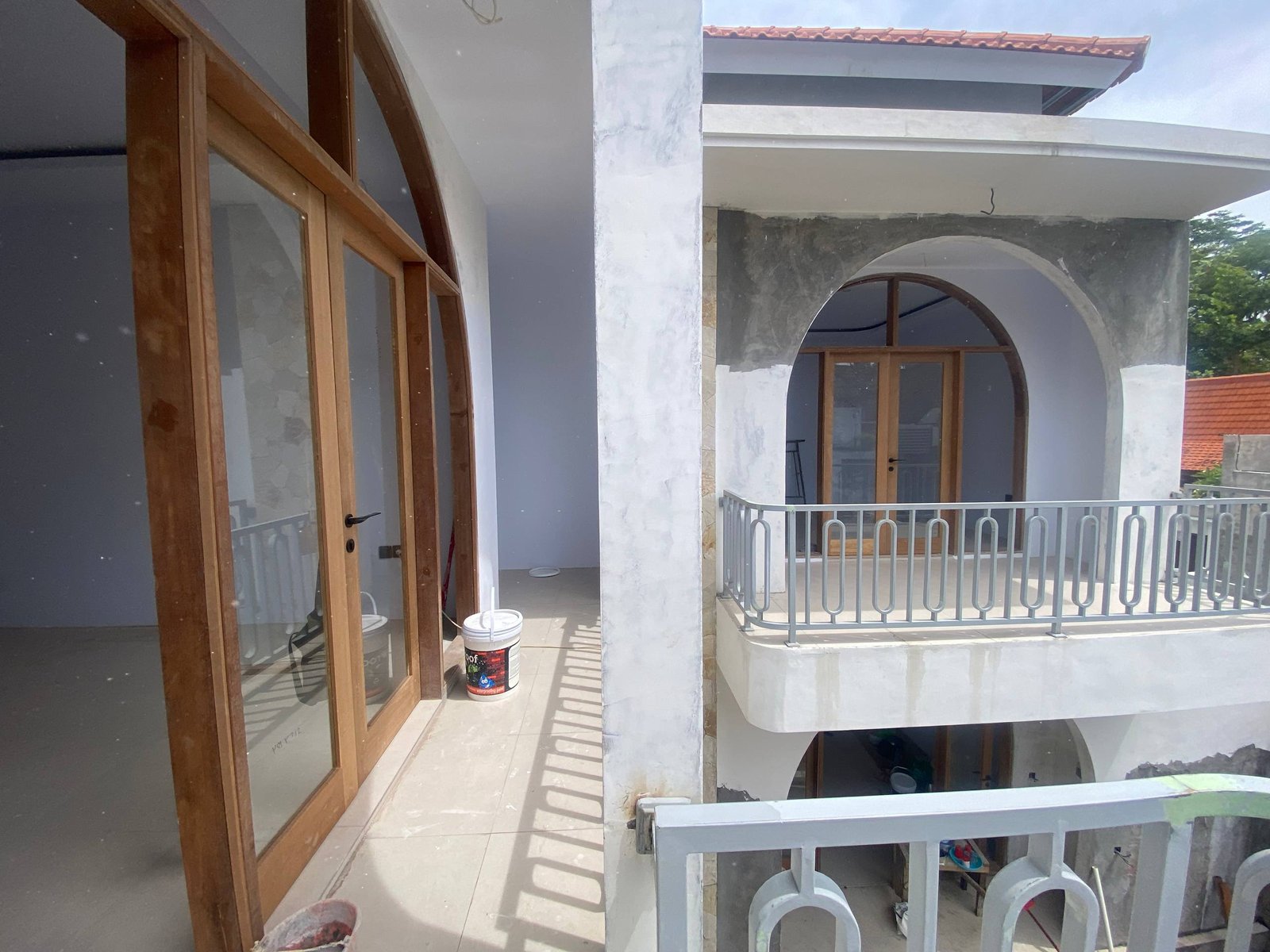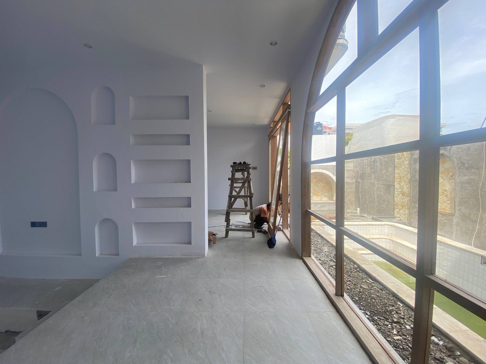 This modern rental villa, one of two units with the same layout (Villa B), is located in the Padang Linjong area and requires a minimum lease of two years. It is currently under construction at about 80% completion and is expected to be finished by the end of November 2025. The villa offers views of the pool, surrounding residential area, and a nearby river. Its excellent location is close to Mustache Coffee Bali and is just a 5-minute drive to both Echo Beach and La Brisa Beach Club.