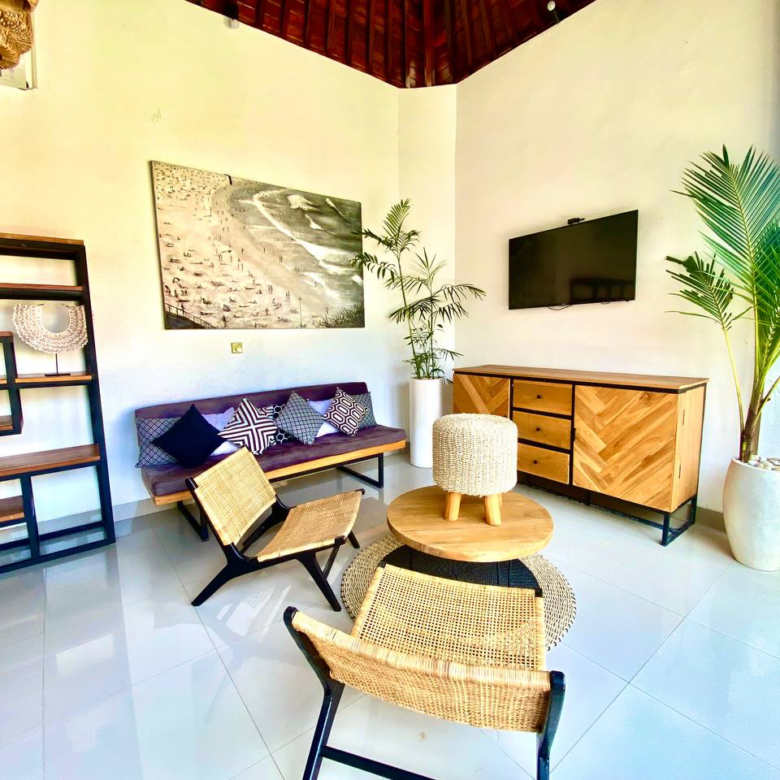 Located in the serene area of Umalas, Kerobokan, this charming villa, code ADE457, will be available from mid-September 2024. Built in 2022, the property sits on 340 sqm of land and offers a spacious 250 sqm of living space. It features 3 well-appointed bedrooms and 3 bathrooms, with an additional toilet in the storage area. The villa is fully furnished and includes 4 air conditioning units, ensuring comfort throughout the year.