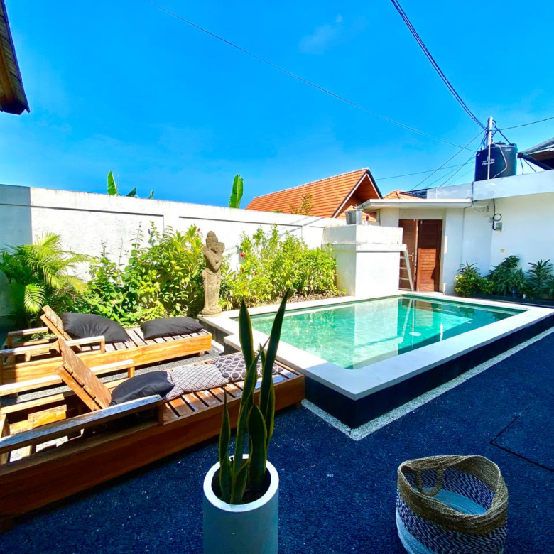 For added convenience, the villa offers parking for one car and a bike, and it is pet-friendly, making it an ideal choice for families. Situated near Nook Restaurant and Petitenget Beach, this villa combines modern living with easy access to popular amenities. Available for a minimum one-year lease at IDR 378,000,000 per year, this villa presents an excellent opportunity for luxurious living in a prime location.
