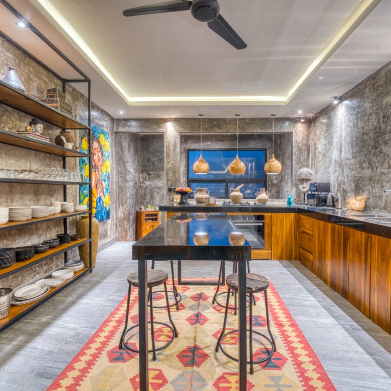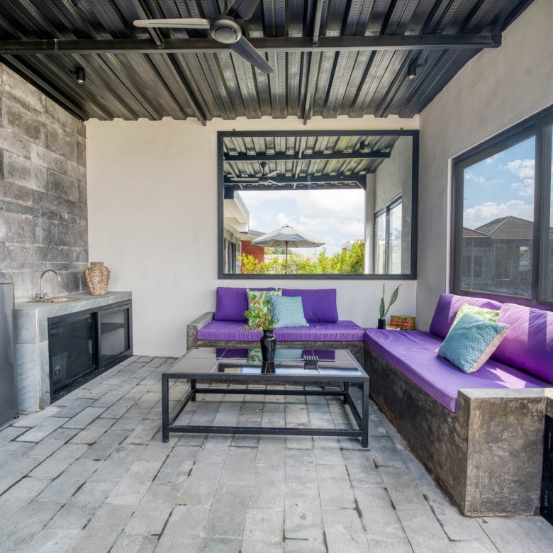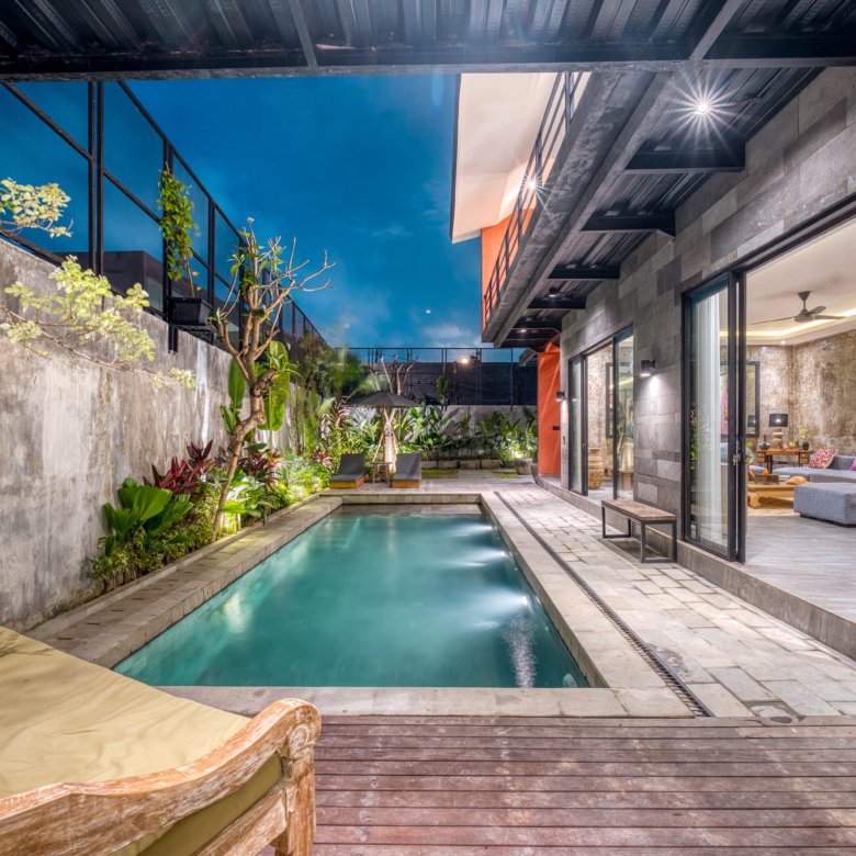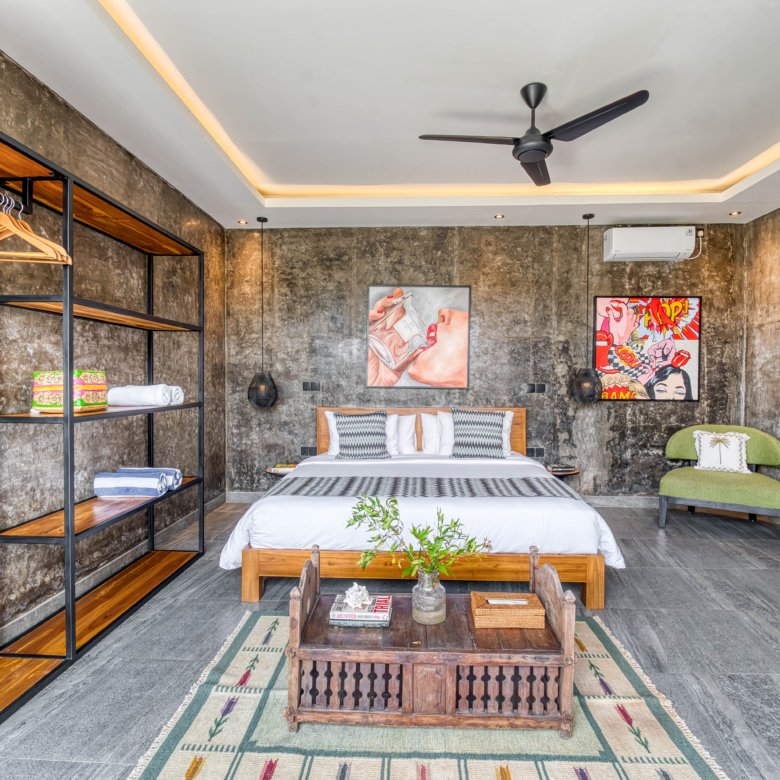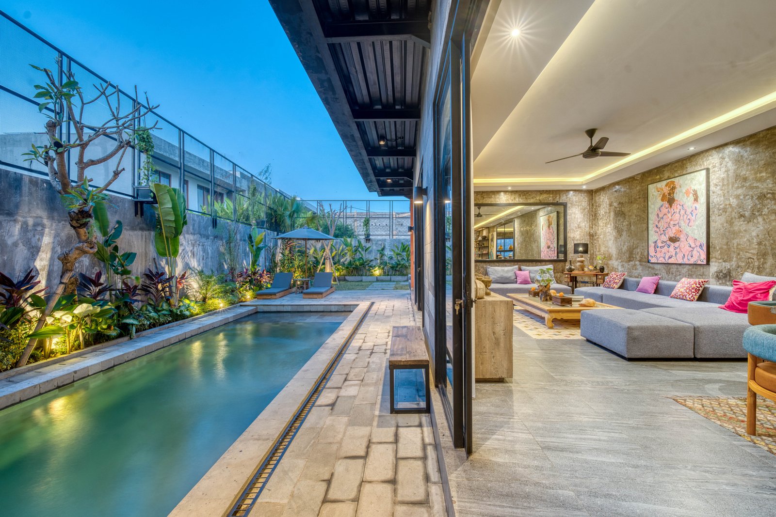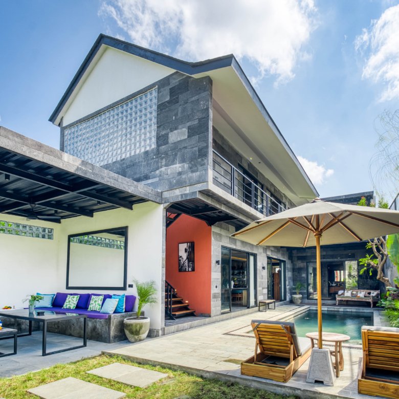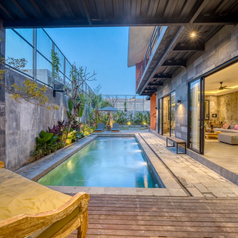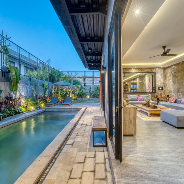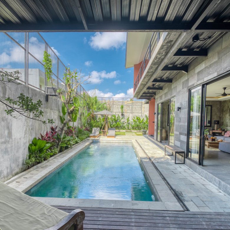 Modern industrial-tropical style, fully-furnished 5 bedroom luxury villa in the heart of Berawa, 5mins from the beach Very quiet area of Berawa, surrounded by rice fields, in walking distance to restaurants, beach clubs, yoga studios and gyms in close proximity to international schools, padel and tennis courts.