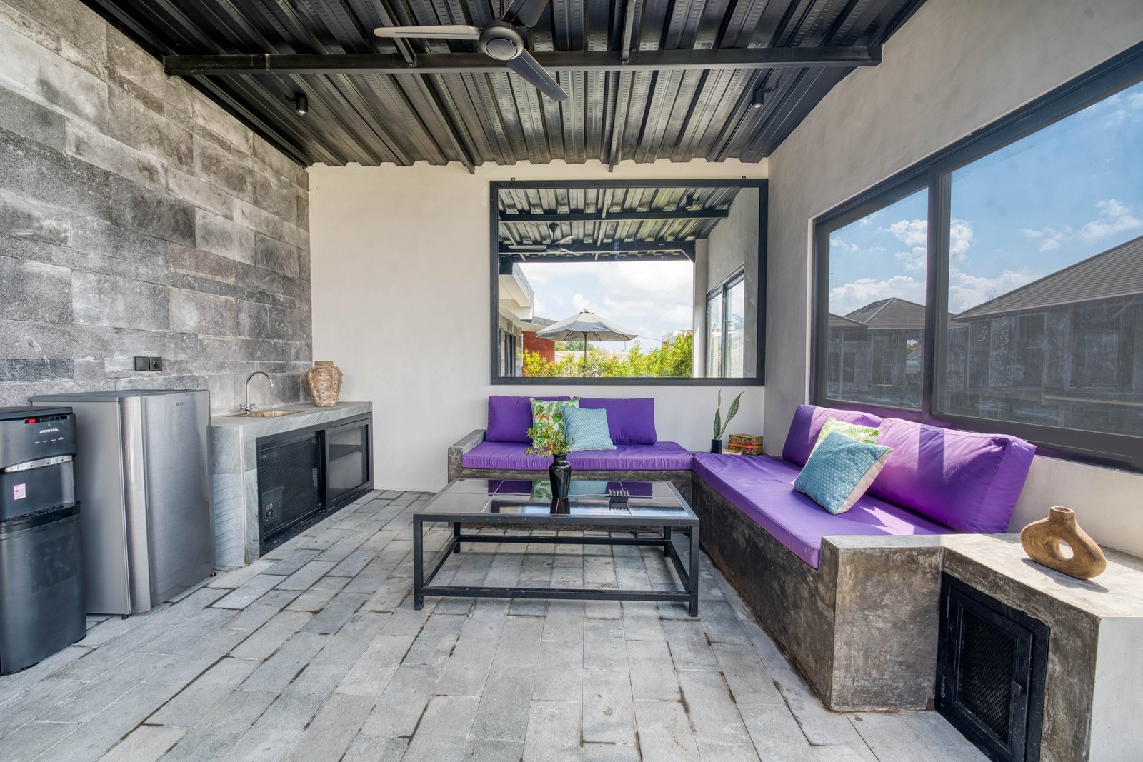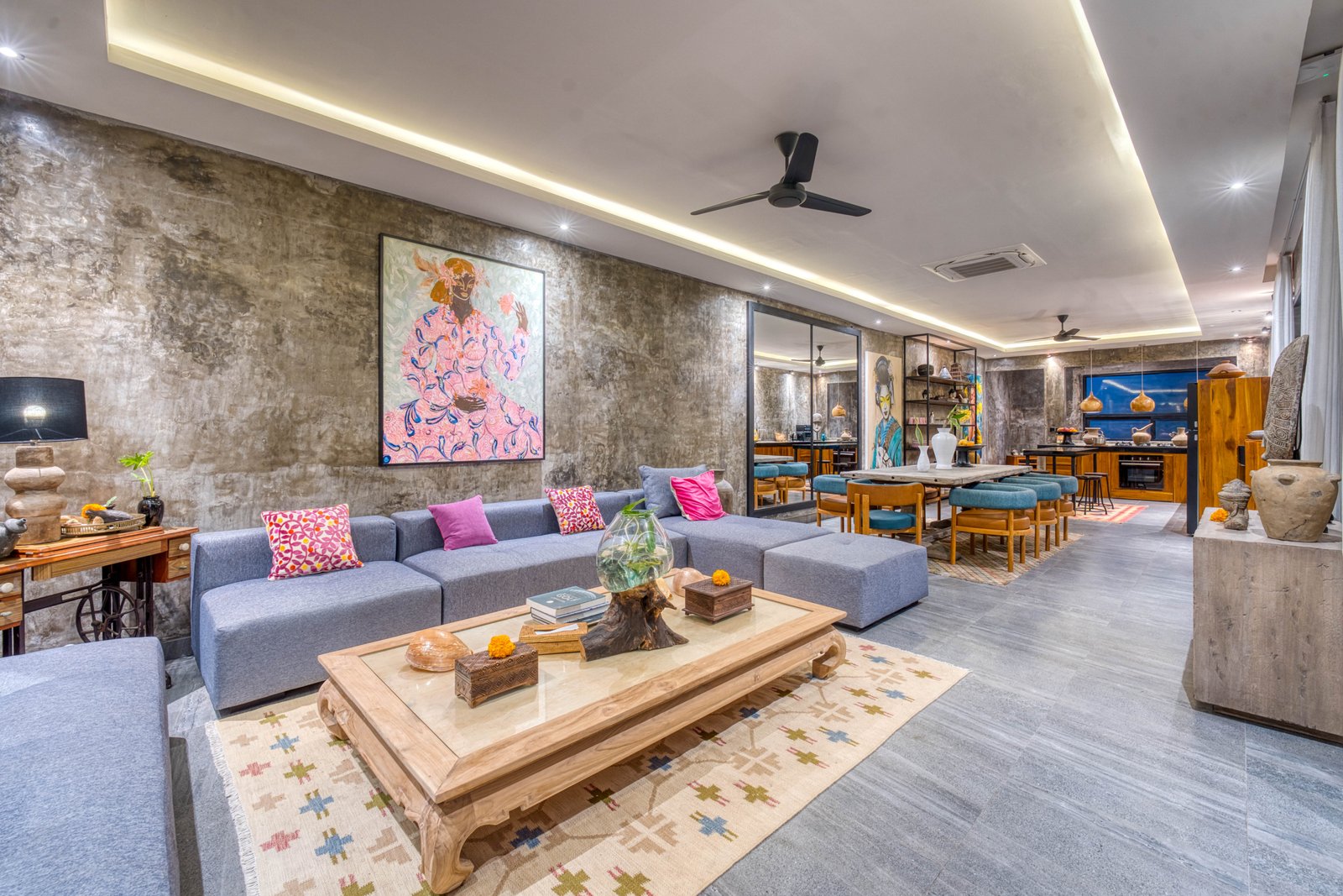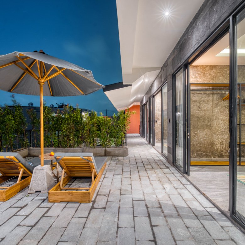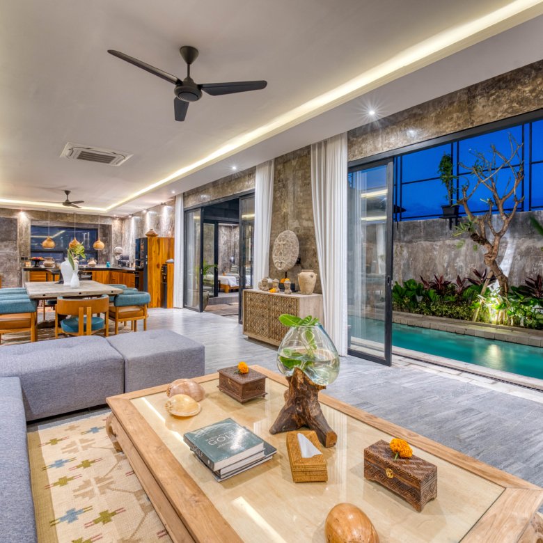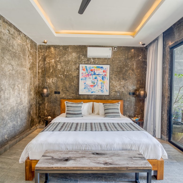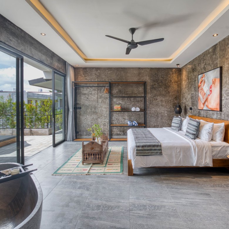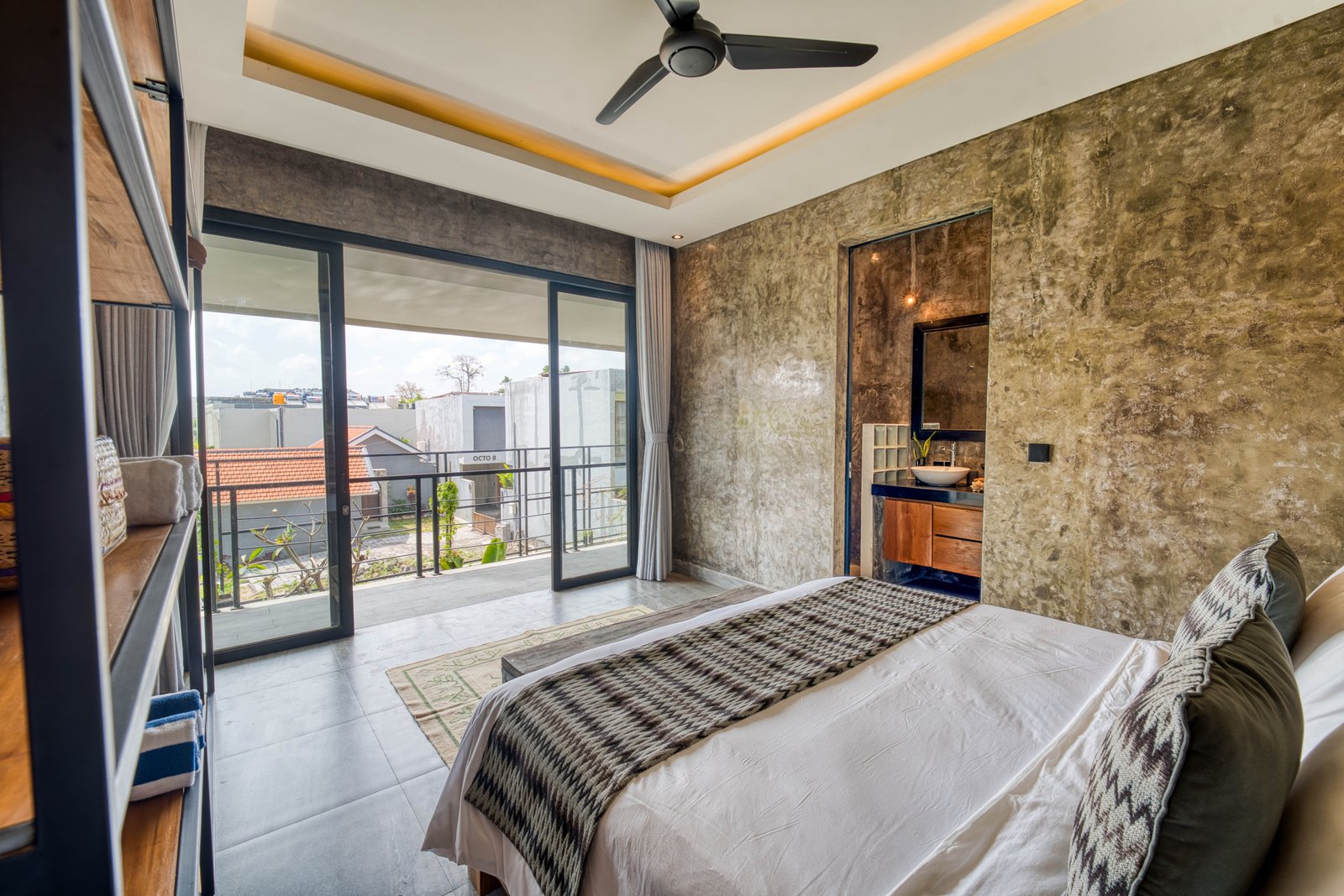 Modern industrial-tropical style, fully-furnished 5 bedroom luxury villa in the heart of Berawa, 5mins from the beach Very quiet area of Berawa, surrounded by rice fields, in walking distance to restaurants, beach clubs, yoga studios and gyms in close proximity to international schools, padel and tennis courts.