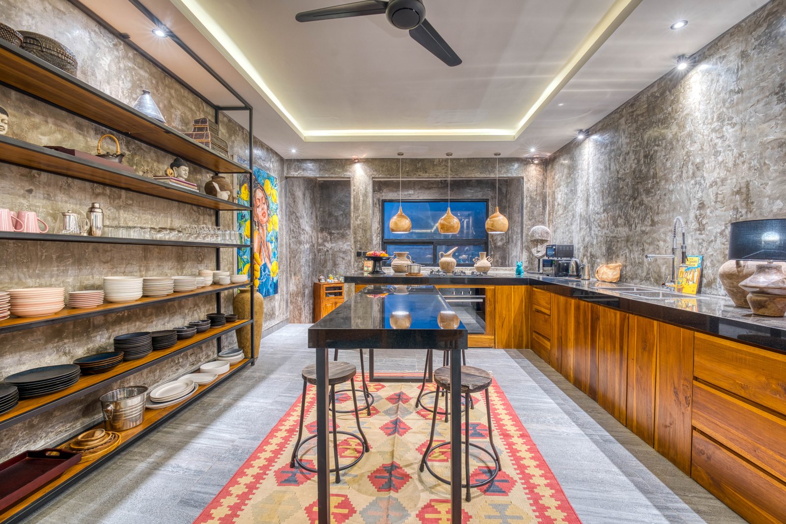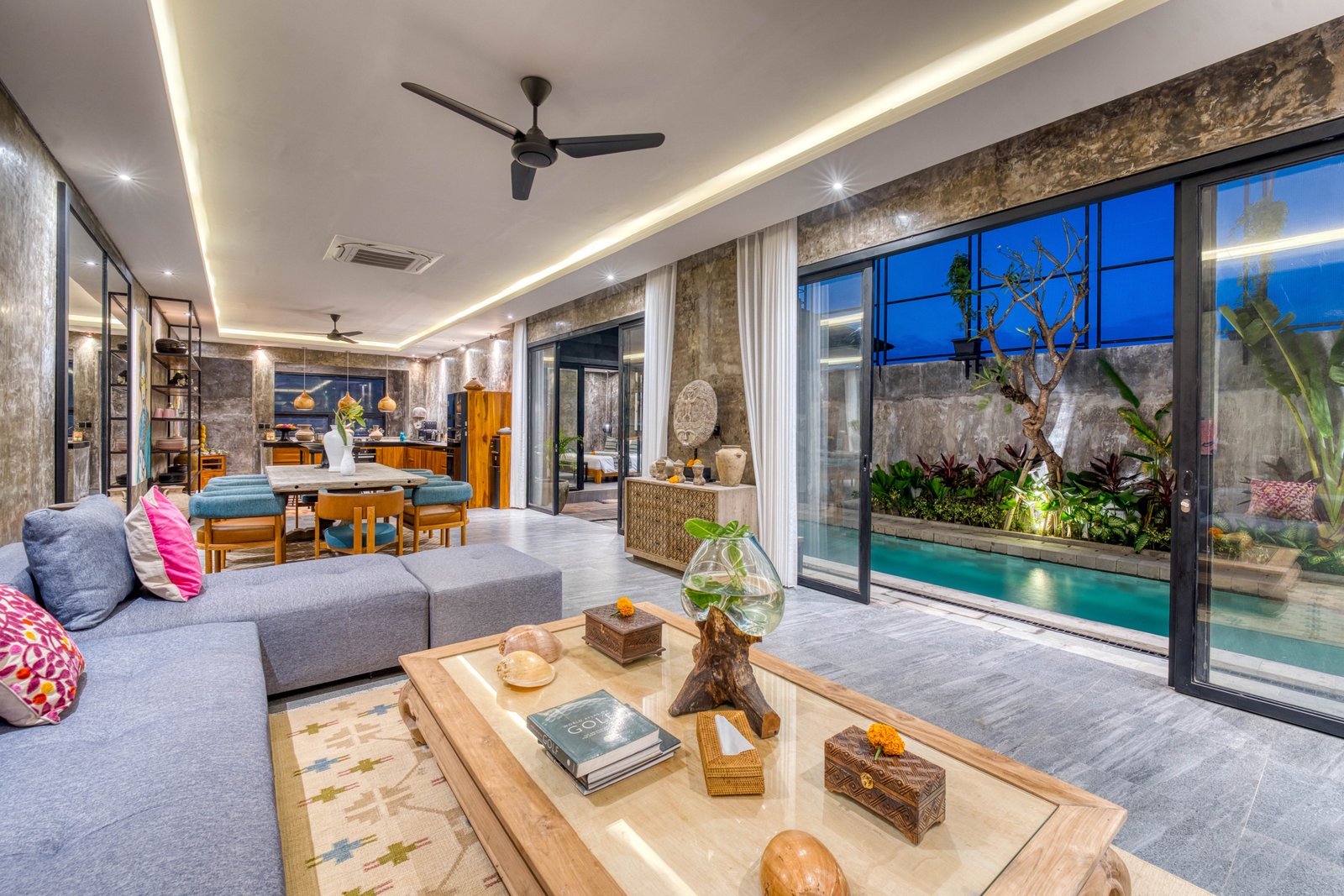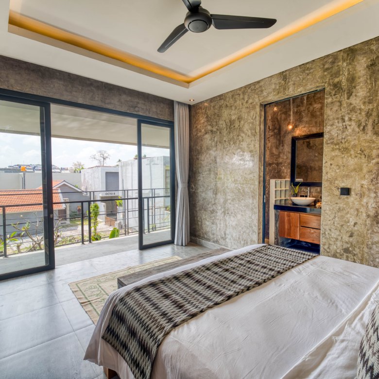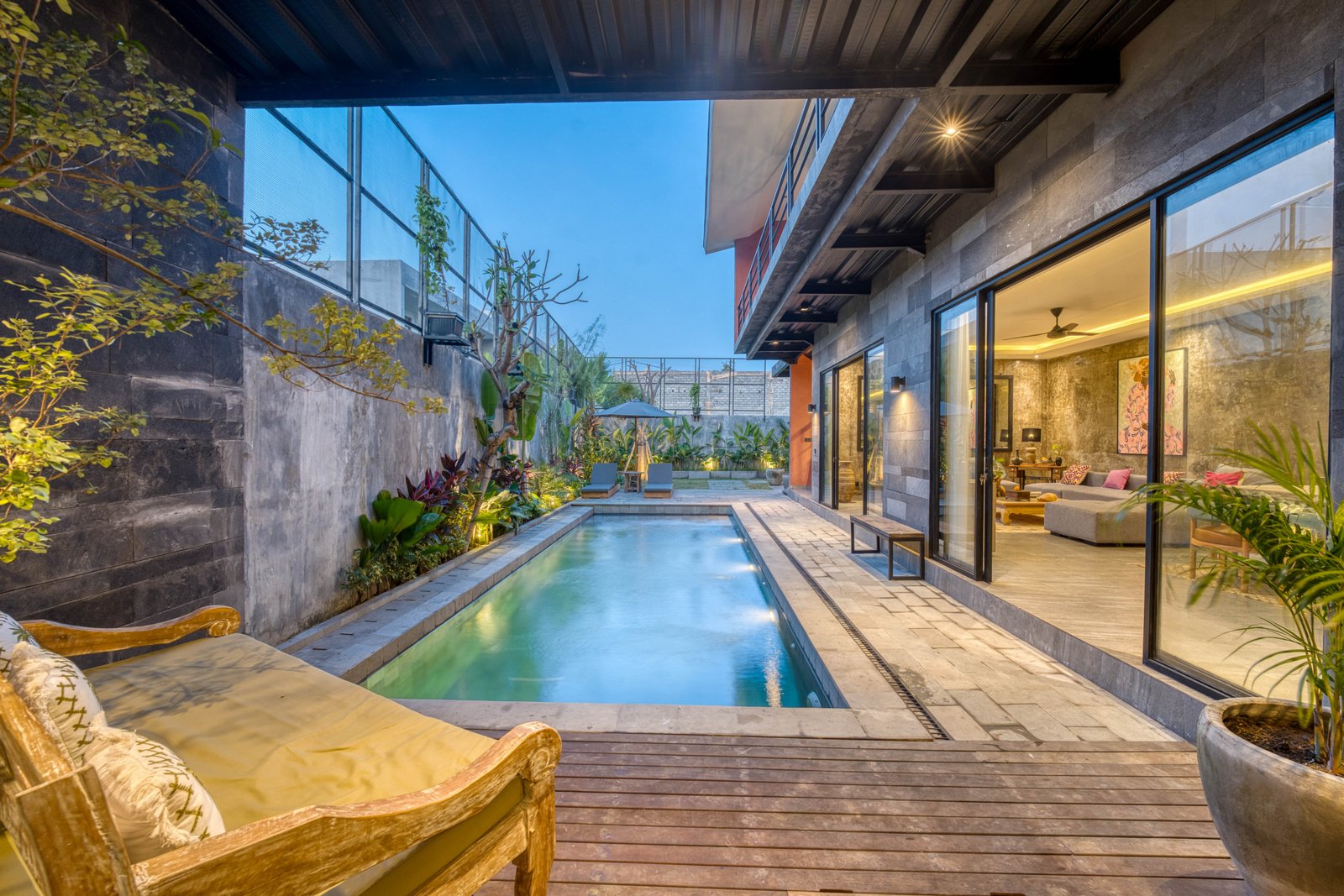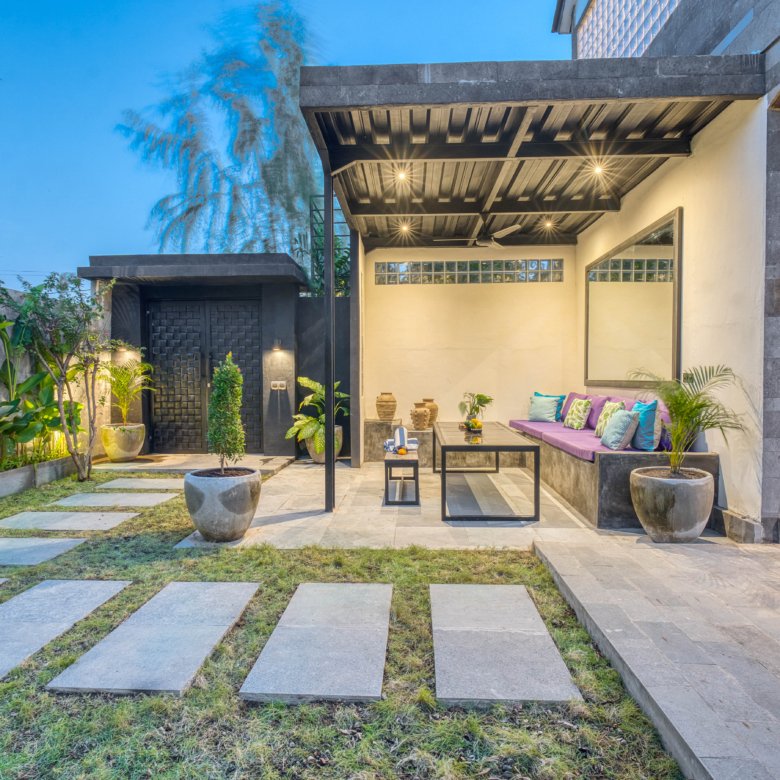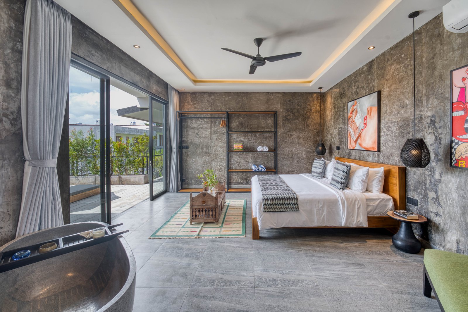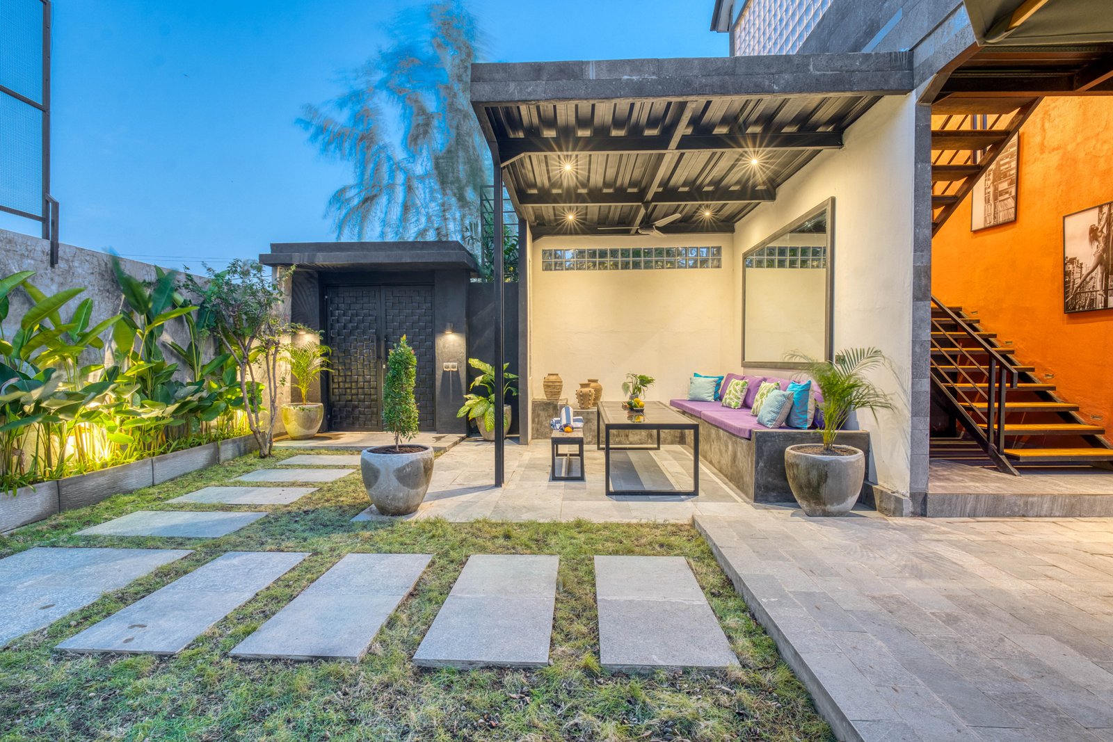 Modern industrial-tropical style, fully-furnished 5 bedroom luxury villa in the heart of Berawa, 5mins from the beach Very quiet area of Berawa, surrounded by rice fields, in walking distance to restaurants, beach clubs, yoga studios and gyms in close proximity to international schools, padel and tennis courts.
