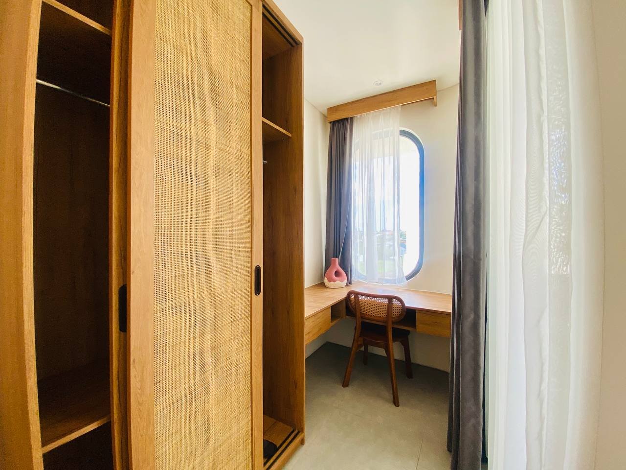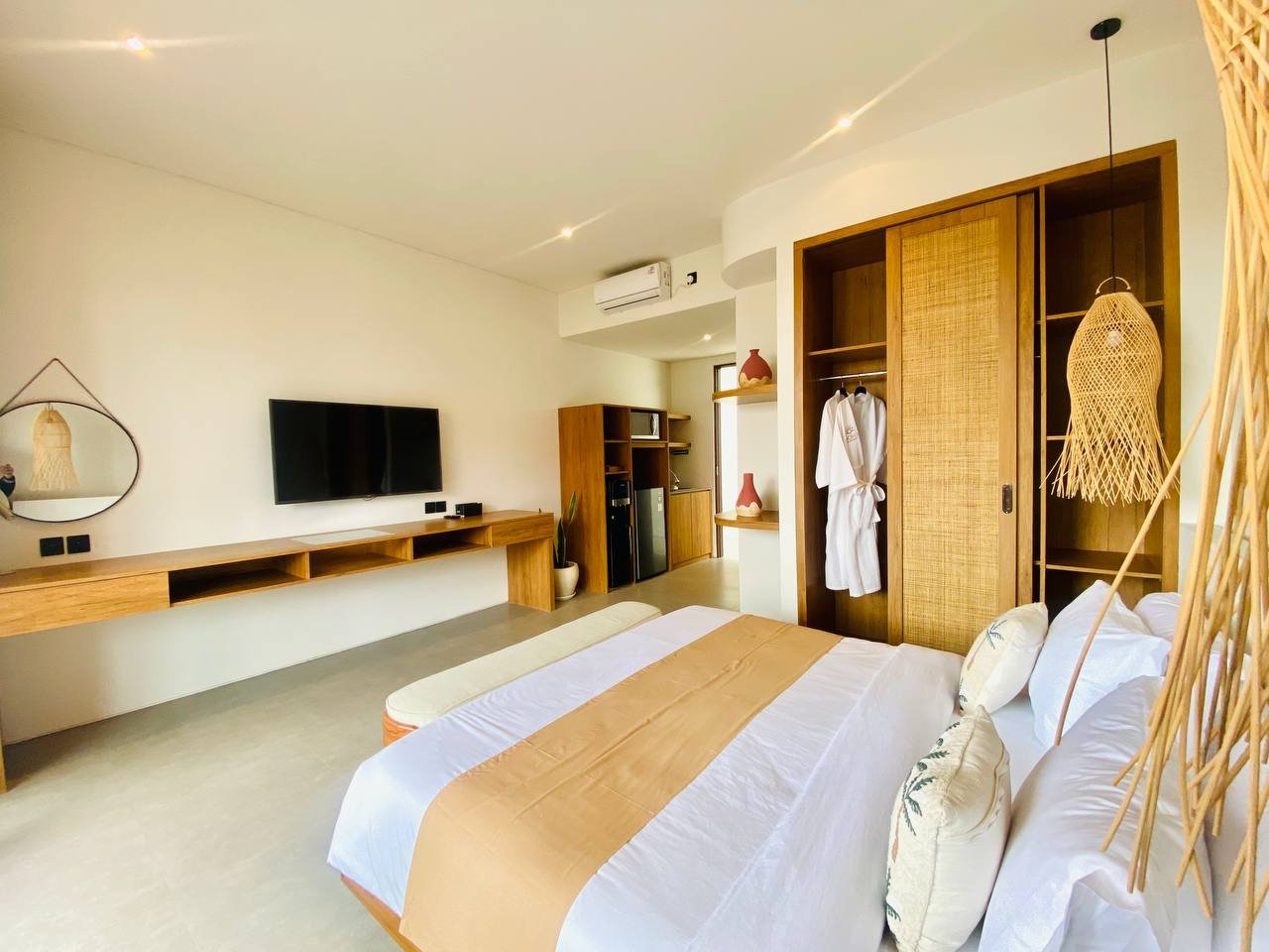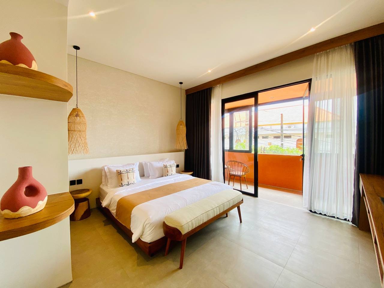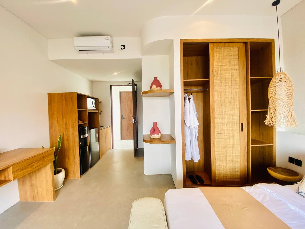 This studio apartment building, available for yearly rent, is located in the Pererenan Sempol area and is ready for immediate occupancy. It features a unique Maroccan-style design and is surrounded by popular spots like obsidian, day by day caffe, and elite fit. There are seven studio units situated on the third floor: four units offer a street view, and three units overlook the pool. Residents benefit from shared facilities including a shared washing machine on the second floor, a shared living room on the third floor, a shared pool on the ground floor, and a shared cooking area on the first floor.