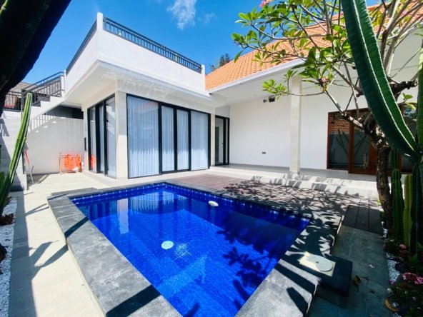 The villa features two bedrooms with en-suite bathrooms, a private 3 x 6.5-meter swimming pool, and a lush garden. Additional amenities include a storage room, two air conditioning units, a fan, a water heater, and a kitchen set. Parking space is available for cars and bikes, supported by a 5500 KWH electricity connection and a reliable bore water supply. Available for a minimum 2-year lease at IDR 225,000,000 per year, this villa offers excellent value for long-term rental. Contact us today to schedule a viewing or to discuss long-term leasing options!