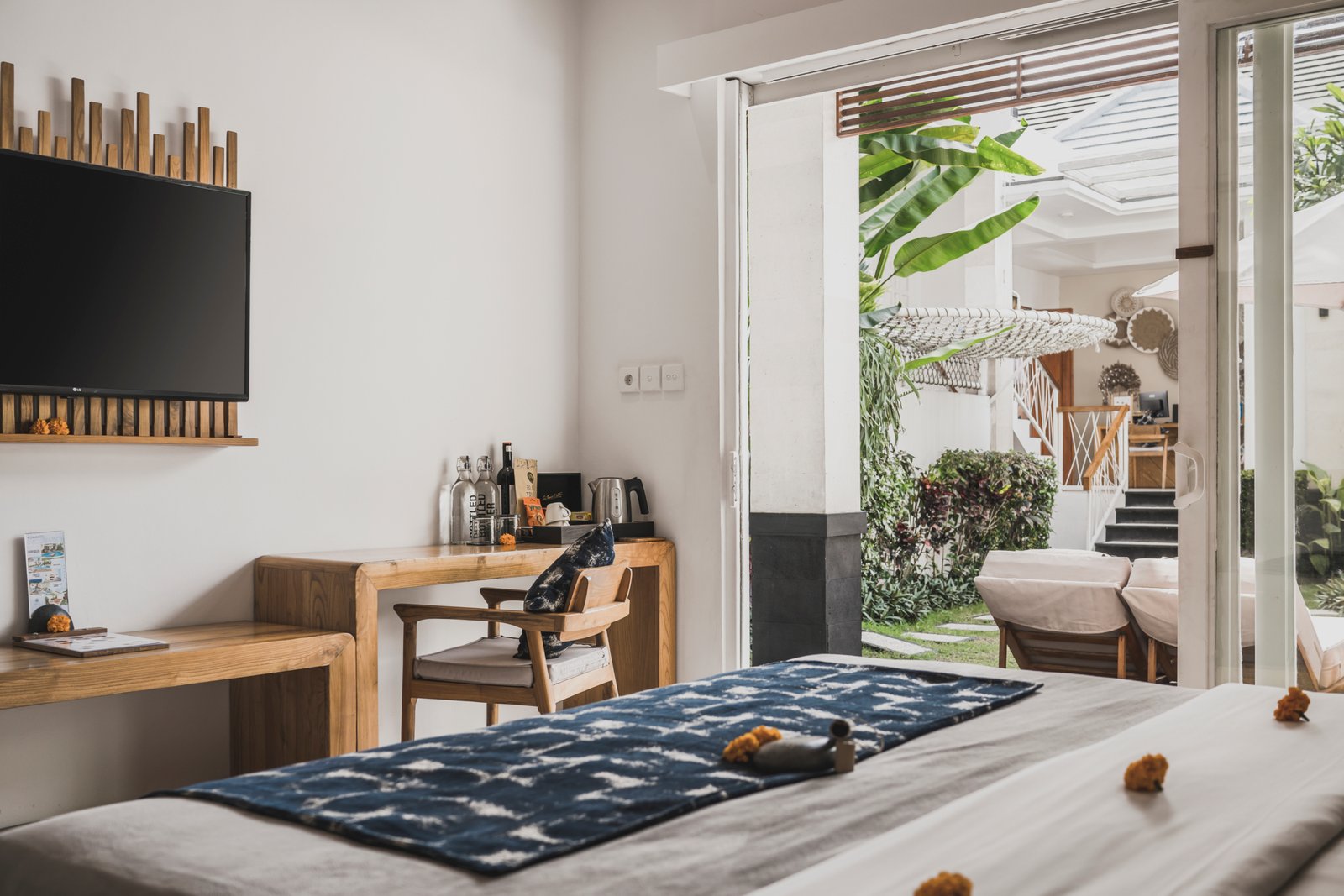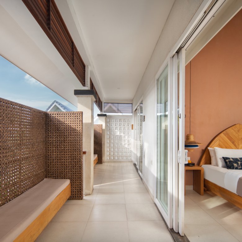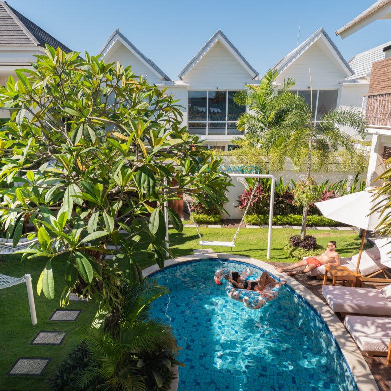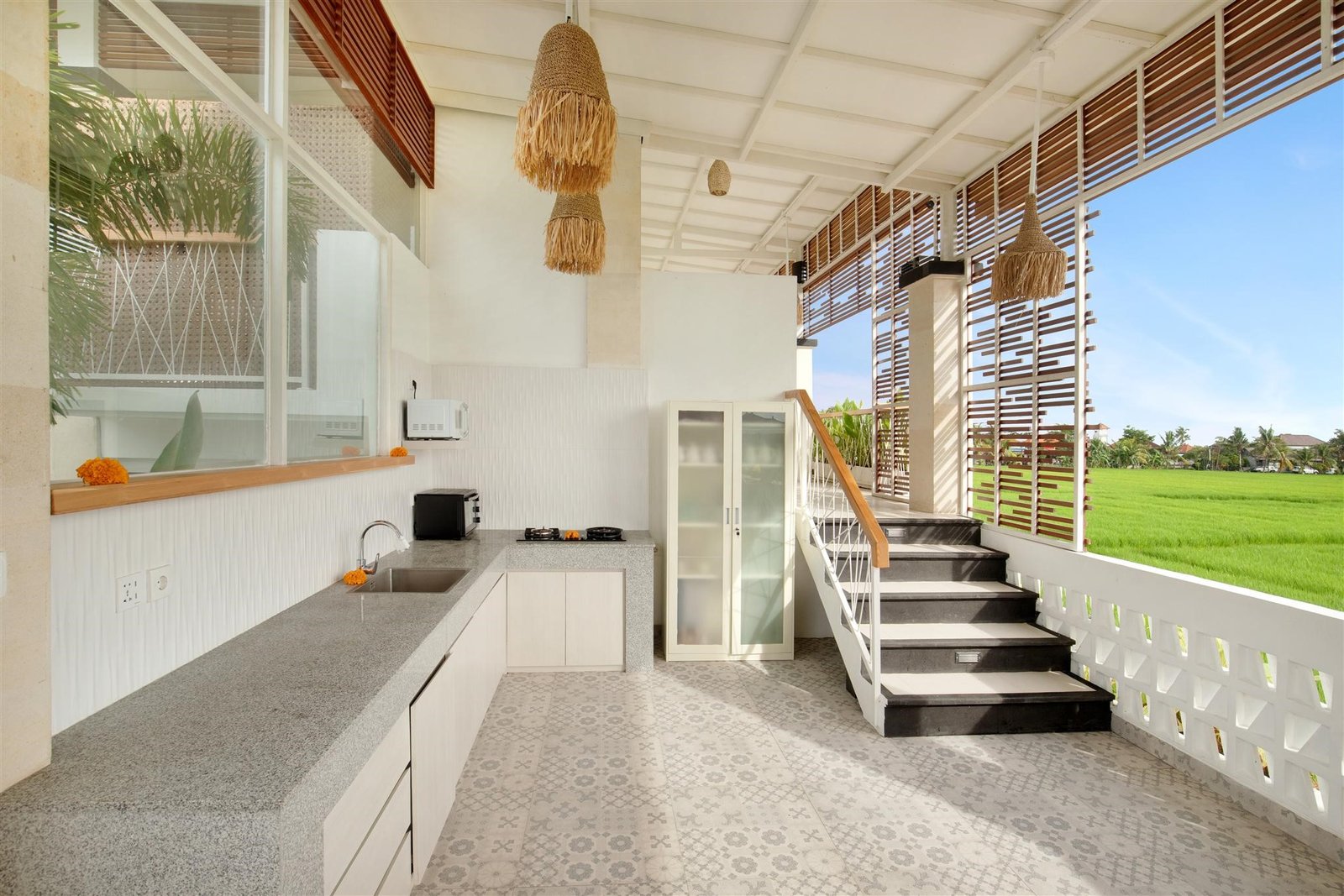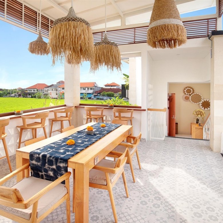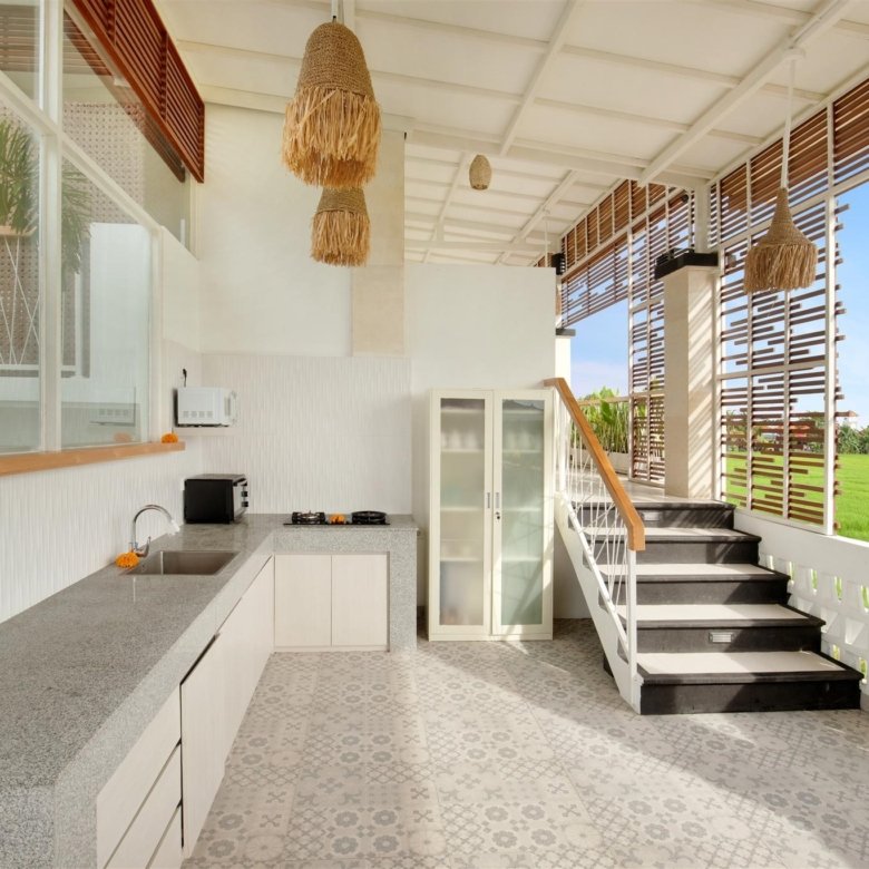 This modern resort in the prime Berawa area offers suite rooms available for monthly and yearly rent, providing a sophisticated living experience with access to a shared swimming pool. The property features a contemporary design that allows residents to enjoy the tropical atmosphere from an elevated perspective. Located in a high-end residential neighborhood, the villa is conveniently close to Berawa Beach and surrounded by a variety of popular cafes and restaurants, making it a perfect choice for those seeking comfort and style in one of Bali’s most vibrant coastal communities. While the individual units do not include a private kitchen or stove to maintain a sleek living space, guests have full access to a spacious open-air shared kitchen and dining area where they can cook and eat while enjoying the beautiful surrounding views.